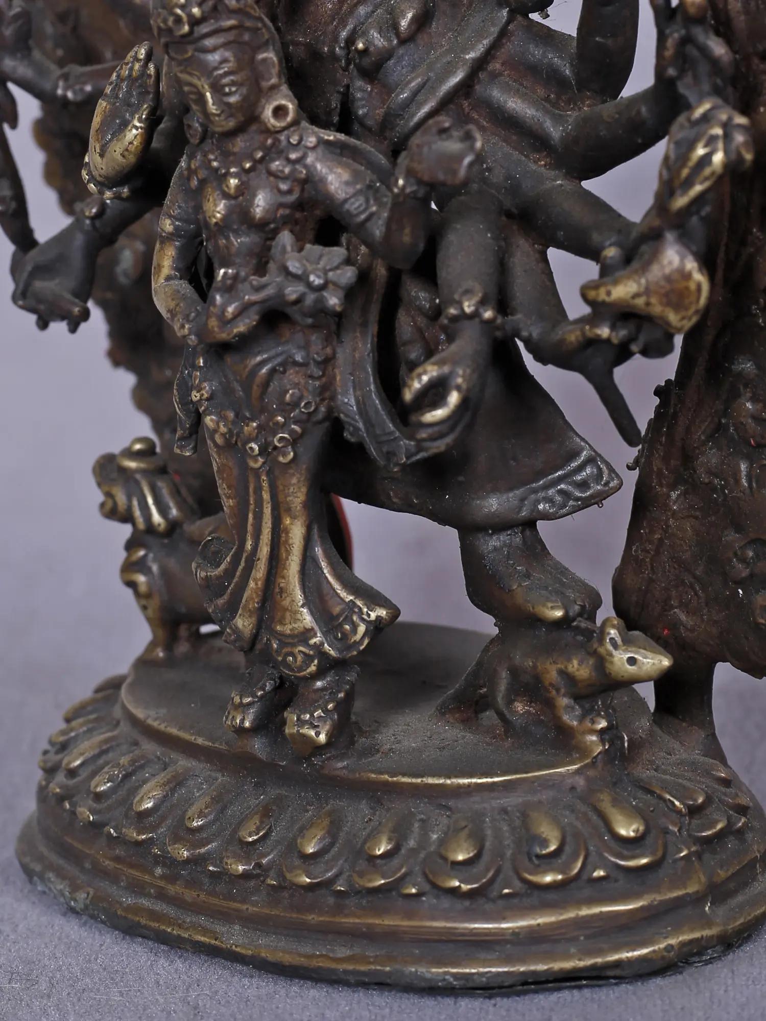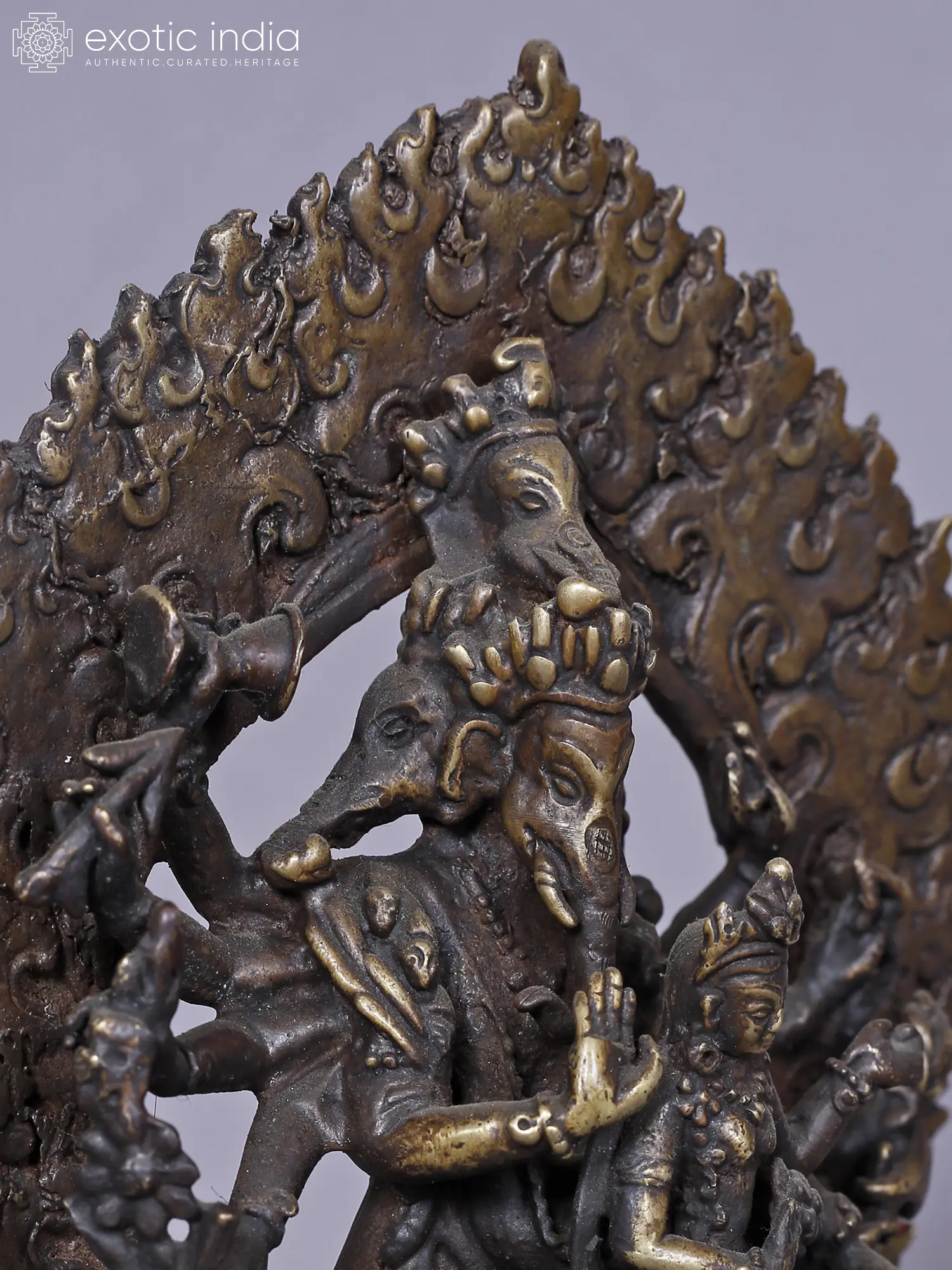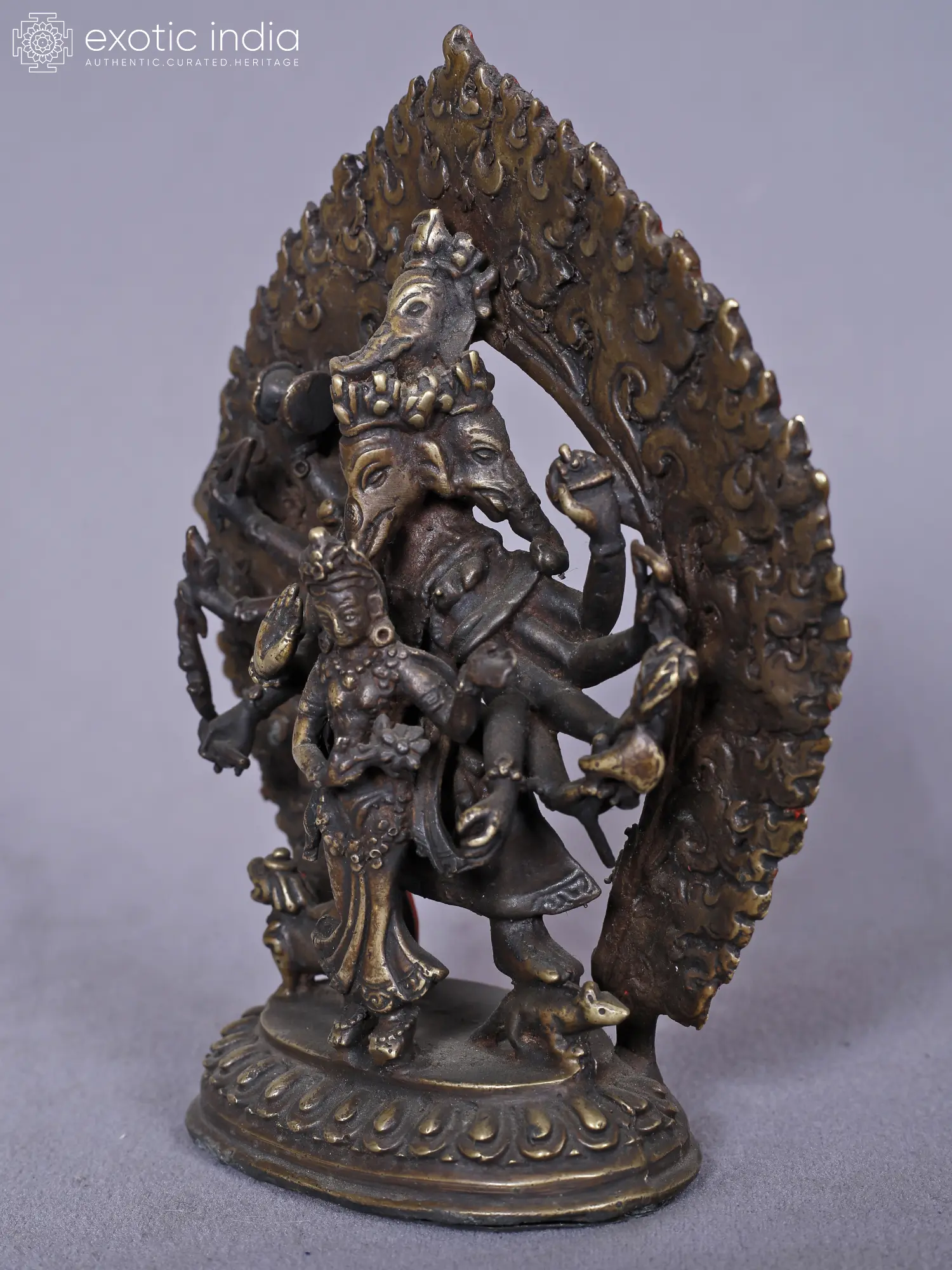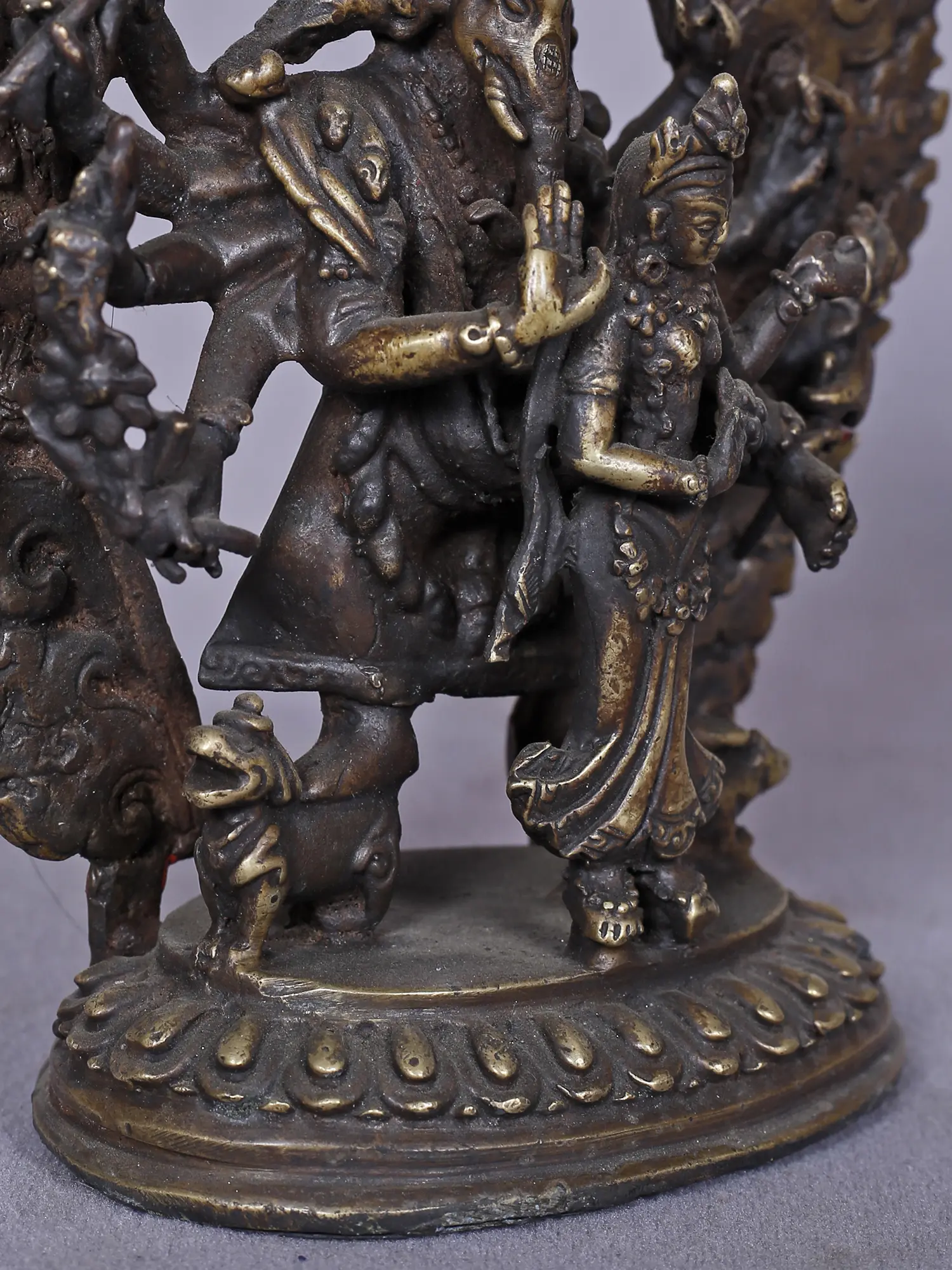 This exquisite 6-inch brass statue depicts Lord Ganesha, the revered Hindu deity of wisdom, prosperity, and remover of obstacles, in a unique and powerful form. He is shown with his consort, Goddess Siddhi, the embodiment of spiritual accomplishment and success. This isn't just a statue; it’s a portal to a rich tapestry of Hindu mythology and devotion. Ganesha, with his elephant head and endearing smile, is instantly recognizable and beloved across cultures. His presence is believed to bring blessings and good fortune to any home or space. This particular depiction showcases Ganesha with multiple arms, a symbol of his immense power and ability to handle numerous tasks simultaneously. He is the epitome of overcoming challenges and achieving one's goals, making this statue a powerful reminder of perseverance and success. The intricate detail in the casting and the deep, rich patina of the brass add to the statue's captivating beauty and aura.