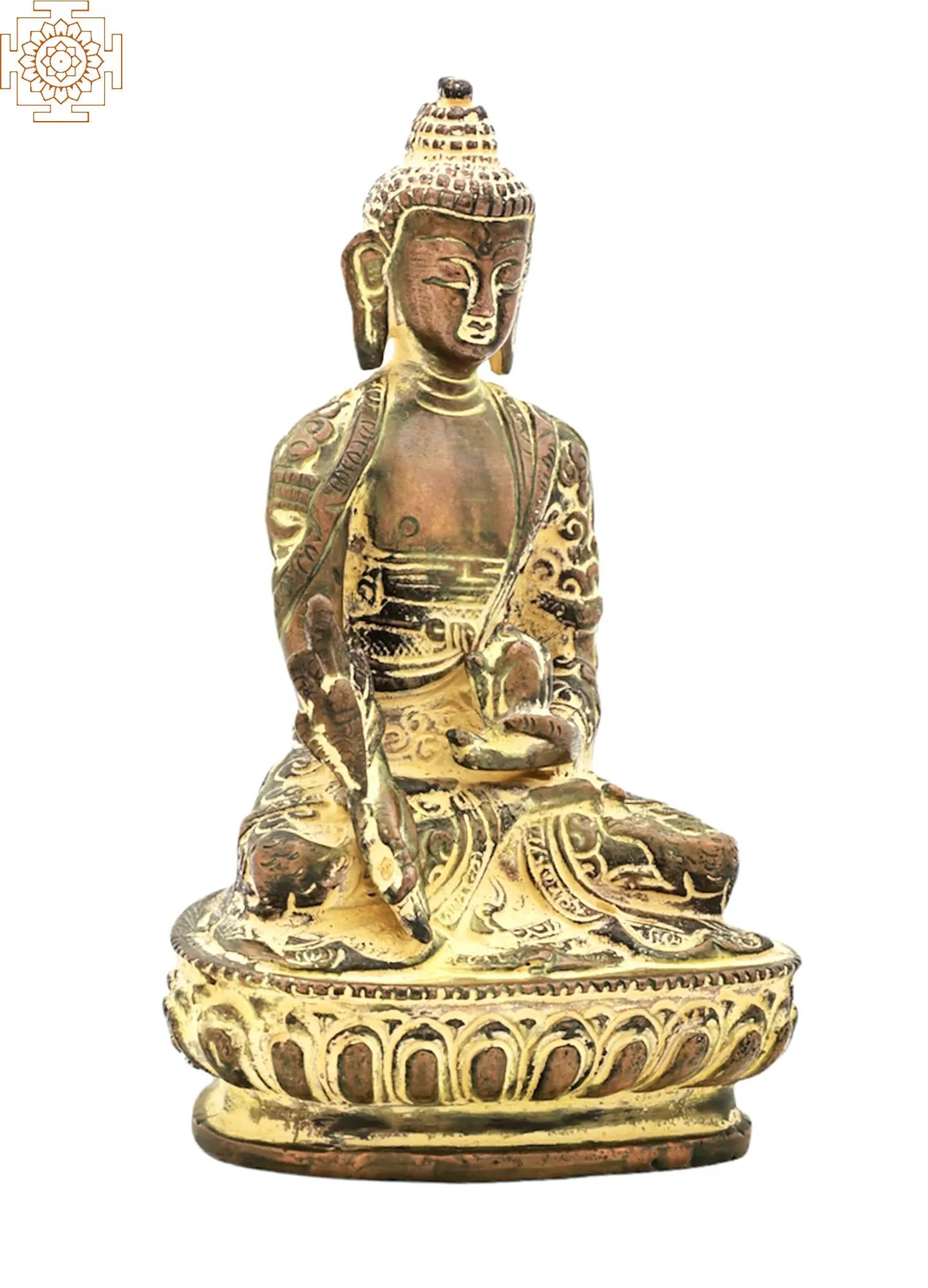 Lord Buddha, in the “Mara Vijay Mudra”, embodies triumph over temptation. With serene determination, he wards off the illusions and distractions presented by “Mara”, the embodiment of desire and fear. In this mesmerising form, Buddha, also known as “Medicine Buddha” or “Bhaisajyaguru”, holds a “Healing Jar”, radiating compassion and spiritual remedy, offering solace to those in pain. Through the “Mara Vijay Mudra”, Buddha imparts the wisdom of transcending worldly enticements and attaining a state of inner peace and enlightenment. Crafted with meticulous attention in brass, this artwork is a tribute to artistry and spirituality, enriching your space with profound energy.