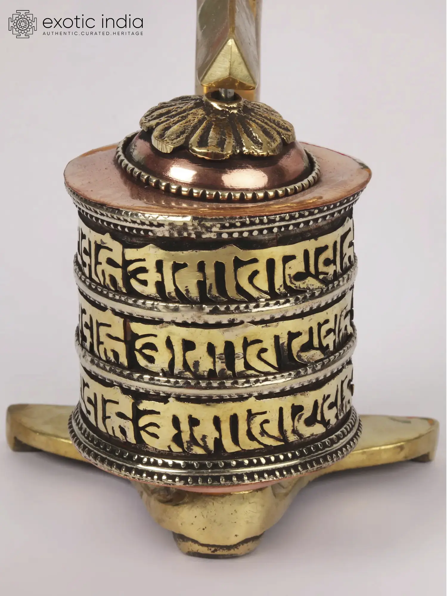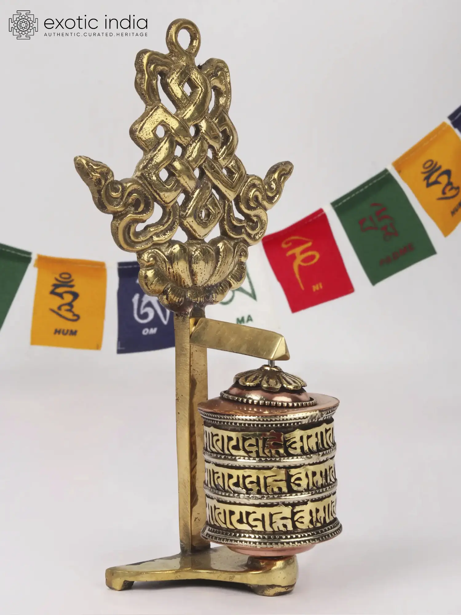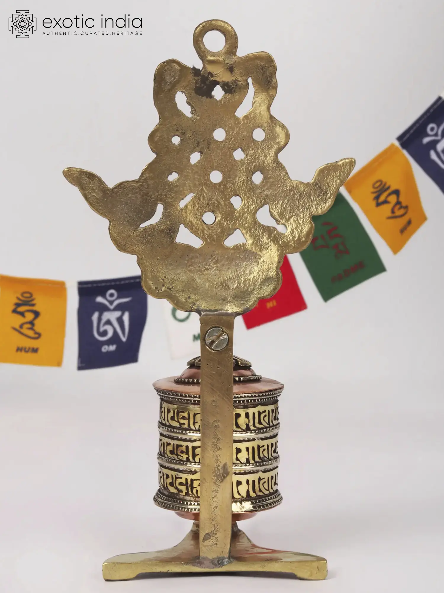 The Srivatsa is another name for the everlasting knot, a holy emblem and part of the Astamangala. The term Srivatsa denotes Shri or Lakshmi's beloved. It evokes suspicion, and its appearance beside the brass prayer wheel crafted in Nepal represents the Buddha's infinite knowledge and compassion. The three lines of Om Mani Padme Hum etched on the wheel's body enable the devotee to benefit from the mantra's knowledge and develop understanding. This prayer wheel on a stand attached to a crown of the Srivatsa placed on a lotus and surrounded with clouds is a ceremonial device designed to aid in concentration and the entrance of divine energy.
