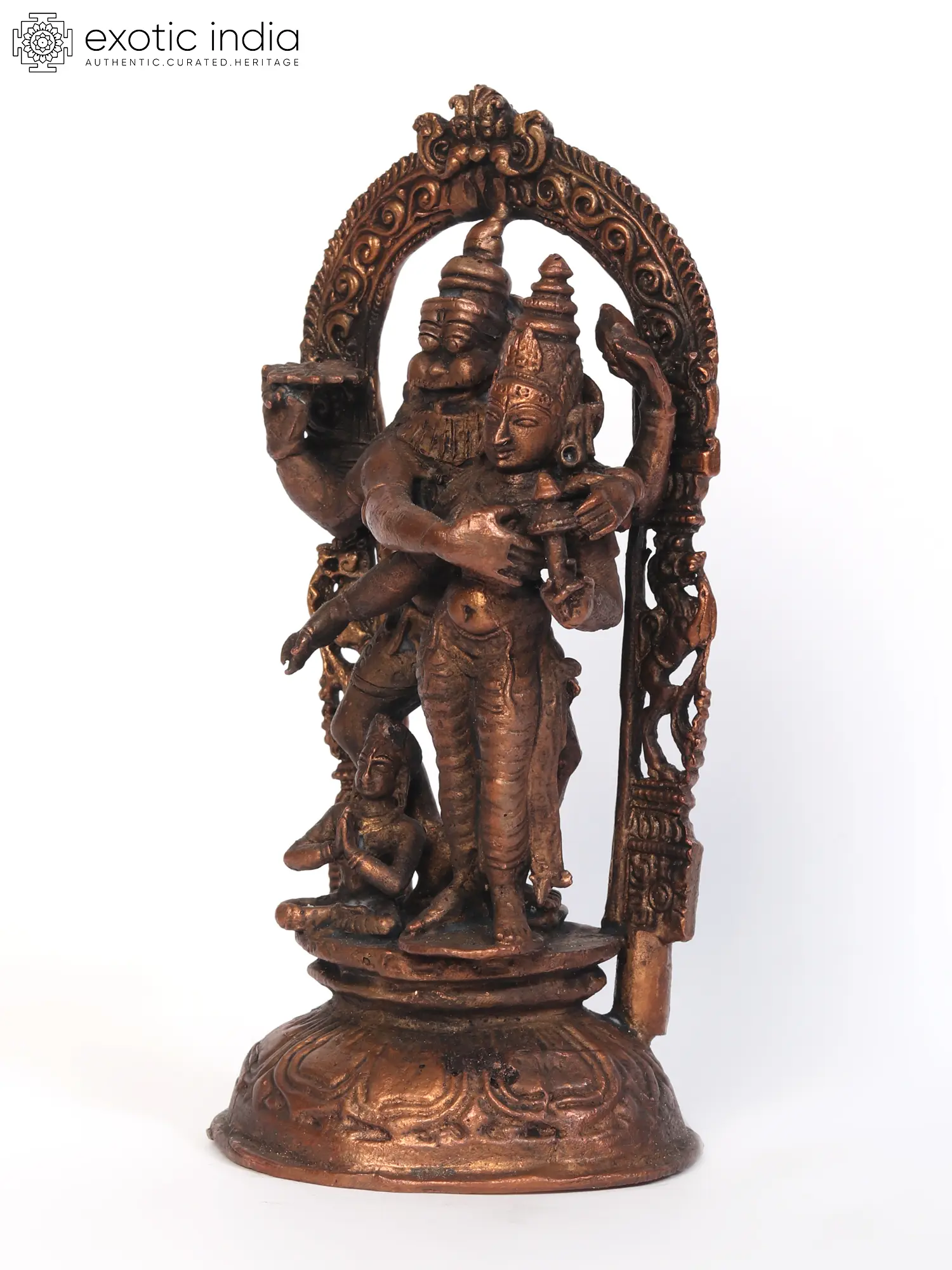 Lord Narasimha is the fiercest form of Lord Vishnu. In this form, he ripped apart Demon Hiranyakashipus's stomach and vanquished him. He did that to protect his beloved devotee Prahalad. In this Copper Standing Lord Narasimha with Goddess Lakshmi Statue is a divine portrayal of strength and prosperity and is unique because it also shows devotee Prahalad sitting near Lord Narasimha's feet. The copper metal used for crafting the statue is of fine quality and carries the sacredness of the metal. Narasimha's fierce form symbolizes divine courage and protection, while Lakshmi radiates prosperity and auspiciousness. The harmonious union of these deities in a standing pose creates a powerful visual narrative, inviting devotion and contemplation.