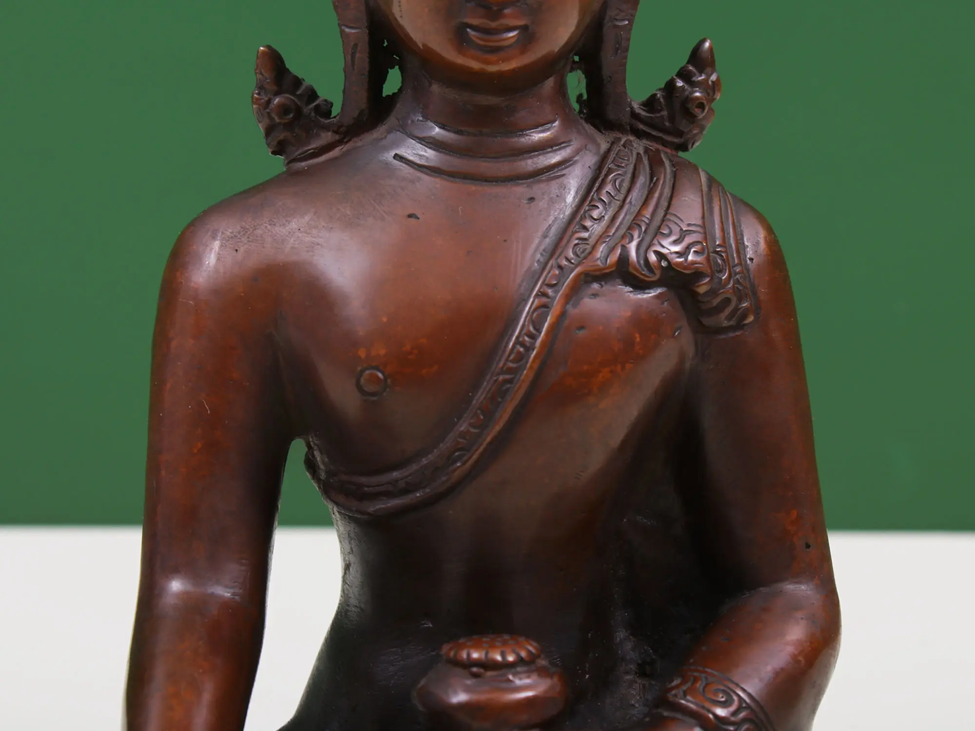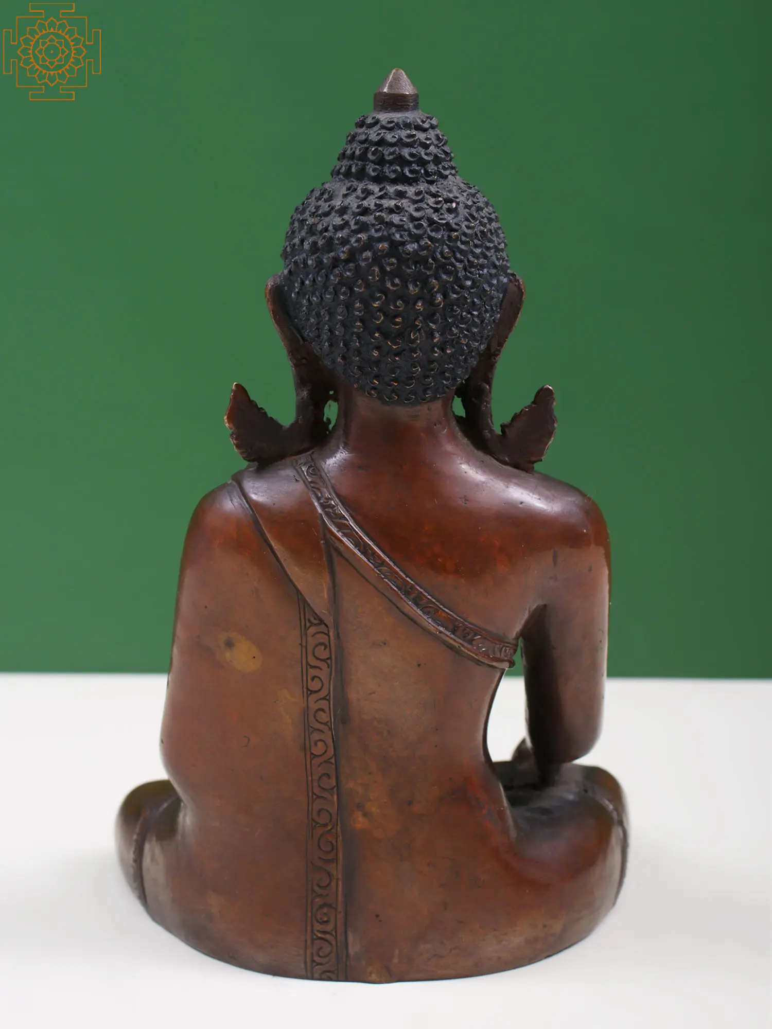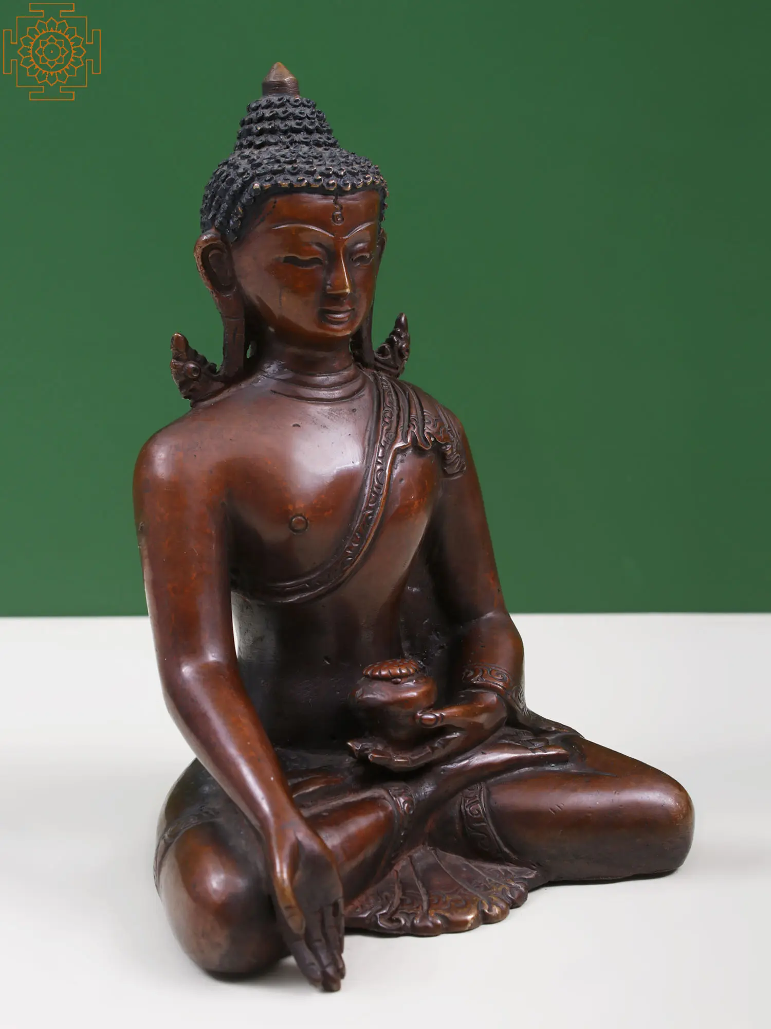 Beautified with all the divine features of the Enlightened One, this copper statue of Buddha is a balance between profound meanings and appealing aesthetics. Buddha sits in the meditative posture of Padmasana, with one hand on his lap, holding the alms’ bowl and the other in the gesture of giving or Varada Mudra. Buddha in this sublime aspect suggests that one should only take what is necessary from the world, while eternally giving back to those who are in need.