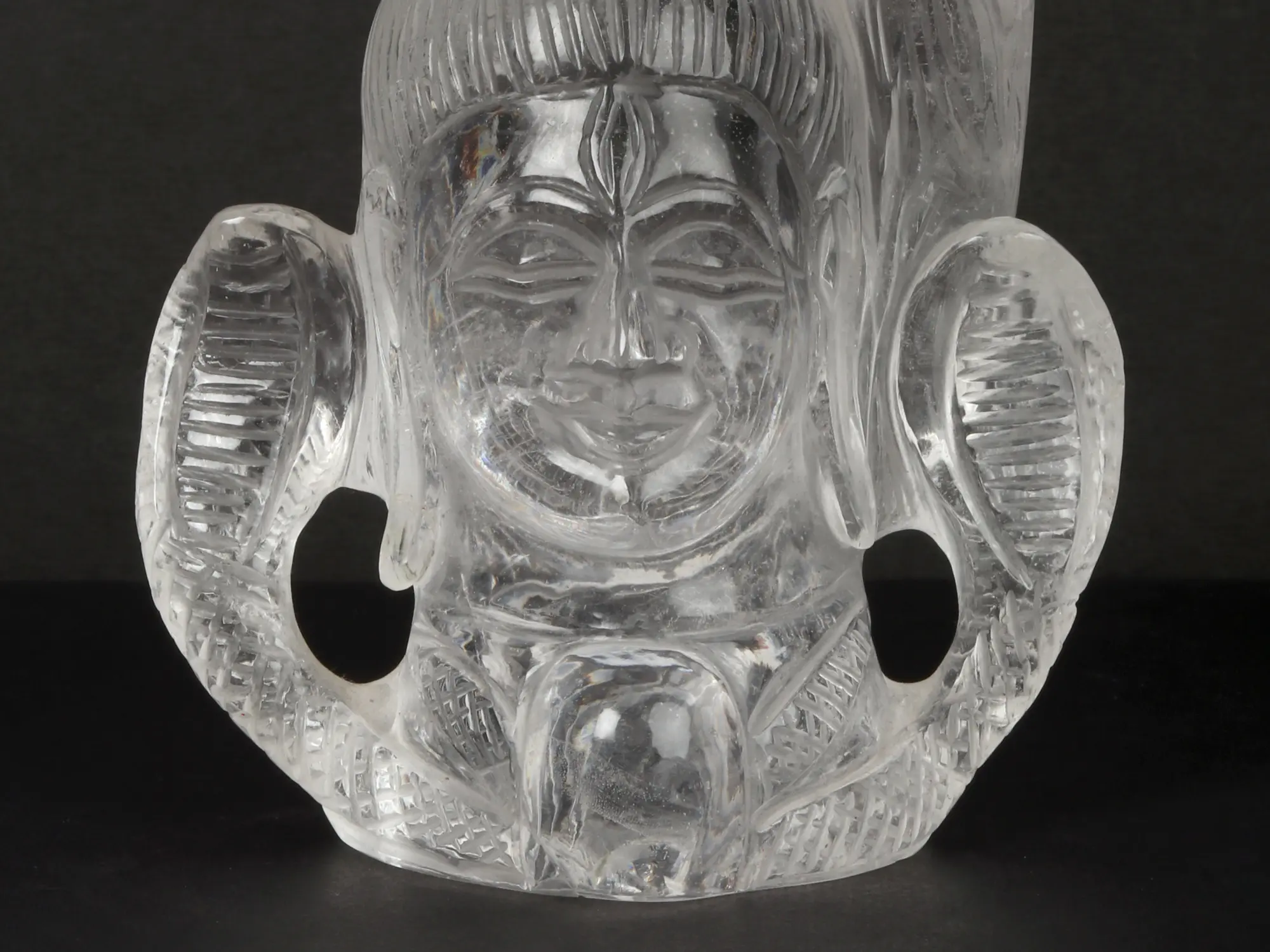 The head of Shiva, carved from crystal. White translucence adding to the mystical quality of the ascetic deity. The composure of countenance is one of deep samadhi - shut-eyed, a divine smile playing in the corners of the lips.