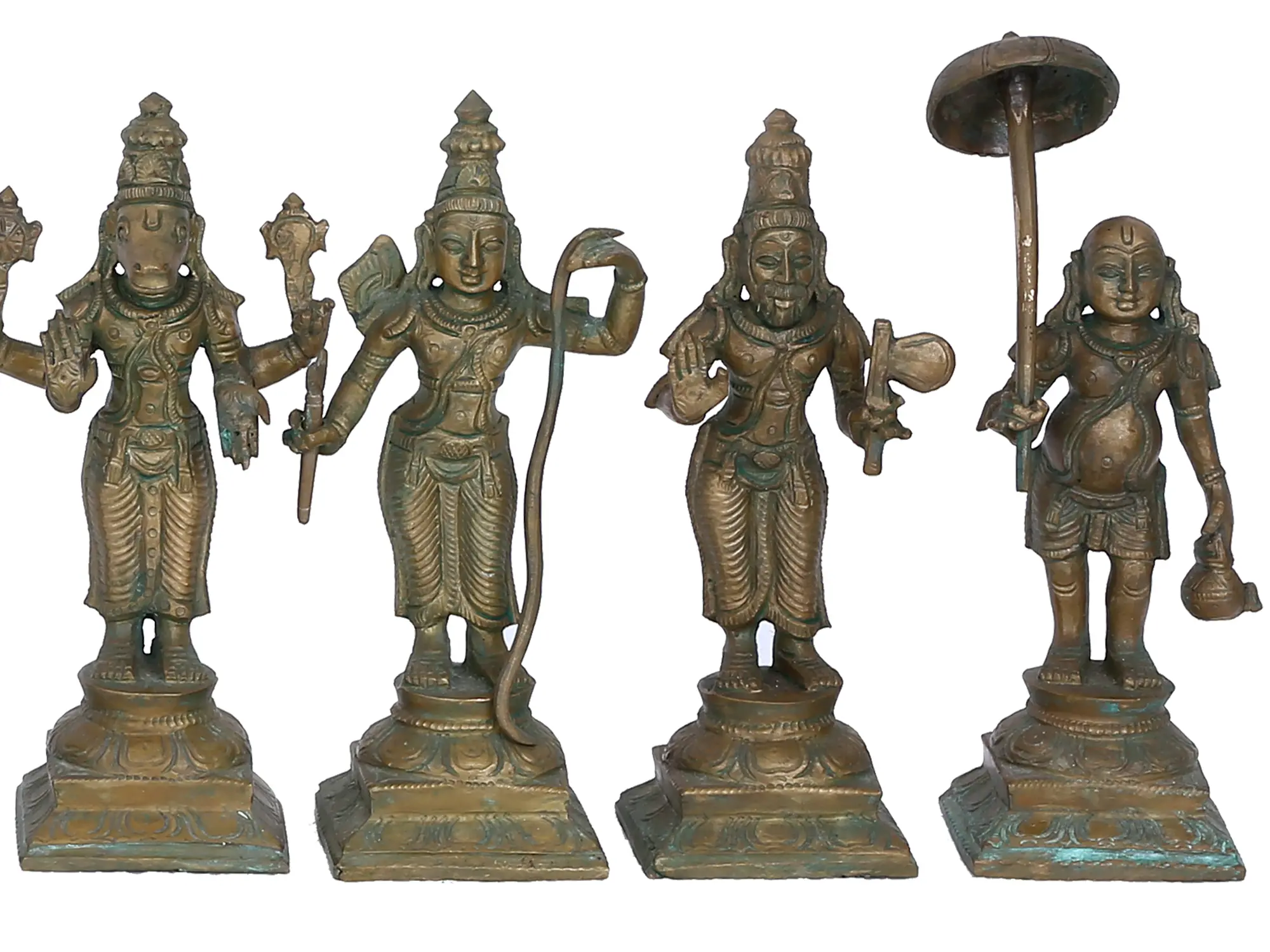 This exquisite set of ten bronze figures encapsulates the profound and cyclical nature of divinity as perceived in Hindu philosophy. Each statuette represents one of the Dashavatara, the ten primary avatars or incarnations of Lord Vishnu, the preserver and protector of the cosmos. These divine manifestations appear throughout the ages to restore dharma (righteousness), combat evil, and guide humanity. From the primordial Matsya (fish) who saved the Vedas from destruction, to the fierce Narasimha (man-lion) who protected his devotee Prahlada, and the divine Rama, the epitome of righteous kingship, each avatar embodies a specific cosmic lesson and intervention. The presence of Krishna, the beloved flutist and charioteer of the Bhagavad Gita, and Buddha, representing the ethical teachings, highlights the inclusive nature of this tradition. Finally, Kalki, the prophesied future avatar, heralds the end of the present age and the dawn of a new era. ––––––––––