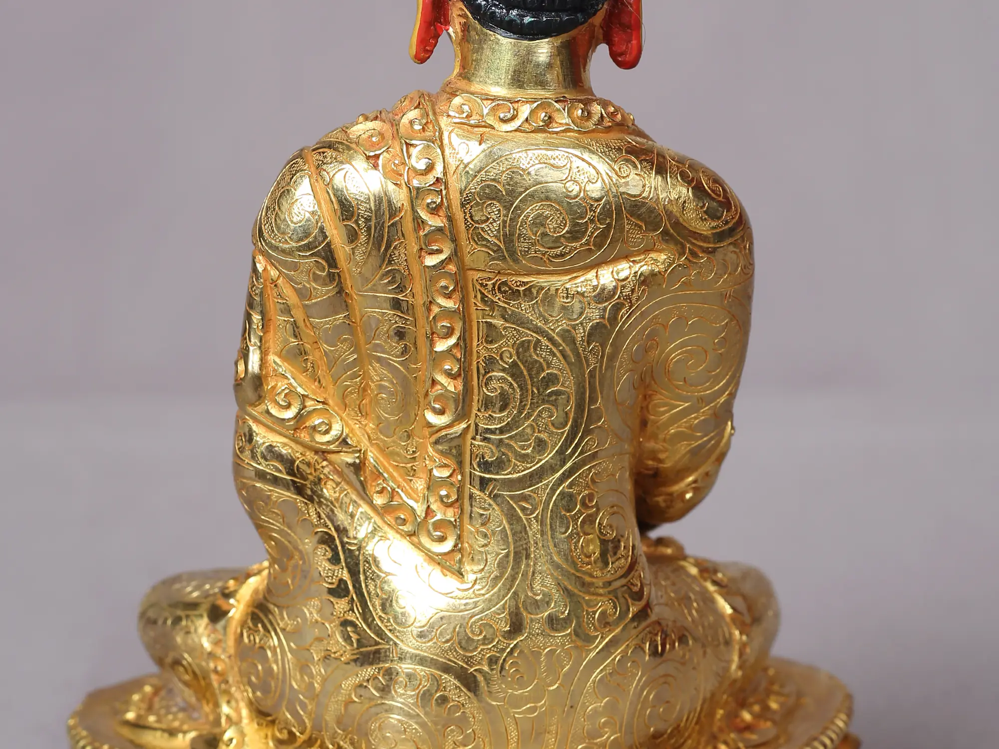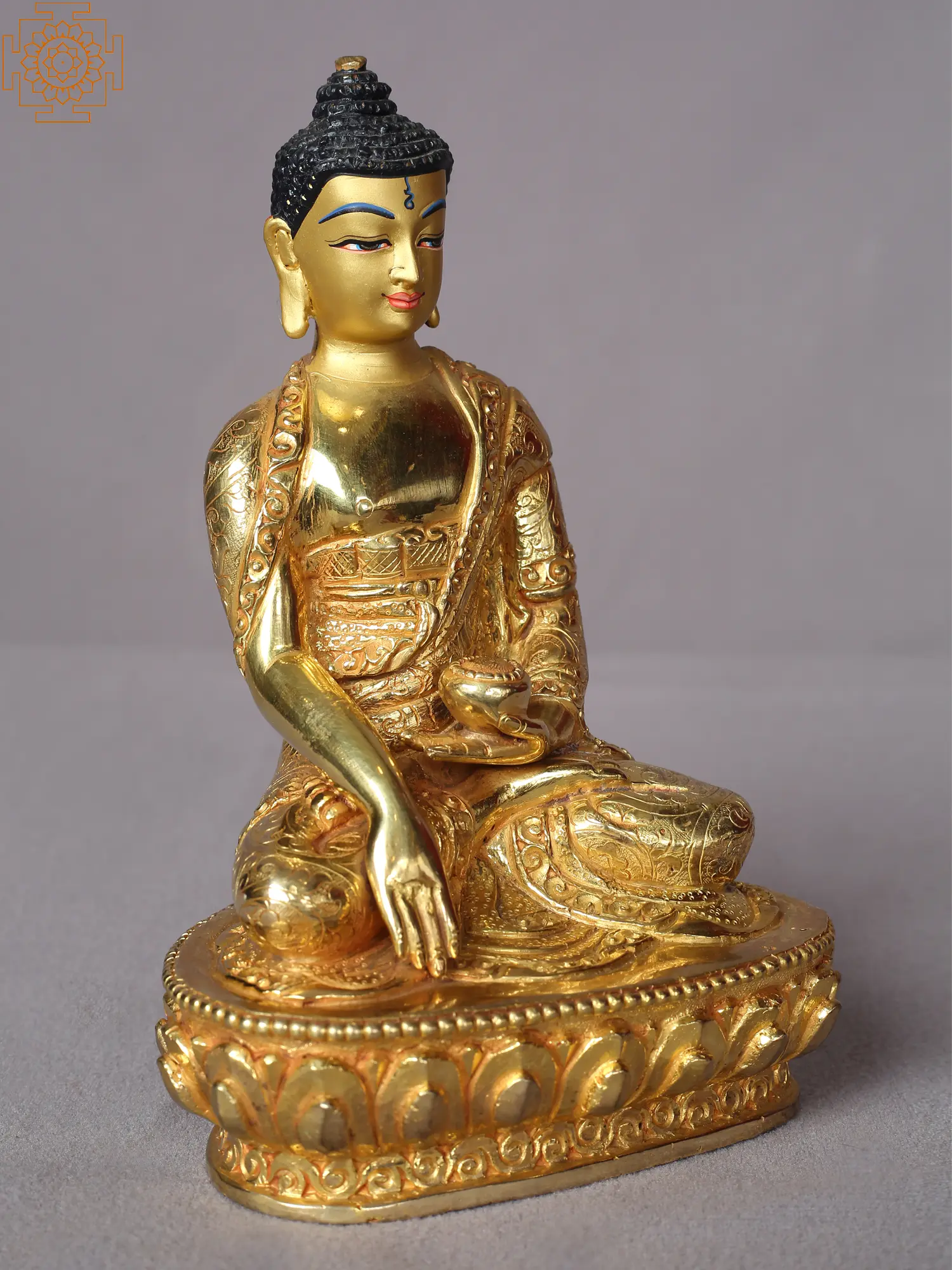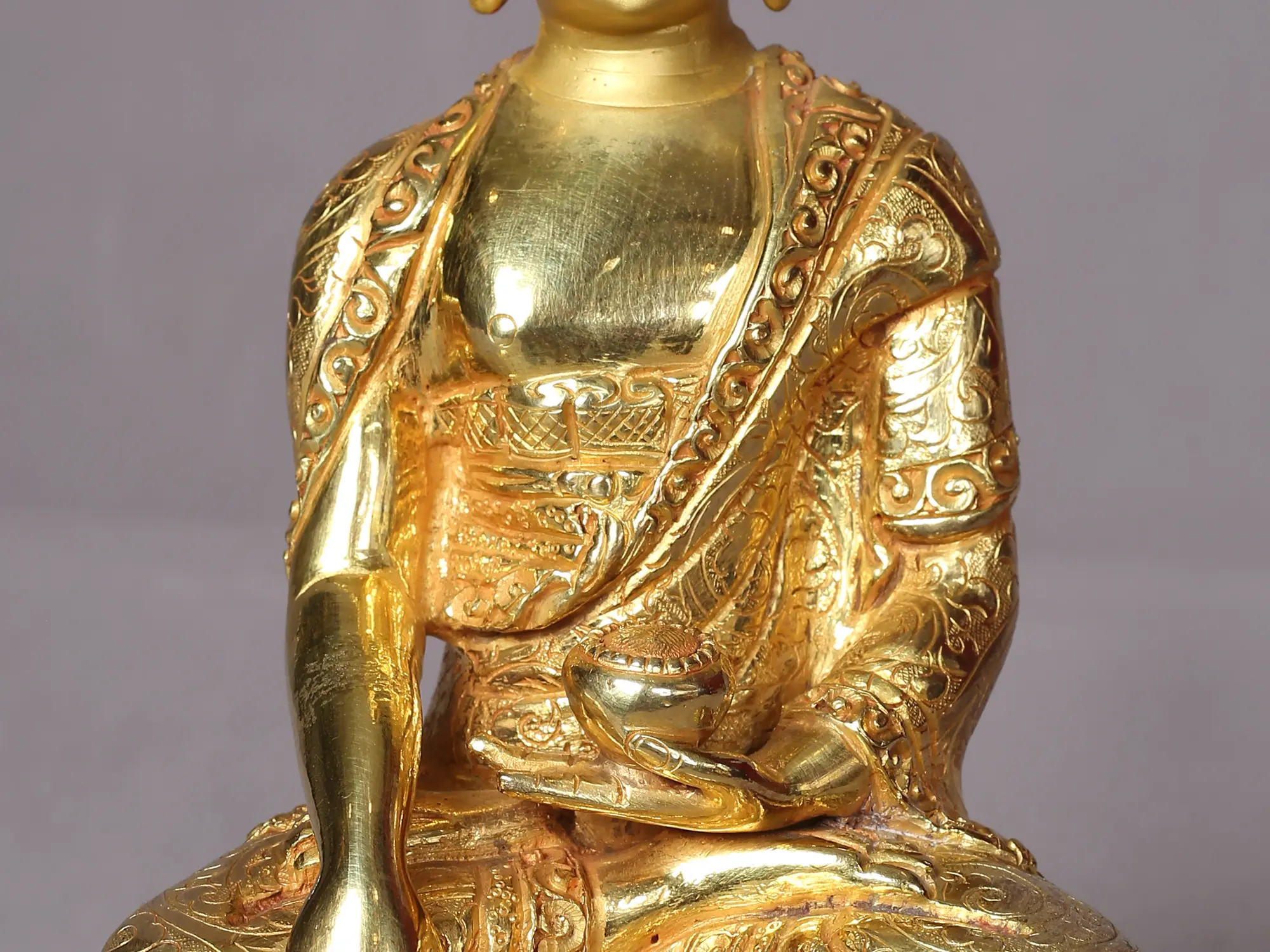 The image of ultimate enlightenment is Buddha Shakyamuni, who is shown in this Nepalese statue made of gilded copper. The sculptor has painstakingly and realistically delineated each layer of the Buddha's robe's folds. Buddha's robes bear the sign of life's beginning, the creeper, which heightens the aura of his appearance. In this gleaming statue, Buddha emphasizes abstinence and inner peace as the way to enlightenment while holding the alms'' bowl in his hand while seated in meditation.