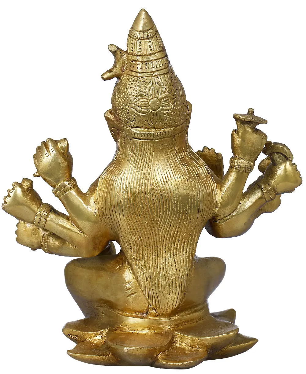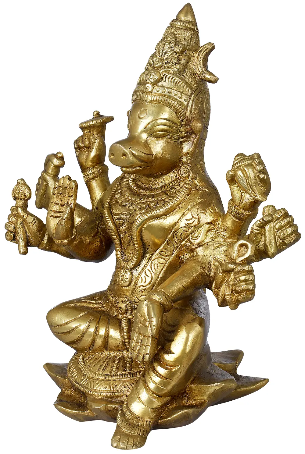 Maa Varahi, the Shakti of Vishnu's Varaha (boar) avatar, is the head of Devi Durga's heavenly army of goddesses. Hindu Tantric practitioners venerated her in order to gain power, insight, and spiritual elevation. Her powerful embodiment as an Ashtabhuja (eight-armed) Matrika (mother) is shown in this miniature brass figure. Devi Varahi is wrapped in a saree and sits on the lotus seat in Lalitasana (posture of royal ease), with a crescent moon adorning her mukuta.