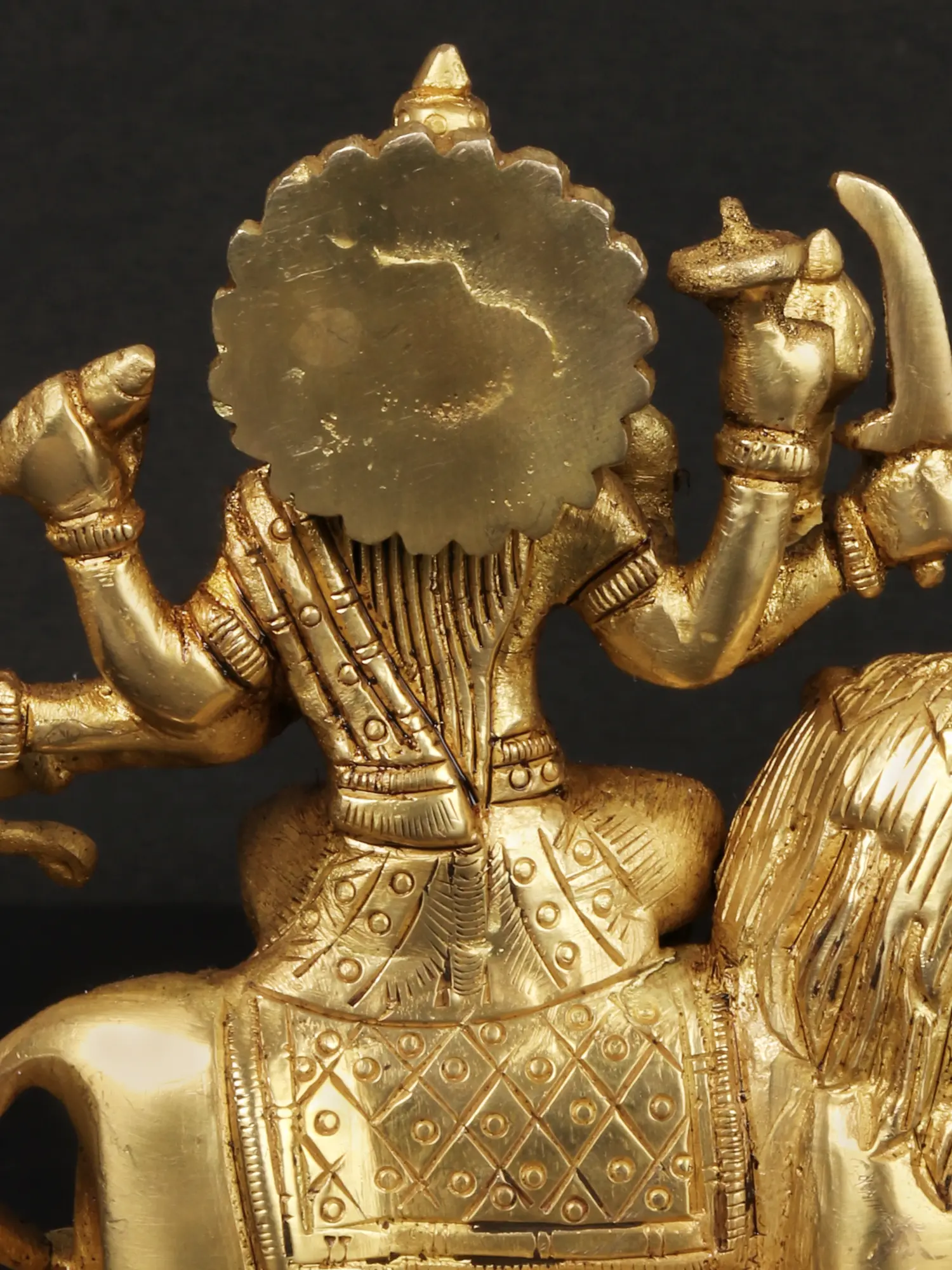 This magnificent piece is cast in high-quality brass, a metal revered for its durability, antibacterial properties, and its ability to hold intricate details. The warm, golden hue of the brass adds a touch of opulence and spiritual depth. The artist's skill is evident in the fine sculpting of Durga's serene yet resolute expression, the detailed rendering of her ornaments and attire, and the majestic portrayal of the lion's powerful form. Each curve and contour has been carefully shaped to bring this divine image to life, ensuring a piece that is both spiritually significant and artistically profound.