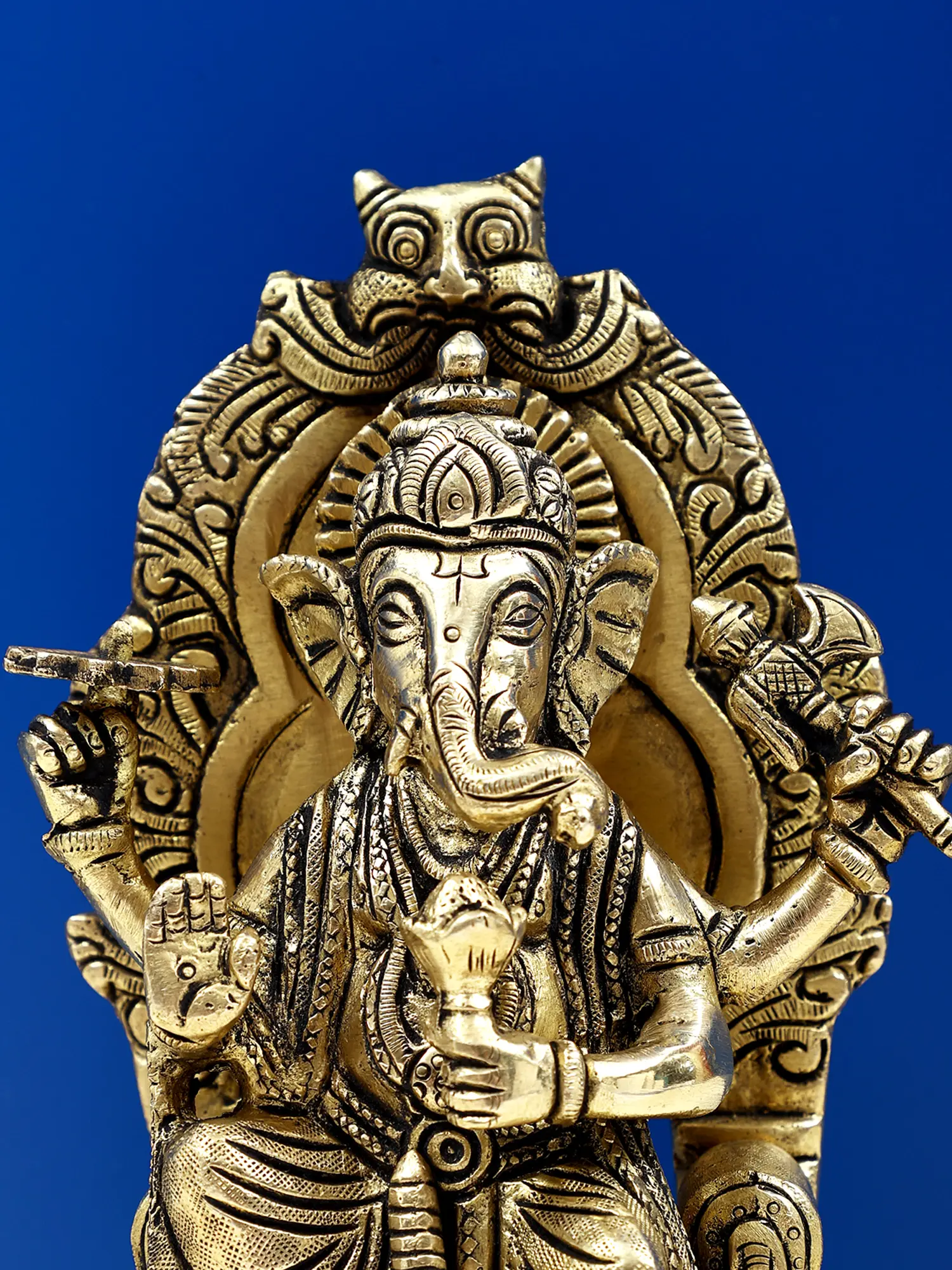 This handmade brass sculpture captures Lord Ganesha in his regal splendor, seated upon a magnificent throne. The elephant-headed deity, revered as the remover of obstacles, exudes an aura of benevolent authority. His four hands signify his multifaceted blessings, with the noose and goad representing control over desires. The modaka he holds embodies the sweetness of life's rewards. As Ganesha sits serenely, his broken tusk tells of sacrifice, while his ornate jewelry symbolizes his grandeur. Each intricately carved detail invites us to embrace life's challenges with grace, reminding us of Ganesha's enduring presence.