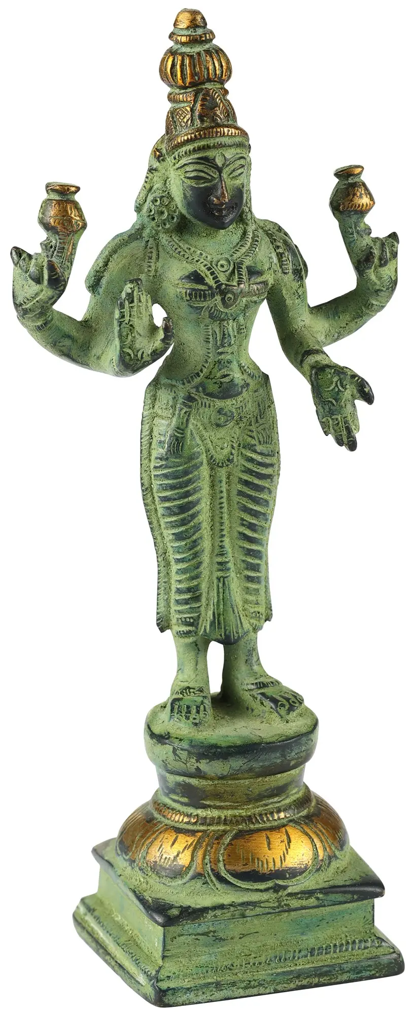 Each statue is a testament to the rich heritage of Indian craftsmanship. The intricate carvings, from the delicate adornments on her crown and jewelry to the detailed patterns on her attire and the graceful stance, reveal the artist's dedication and mastery. The use of brass, a metal deeply valued in religious and artistic traditions for its durability and aesthetic appeal, ensures that this divine representation will grace your home for generations to come. The hand-finished patina enhances the depth and texture, making each piece uniquely beautiful. This statue is not just an object of devotion but also a piece of art that tells a story of faith, tradition, and artistic excellence.