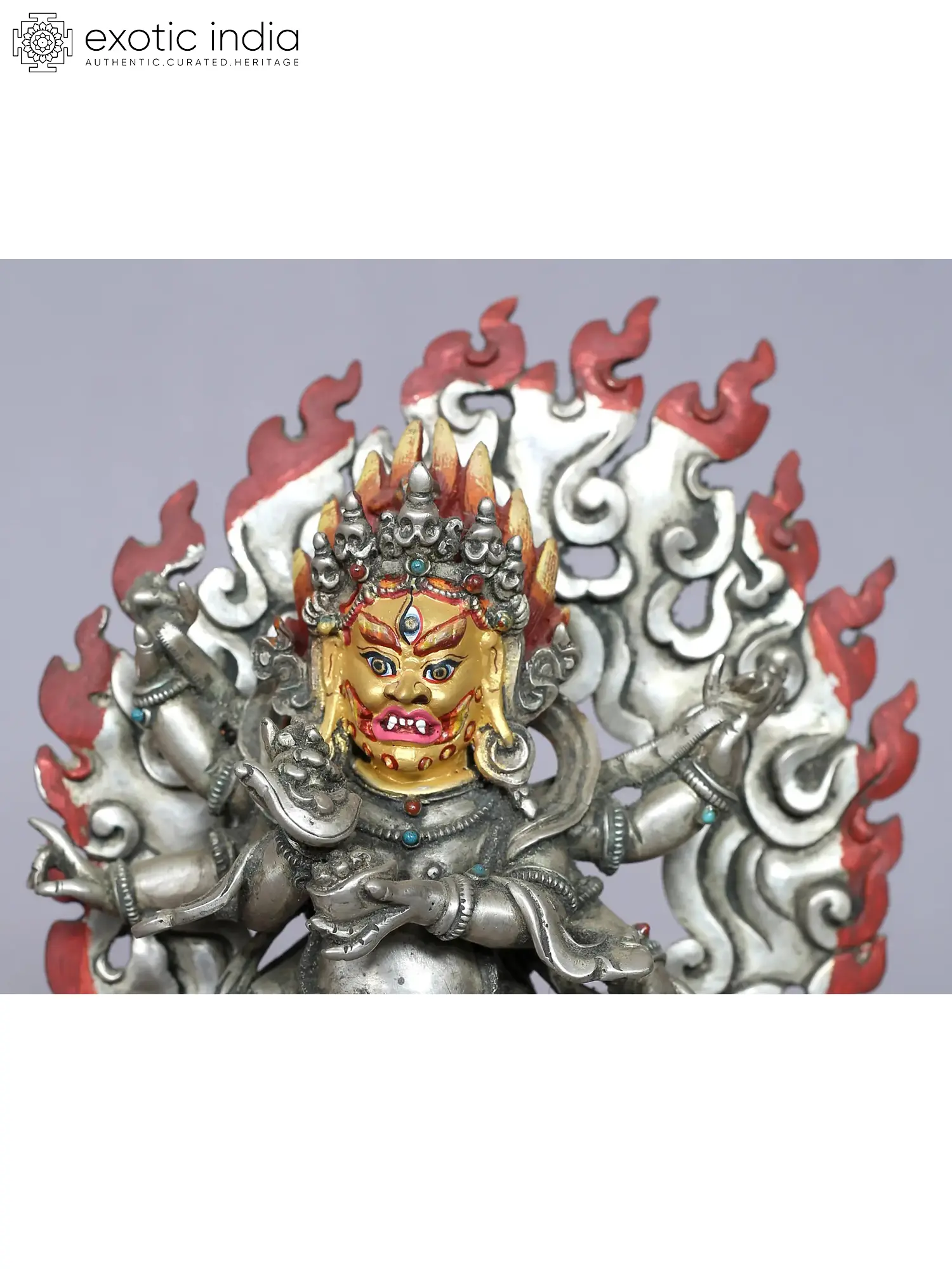 Mahakala- the Lord of Death, who has conquered destruction and time is a powerful Buddhist deity, who is worshipped as a Tantric guardian Lord and also as a manifestation of Shiva. Mahakala in this Nepalese silver statue is seen springing in a fiery aureole, trampling an animal-faced demon. Mahakala is dressed in tiger hide, serpent waistband, girdle of heads, and five-pronged crown. The use of color symbolism by Nepalese sculptors is exemplified in this artwork, where the golden hues of Mahakala’s countenance and the orange-red of flames bring a stunning effect to the composition.