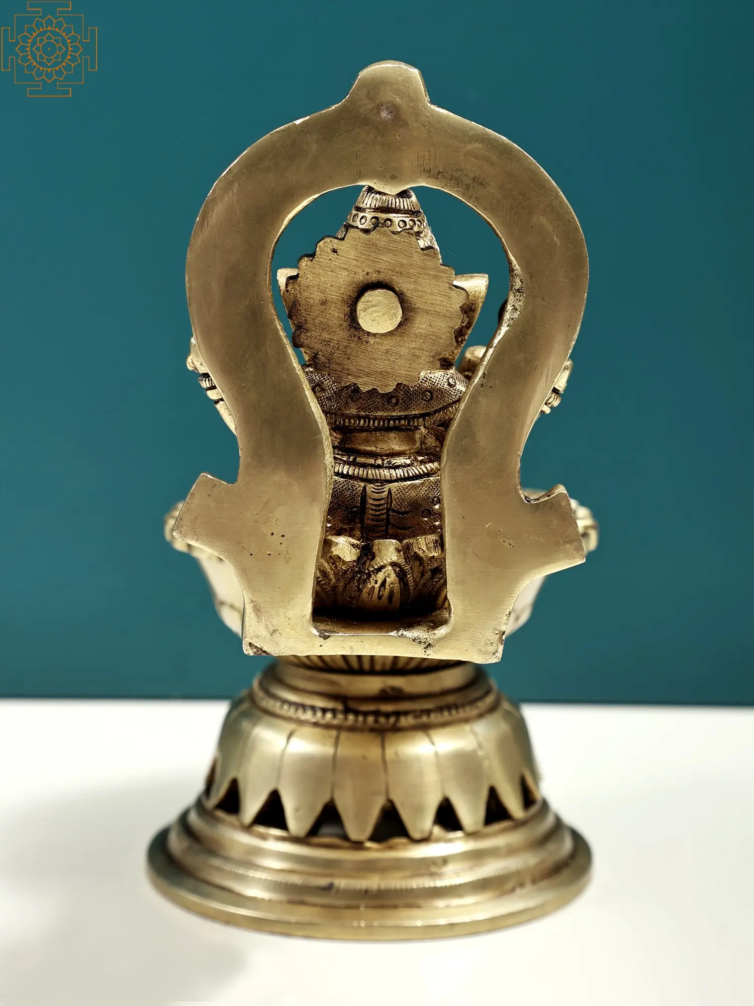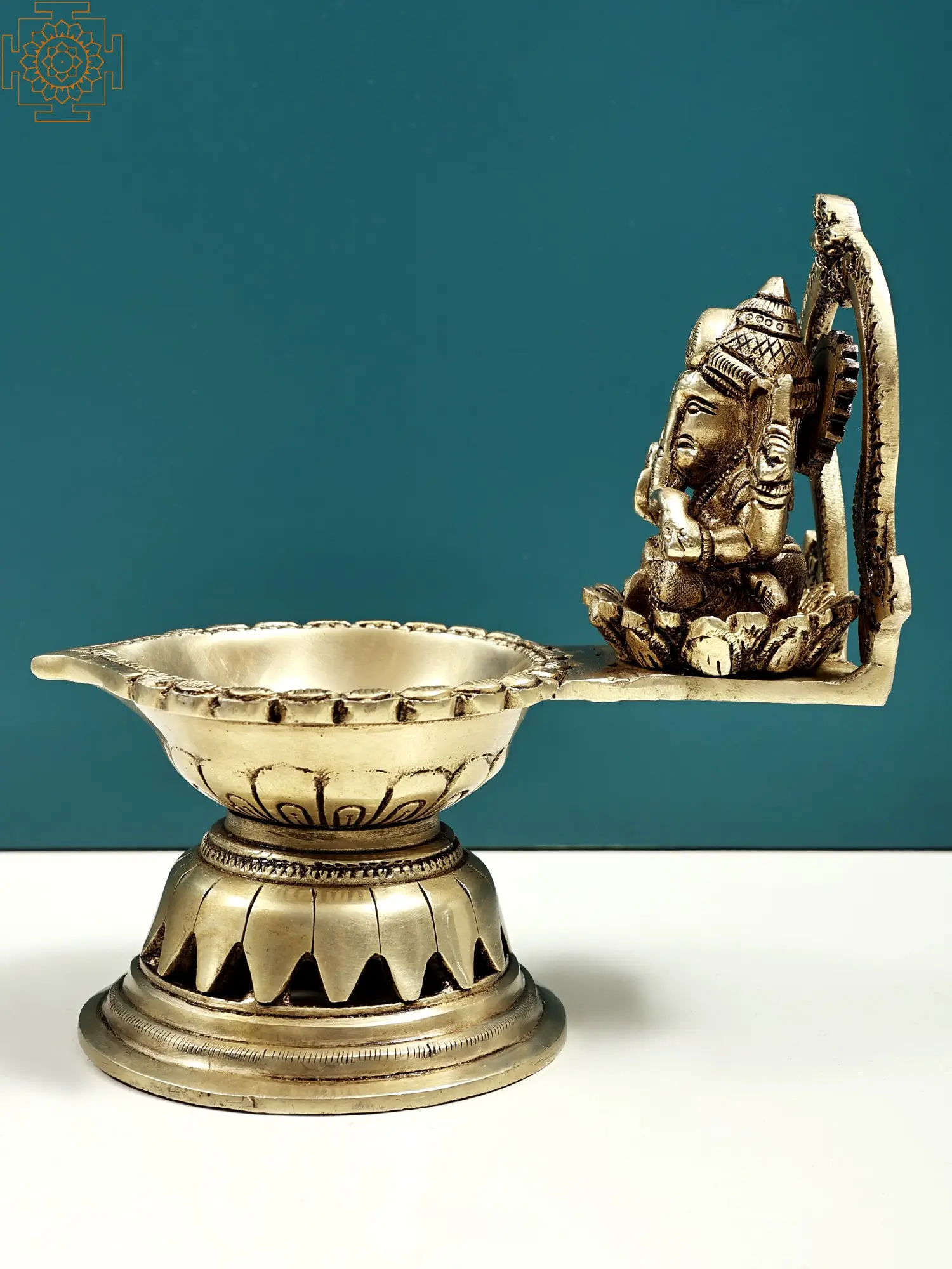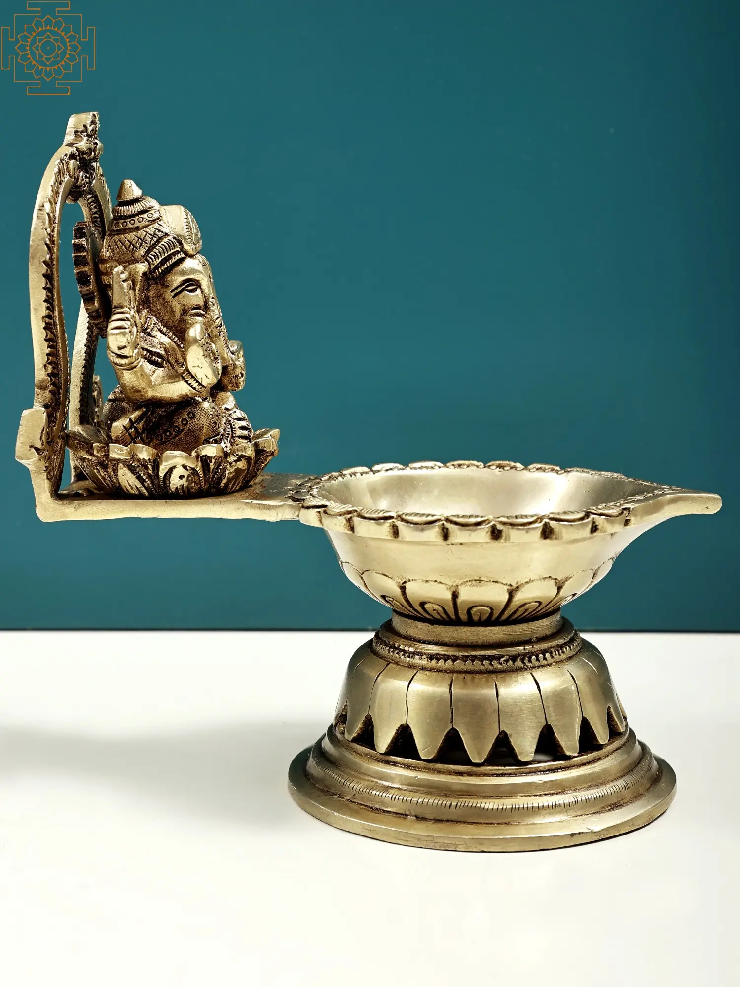 Devotees worship Lord Ganesha and ask for his blessings by lighting lamps. This stunning brass lamp, with Ganesha as the back crown, exudes both elegance and spiritual power. In this finely crafted lamp, the legendary Hindu god Ganesha sits softly under a Kirthimukha stand. It is composed of high-quality brass with a warm glow and a bright brilliance that captures the eye. The lamp's base is an inverted lotus, while the lamp's body is a blooming lotus. The divine presence of Ganesha, along with the natural energy of the lamp's light, creates a peaceful and fortunate ambiance. This lamp is a keepsake and a source of inspiration for spiritual seekers, and it is precisely proportioned to adorn any holy space or personal shrine.