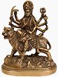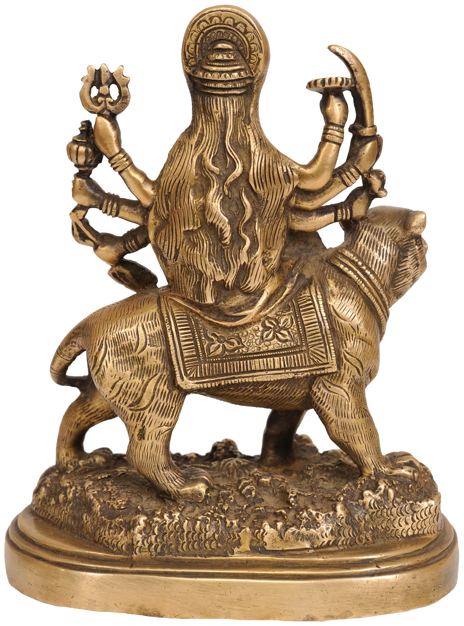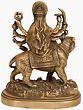 Hindus across the world venerate Maa Durga, the potent manifestation of Adi-Shakti (the supreme feminine force), as a celestial protector. Maa Durga is depicted in this small brass statue as an eight-armed Ashtabhuja roopa, sitting on her Simha, and is decked as a queen mother in a lovely saree, jewelry, and crown. Her main right hand is lifted in the Abhaya mudra, which is meant to expel fear from the devotee's heart. The enlivened statue is placed on an ovular platform that recreates the hilly terrain of Vindhyas, the earthly abode of Simhavahini Maa Durga.