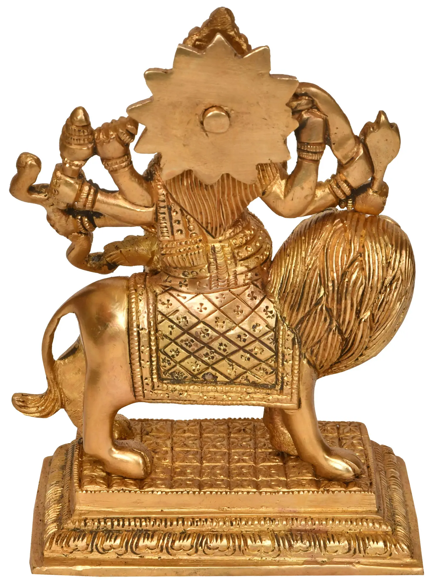 Enthroned on her Simha, Simhavahini Maa Durga in this glistening brass statue is the great protectress of the universe. Devi Durga holds her potent weapons in her eight arms, each symbolizing her benevolent powers that guard her devotees against negative forces. The icon is placed on a rectangular pedestal and is embellished with fine details, which lend it a divinely beautiful aura.