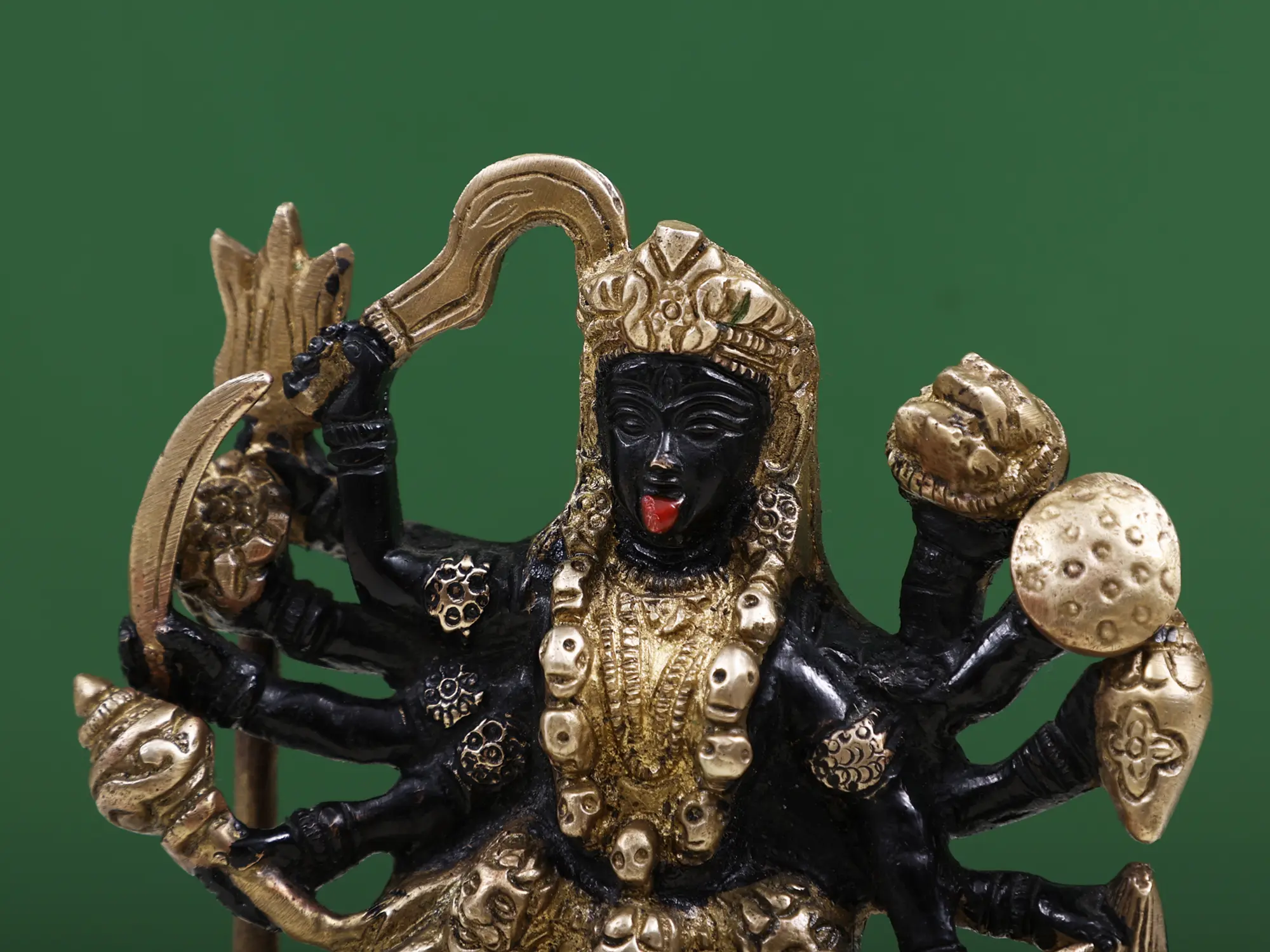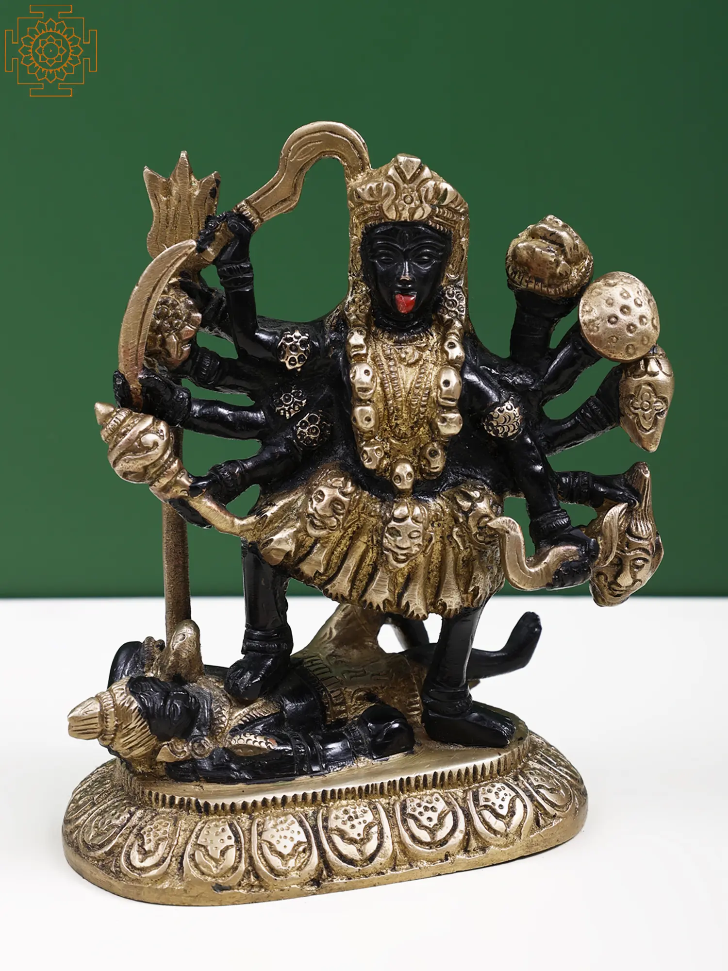 Placed on a lotus pedestal in this small brass statue, is the great goddess Kali, in her potent mighty Dashabhuja or ten-armed form, a distinctive form associated with the pinnacle of her powers. Devi holds various divine weapons in her hands, and is adorned with queenly ornaments and a celestial serenity on her visage.