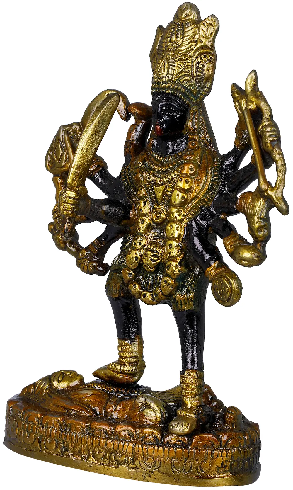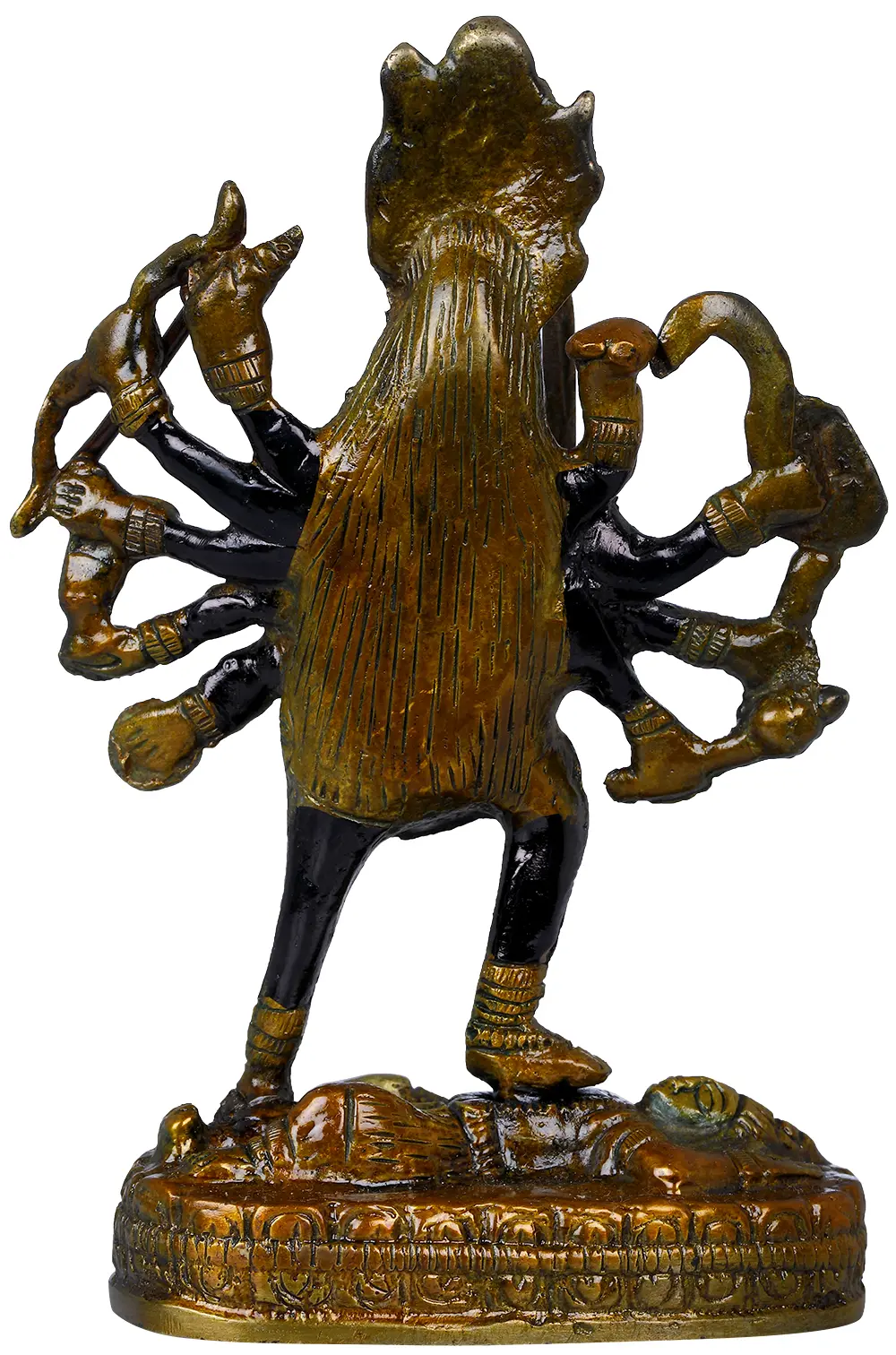 Dashabhuja or ten-armed goddess Kali is a mighty roopa of the great mother goddess, evoked for protection from all evils and the guarding gaze of Maa Kali. This brass statue appears divine with the presence of goddess Kali, who stands in a valiant posture, firmly holding her ayudha (weapons), adorned magnificently.