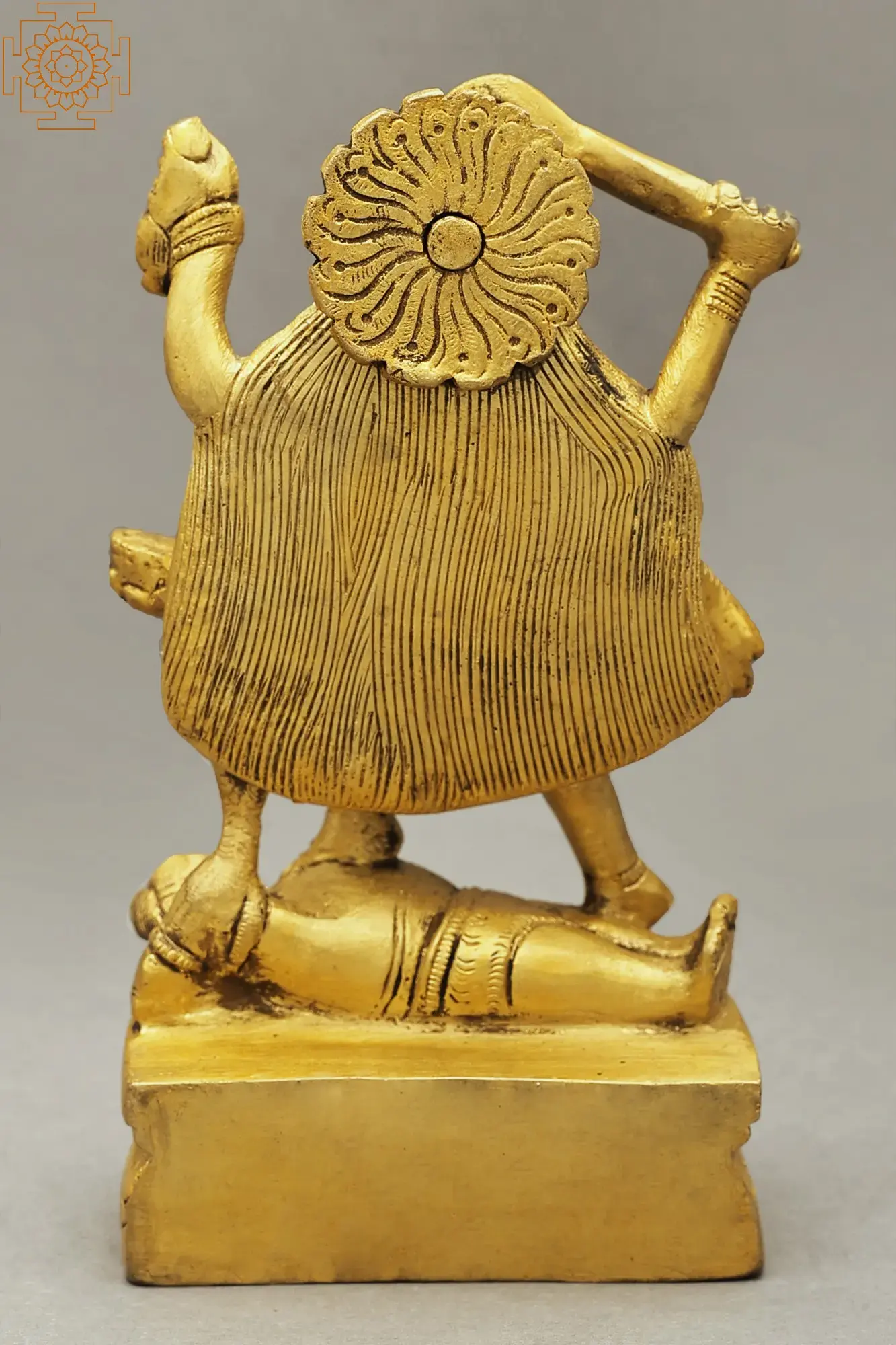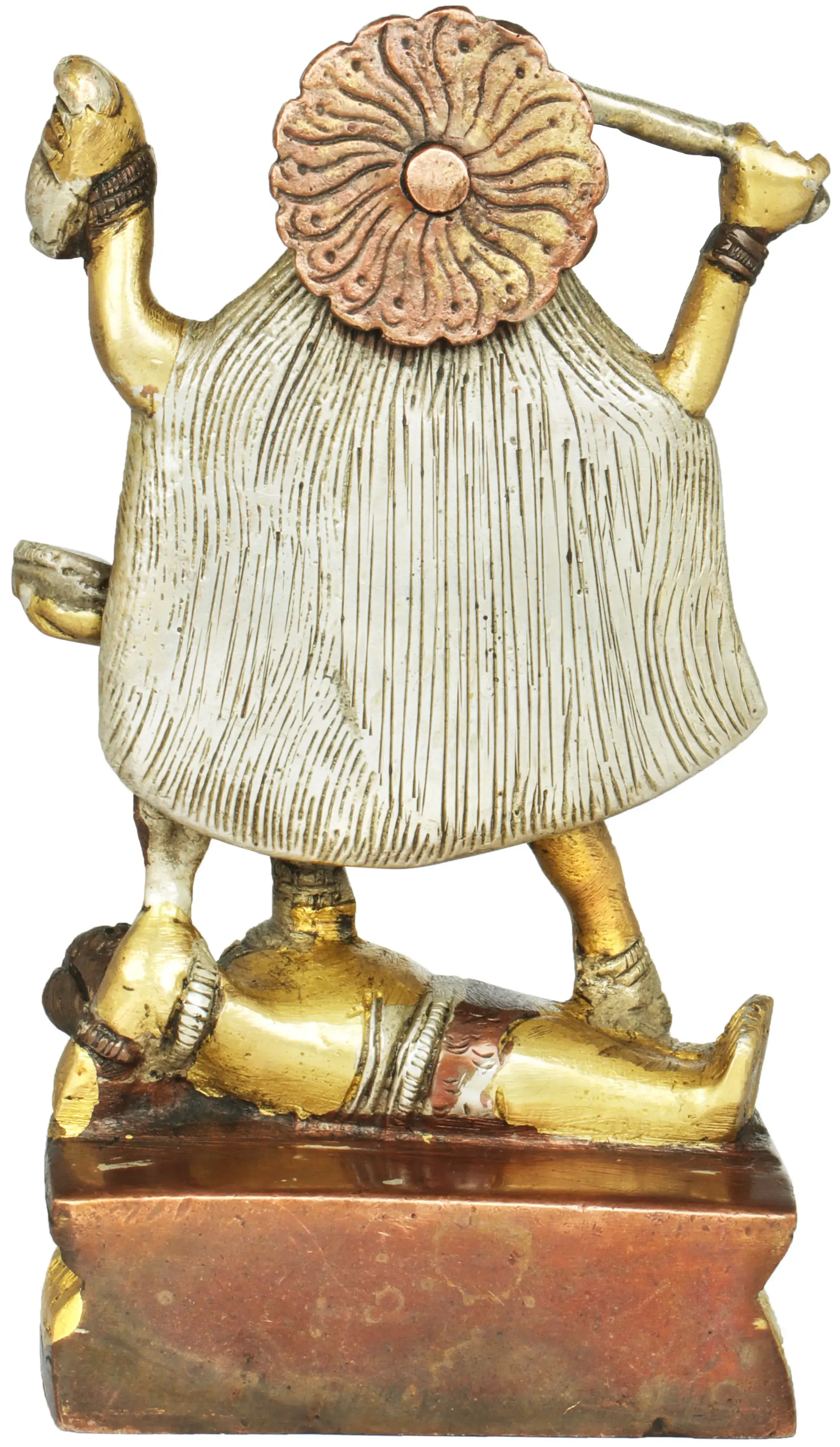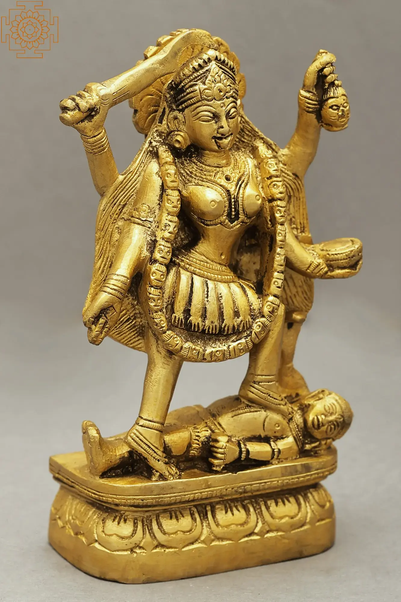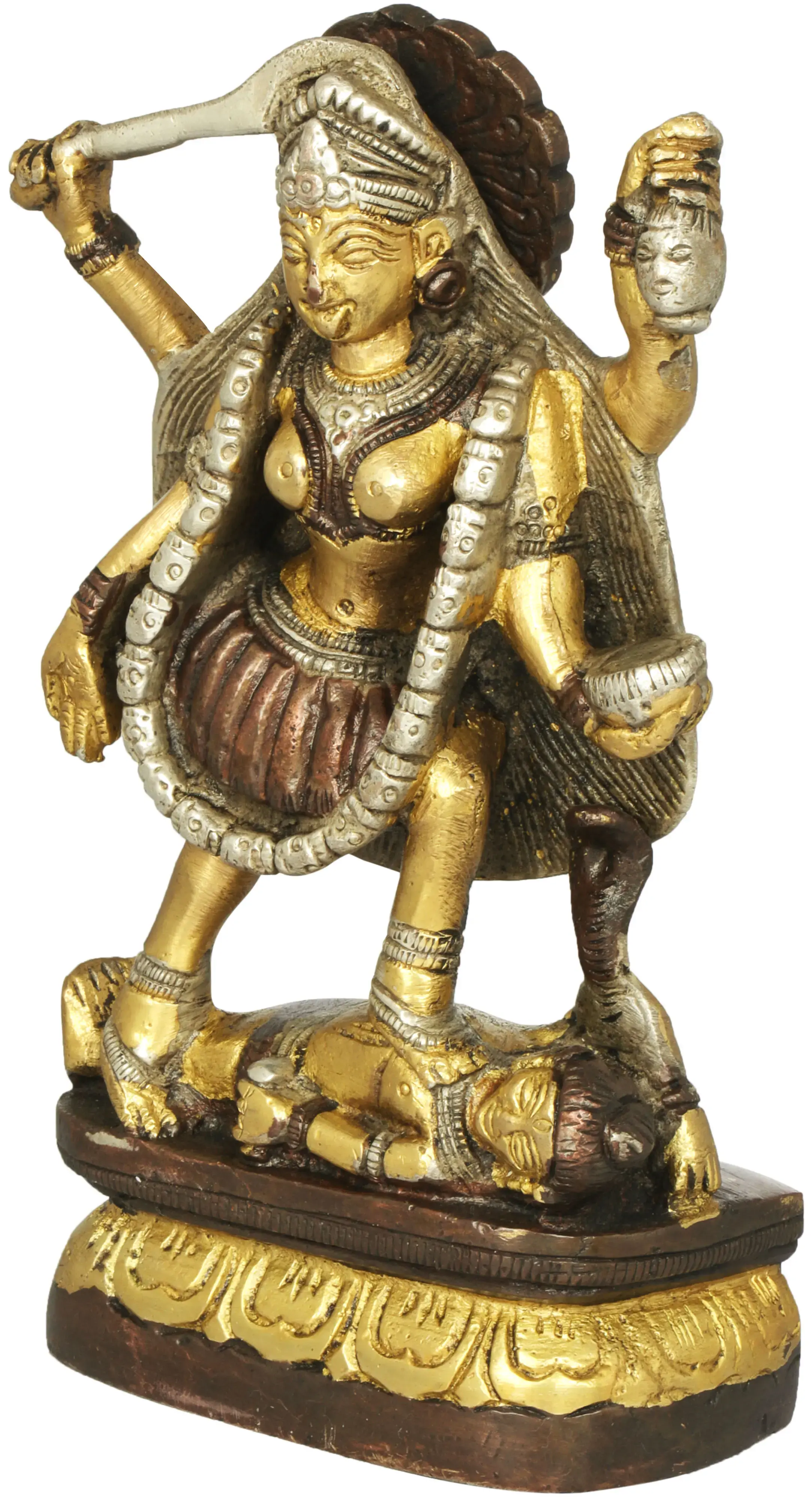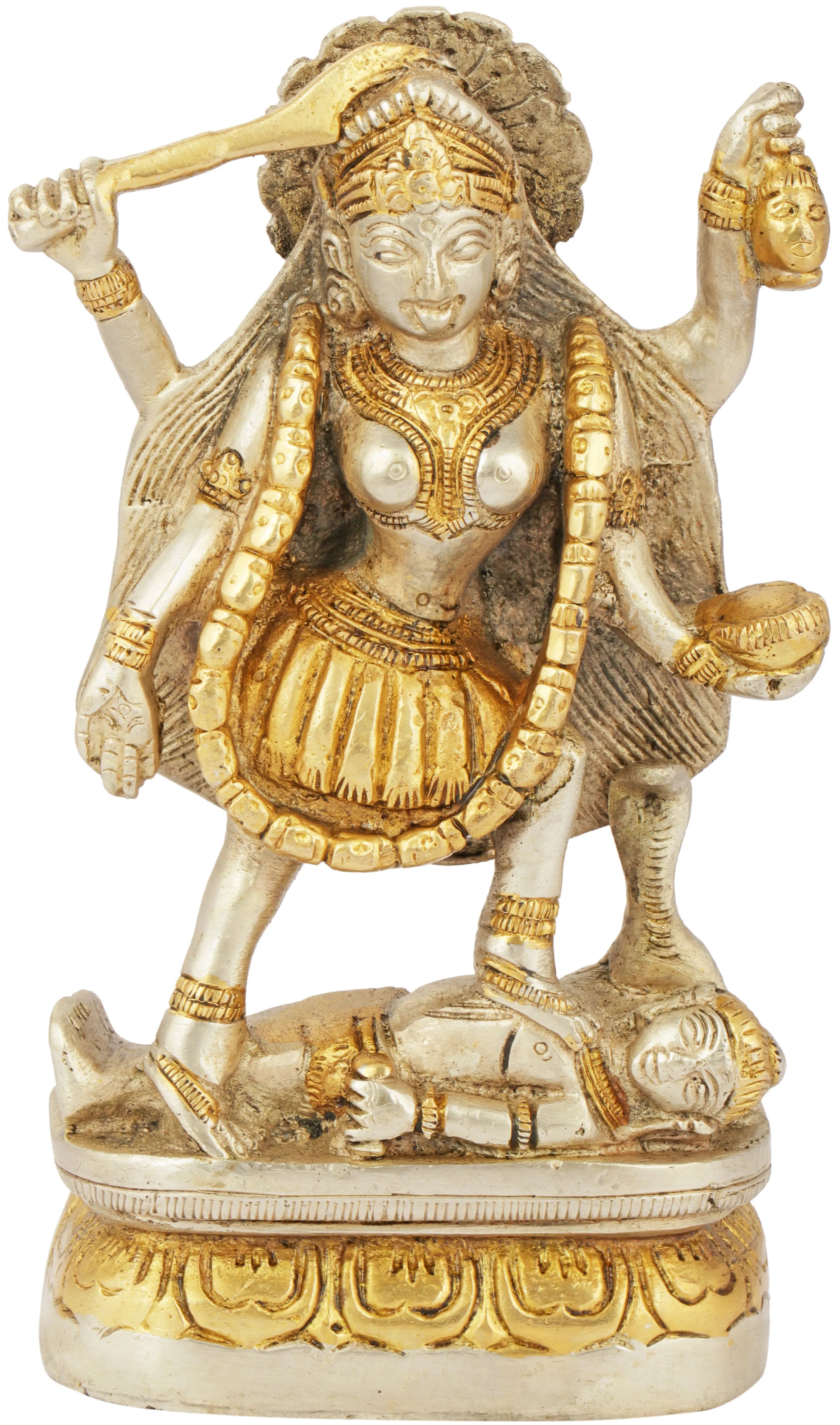 Placed on an ovular Padmasana or lotus pedestal, goddess Kali in her Chaturbhuja roopa exudes a divine aura in this small brass statue. Devi is standing in a dynamic posture, with her open hair forming a majestic backdrop for her form adorned with awe-inspiring ornaments such as a Mundamala and a girdle of severed hands. Even though in her warring form, goddess Kali smiles benevolently, as a sign of her ever-auspicious protection, extended to all living beings.