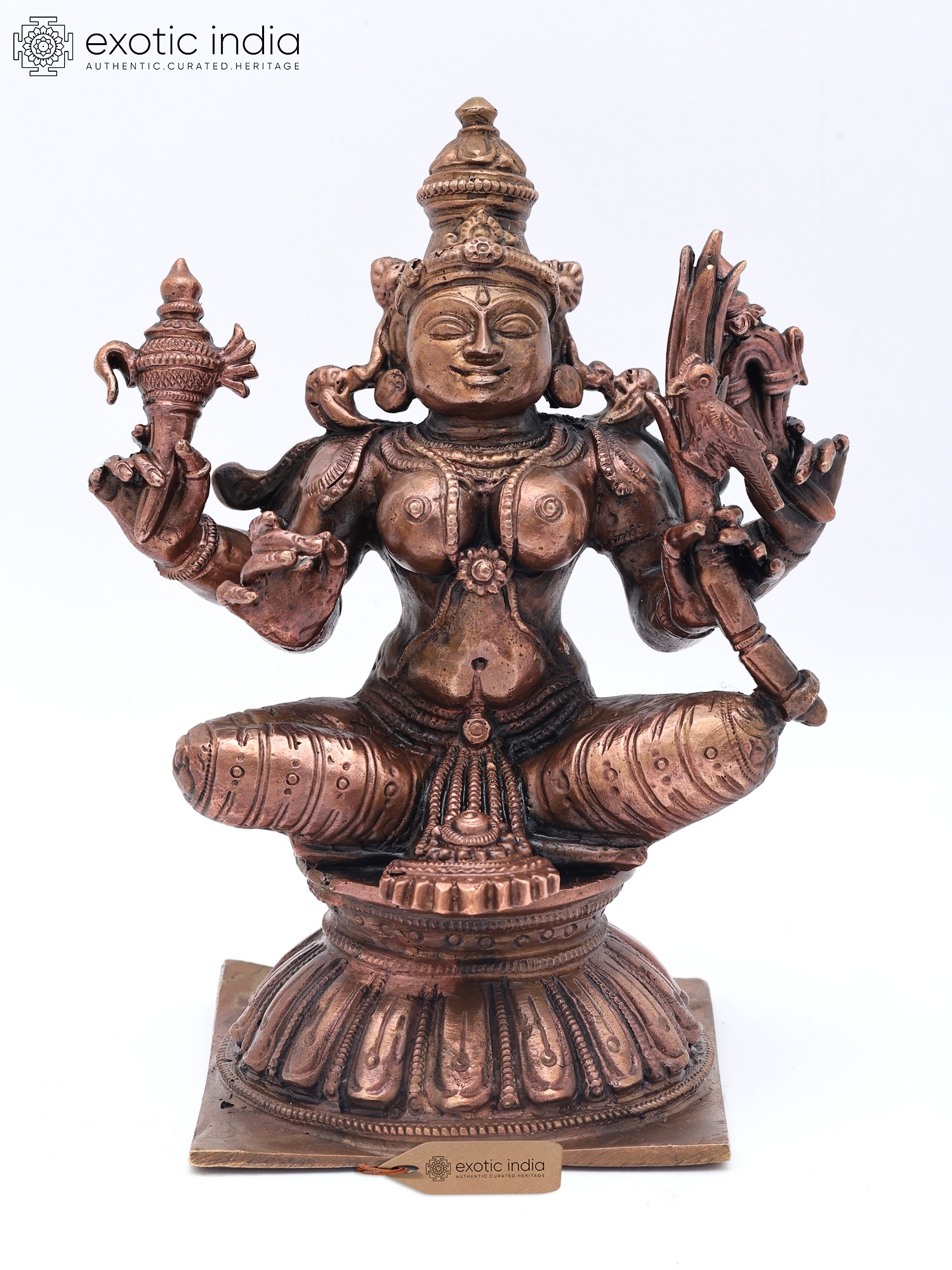This divine form, seated gracefully on an ornate lotus pedestal, captivates with its serene countenance and multi-armed pose. Each hand is adorned with distinctive symbolic objects, hinting at the goddess's multifaceted powers and blessings. The intricate detailing of the jewelry, the flowing garments, and the delicate facial features are all rendered with remarkable precision, bringing the divine presence to life. Its compact yet impactful size, standing at approximately 6.5 inches tall, ensures it commands attention without overwhelming its surroundings.