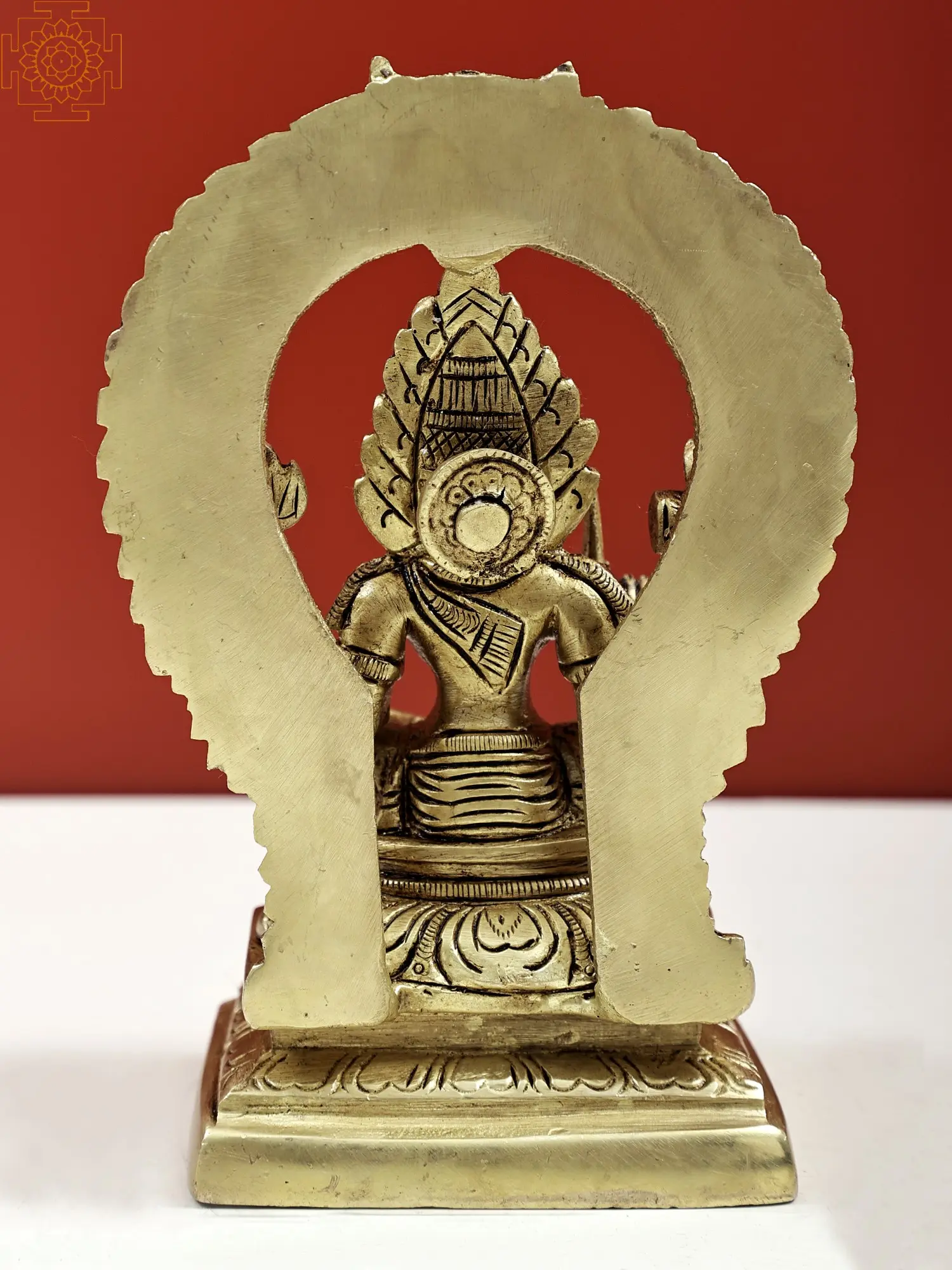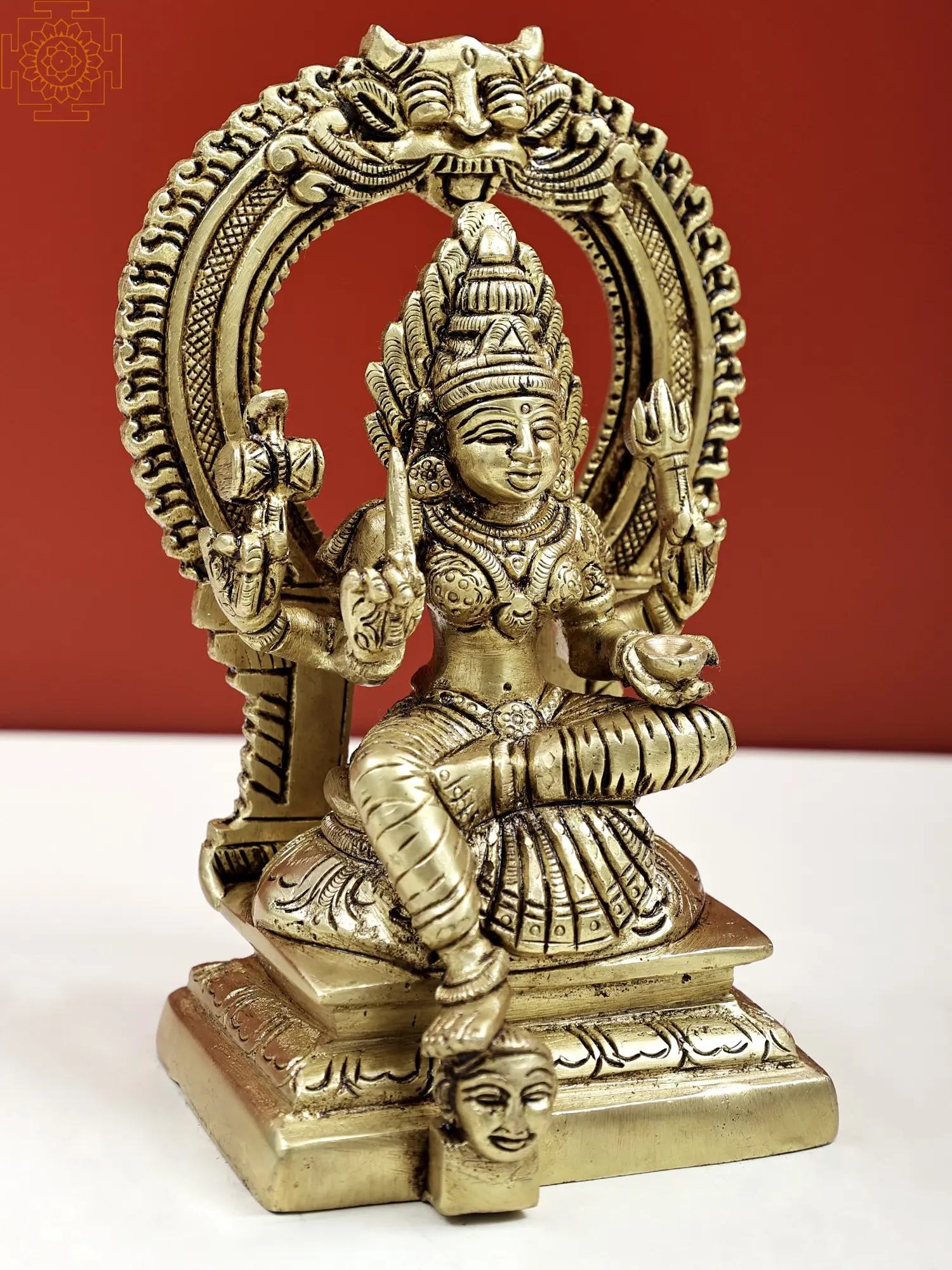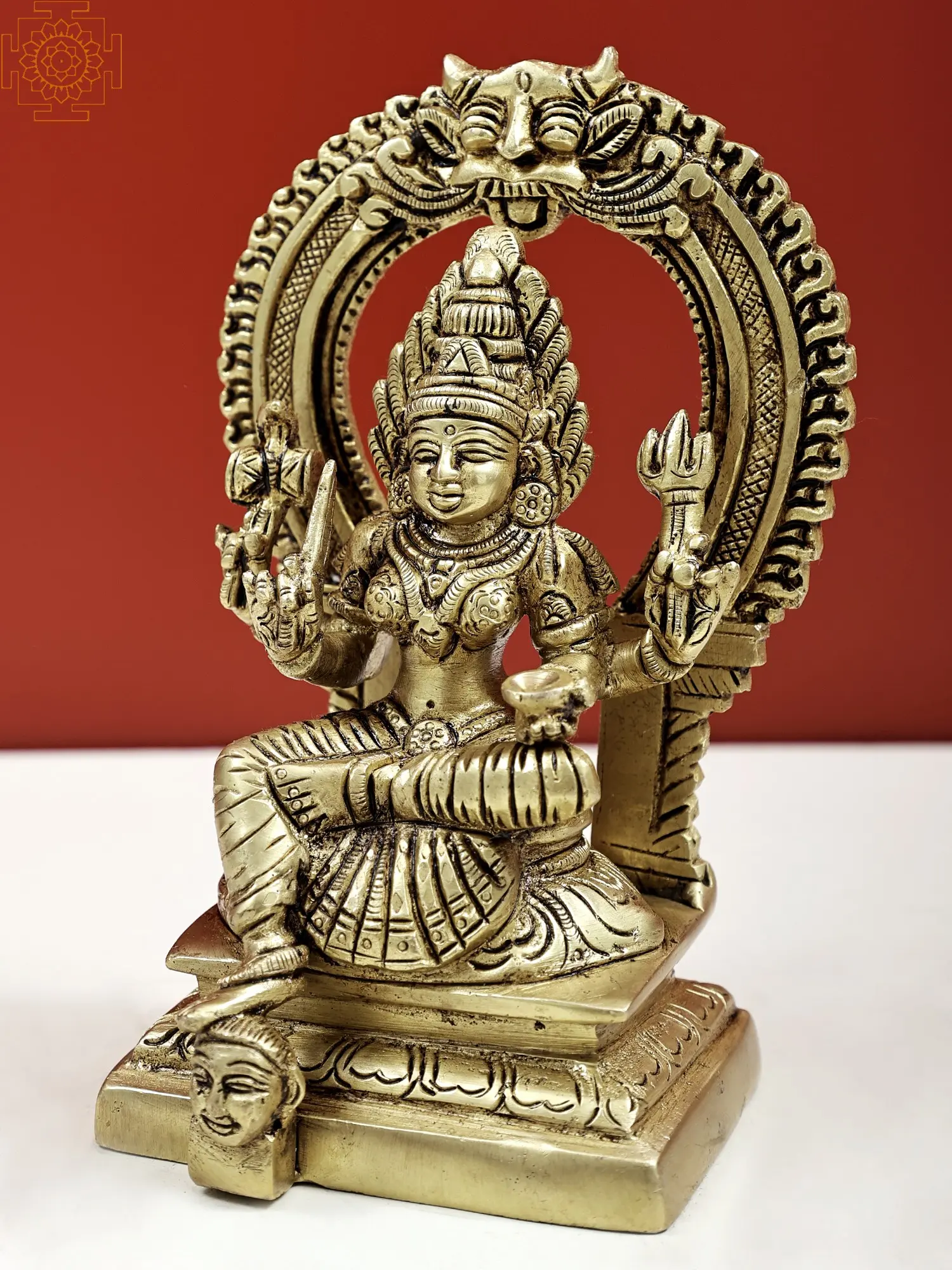 The South Indian form of Durga is evoked as Mariamman in the local traditions, who is represented in this small brass statue seated on a lotus throne, surrounded by a beautiful aureole with Kirtimukha (the face of glory) on top. Maa Mariamman is adorned with a mukuta which is highlighted by a fiery aura, delicate ornaments, and traditional attire. The severed head on her feet symbolizes the offering of the idea of self or Aham, in front of the deity, to attain her blessings.