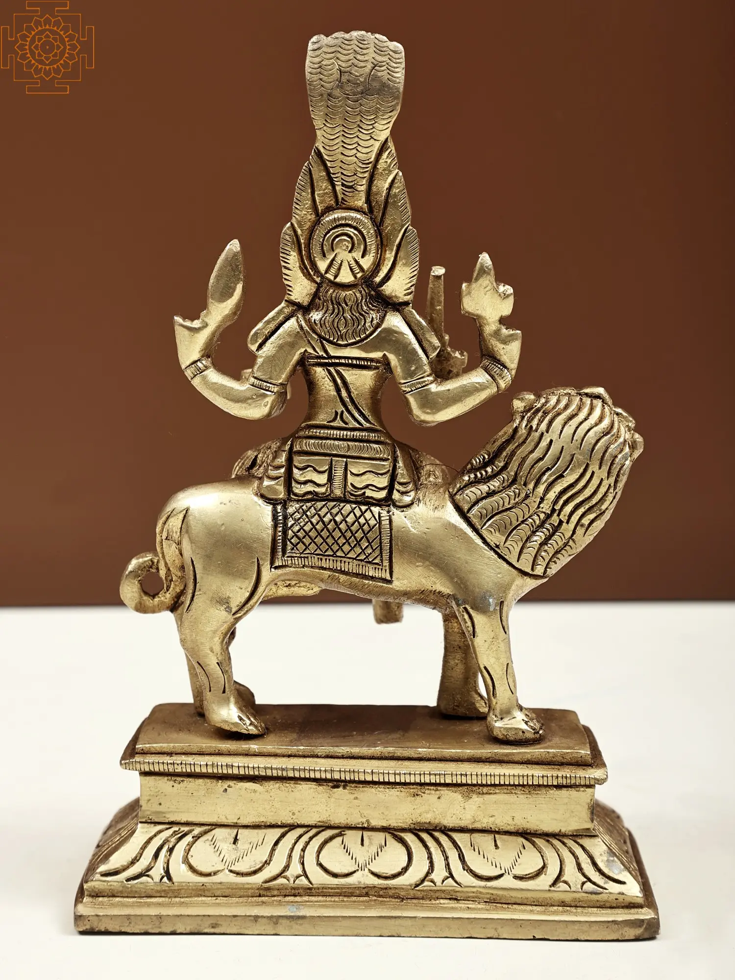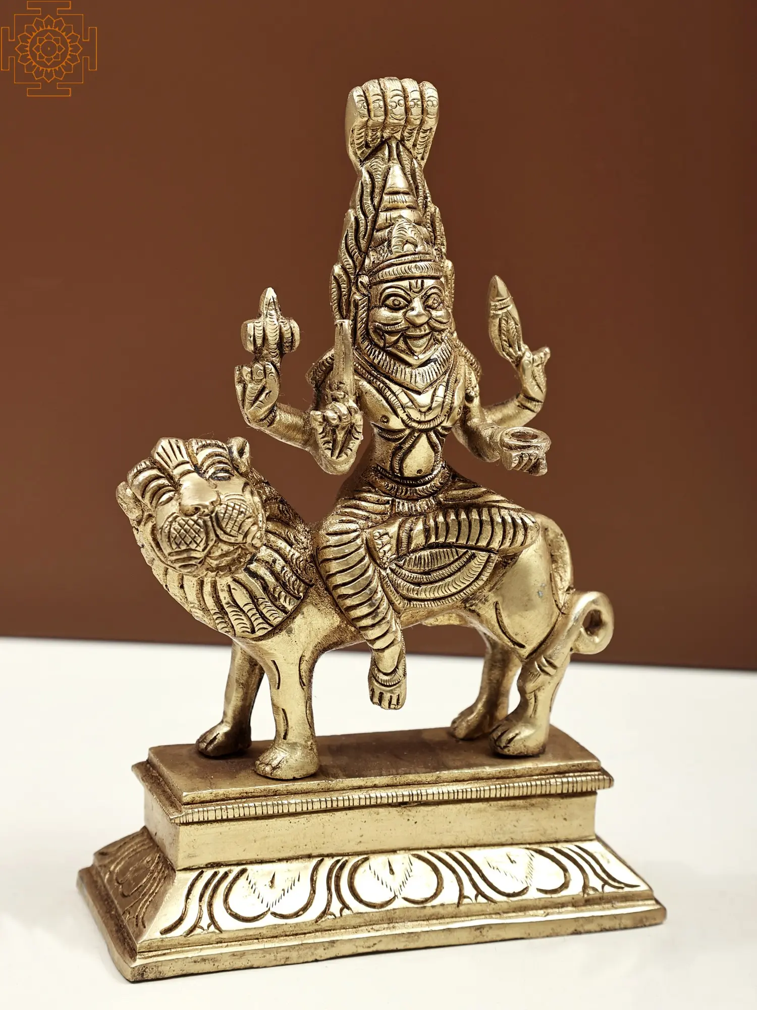 Goddess Pratyangira, also known as Simhamukhi due to her lion-like (Simha) face (mukha), is connected to the Atharva Veda as the presiding deity who protects her followers from all harm and releases them from the cycle of life and death. Goddess Pratyangira is viewed as a fierce deity who embodies Devi Tripurasundari's wrath, but beneath her roaring lion visage lies the love of the supreme mother. This brass statue presents the ethereal mother goddess on a platform, enthroned on her lion in Lalitasana, with the fire of consciousness and serpent forming her majestic halo.