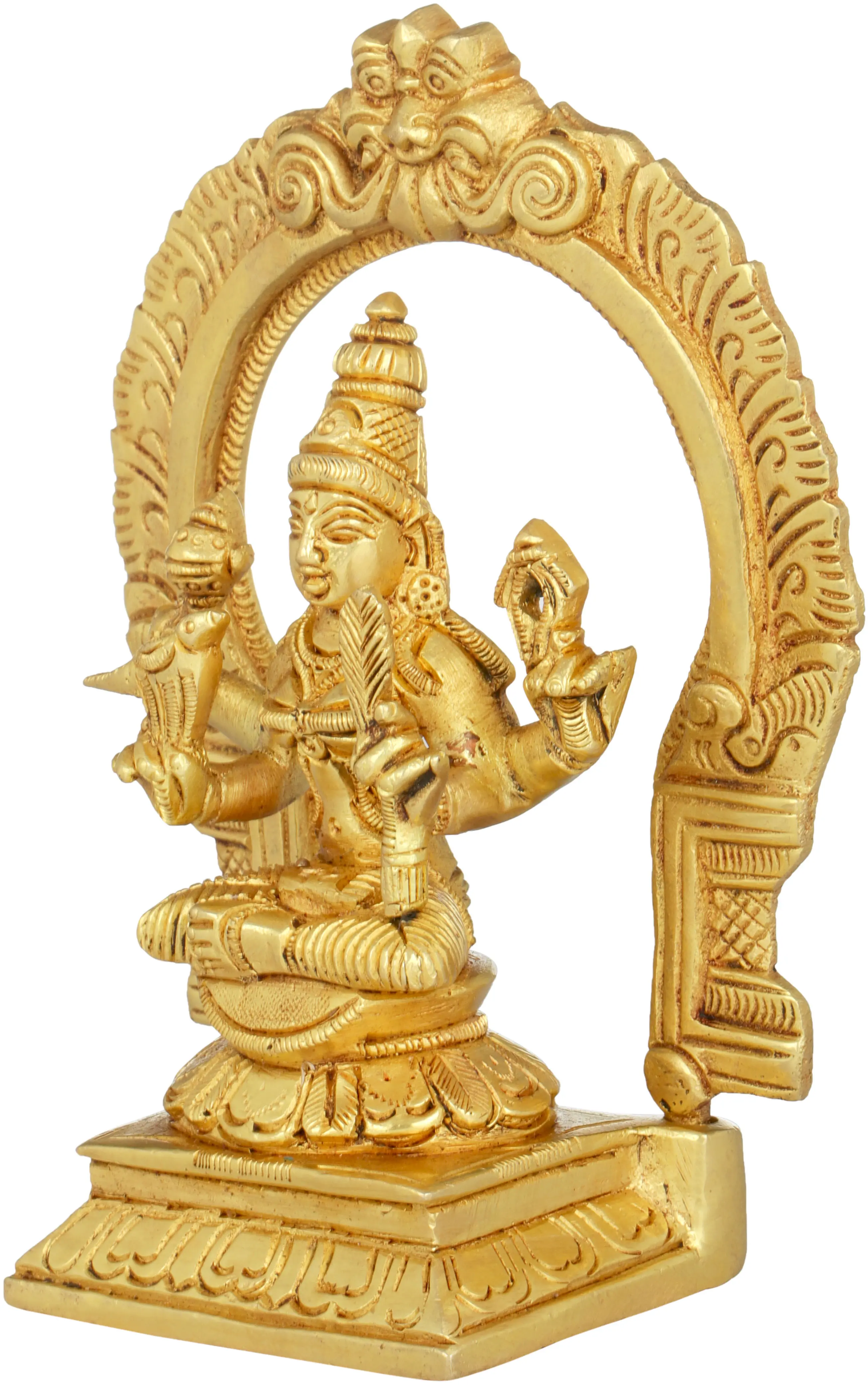 Tripura Sundari, also known as Goddess Lalita or Shodashi, is a prominent deity in Hinduism, representing beauty, grace, and divine femininity. She is often depicted as a radiant young woman, adorned with splendid jewelry, seated on a lotus throne. She possesses four arms, each holding symbolic objects like a noose, goad, representing different aspects of her cosmic power. A parrot is perched on the goddess’s right hand signifies her divine authority over knowledge, wisdom, and communication. Her smile reflects her divine grace, offering hope and comfort to those who approach her with devotion and reverence. Crafted with devotion, this brass creation invokes the blessings of Goddess Rajarajeshwari, promoting protection, prosperity, and spiritual upliftment.
