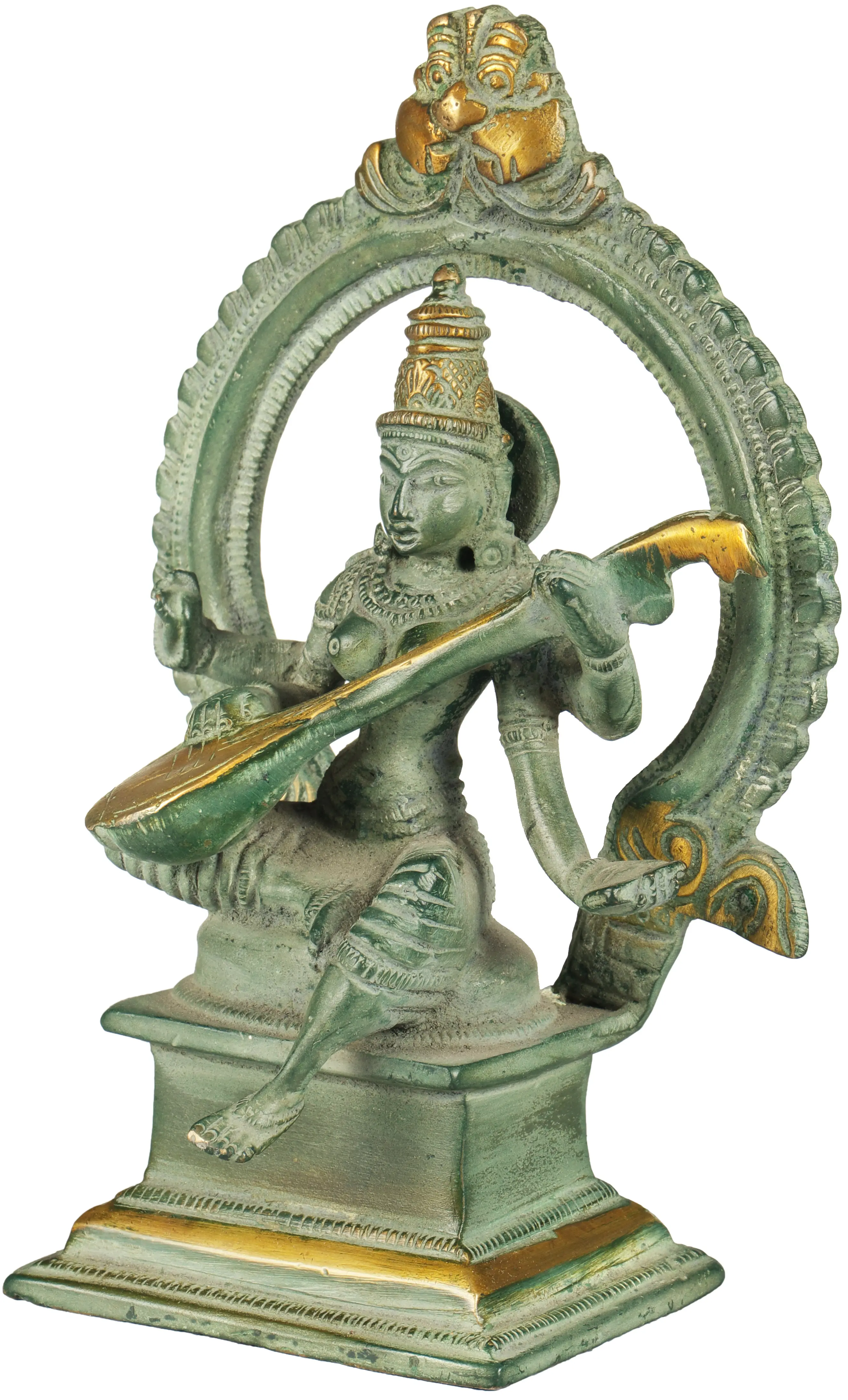 Gracing the icon in a heavenly form, exuding beauty, auspiciousness, and a celestial aura from her presence, Devi Saraswati in this small brass statue is the supreme mother goddess, from whom emanates the Srishti of Lord Brahma. Maa Saraswati has been depicted as Veenavadini, strumming her Veena with her two hands, while the other two hold the book and rosary. Sculpted beautifully, this handmade goddess Saraswati statue is ideal for devotees of the mother goddess.