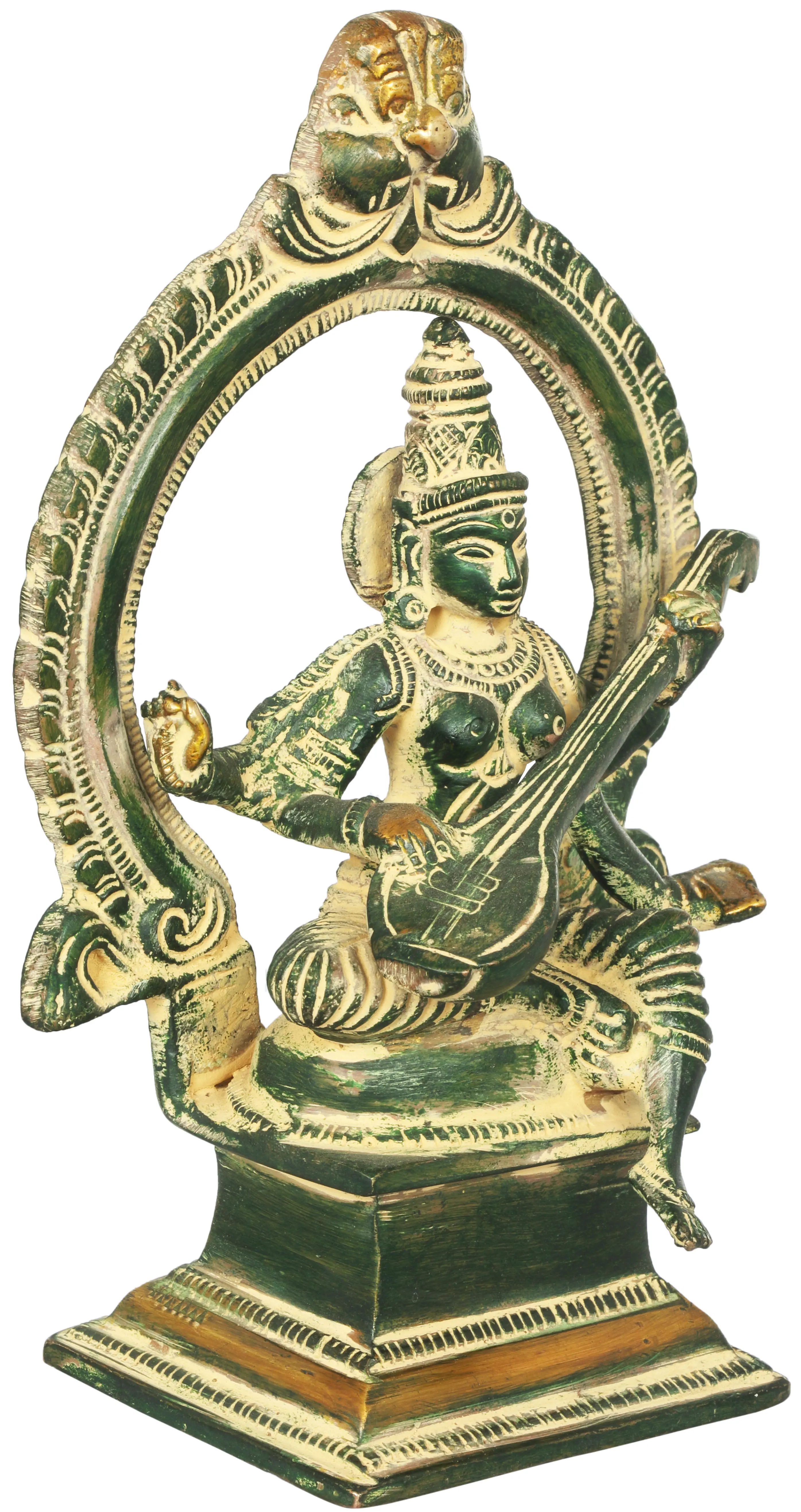 Gracing the icon in a heavenly form, exuding beauty, auspiciousness, and a celestial aura from her presence, Devi Saraswati in this small brass statue is the supreme mother goddess, from whom emanates the Srishti of Lord Brahma. Maa Saraswati has been depicted as Veenavadini, strumming her Veena with her two hands, while the other two hold the book and rosary. Sculpted beautifully, this handmade goddess Saraswati statue is ideal for devotees of the mother goddess.