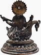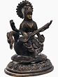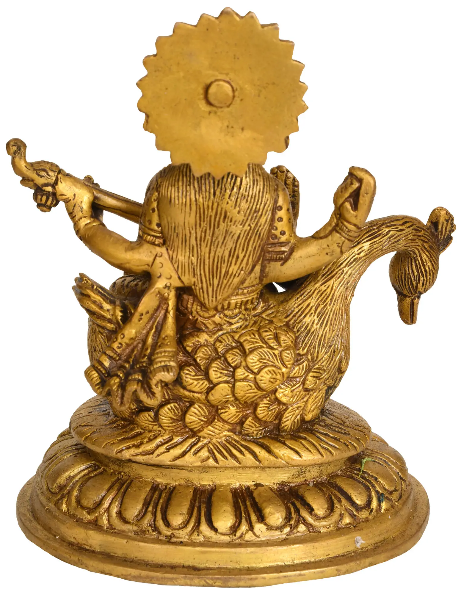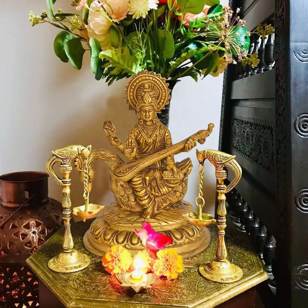 Goddess Saraswati, also known as Hansvahini, One Who Rides a Swan, is the great mother who bestows the benefits of Wisdom—both divine and earthly. She must grant her blessings in order for a student, artist, poet, or anybody else involved in creative endeavors to excel in her field. Maa Saraswati is perched atop a swan in Lalitasana, the regal and kingly attitude in this brass statue. Additionally, her ornaments represent the goddess Saraswati's regal demeanor. Swans in Hindu tradition are symbolic of sharp minds that can detect the difference between shallow and true knowledge. The association of the goddess Saraswati with the hamsa (Swan) highlights the notion that as one obtains knowledge through the generosity of Devi, she is able to differentiate between untrue and pure wisdom, and thus attains proximity to the divine truth.