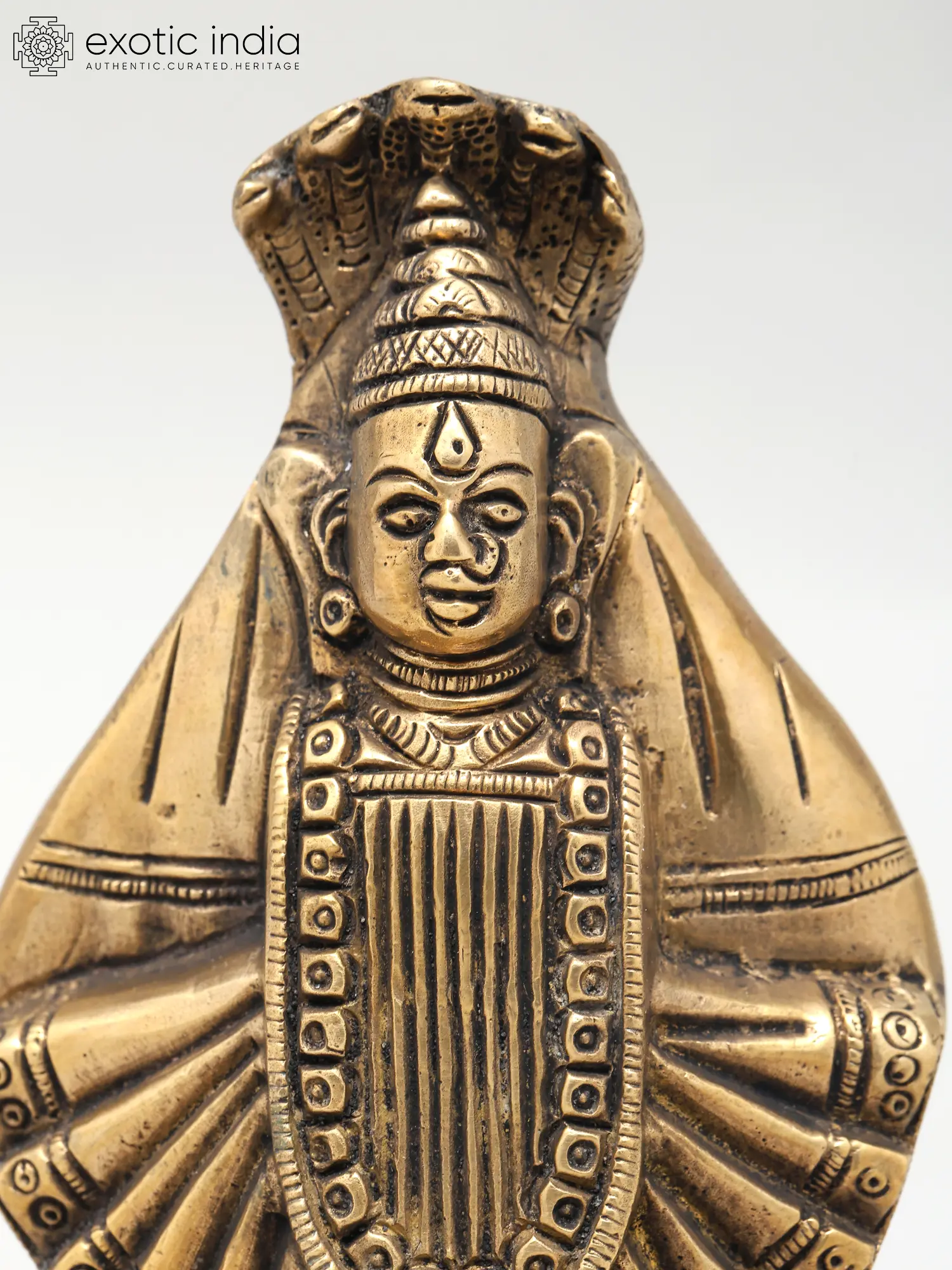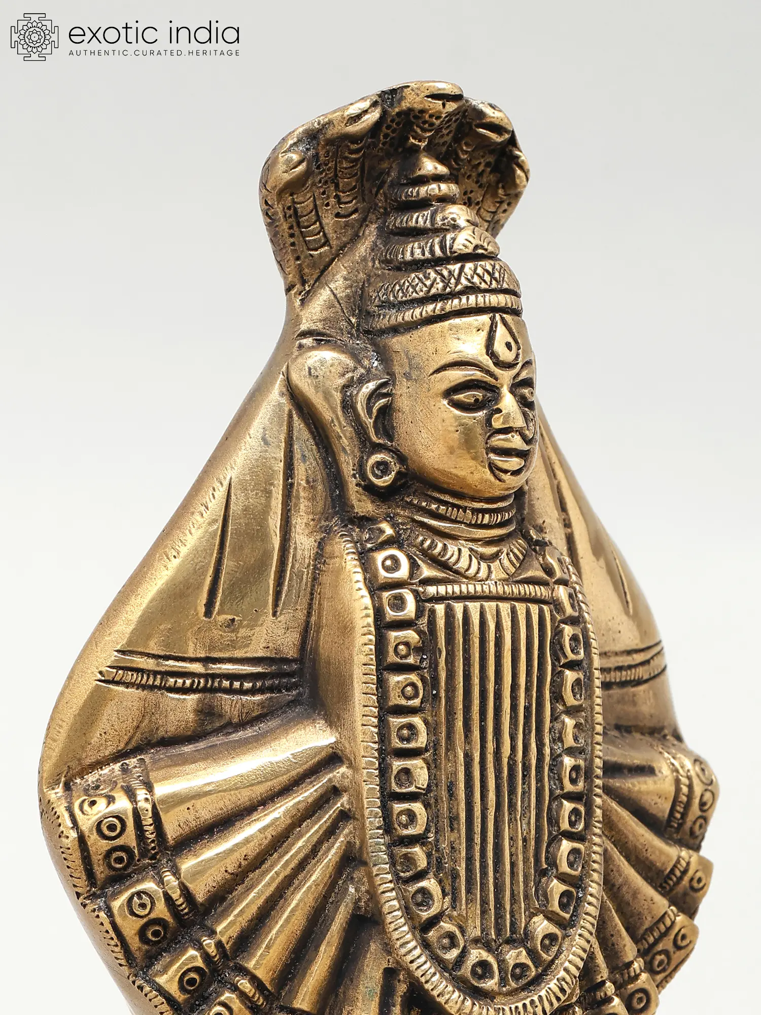 Observe the delicate detailing that adorns the form, from the serene facial features to the elaborate headdress and the cascading drapery. The raised patterns and the subtle textural variations within the brass lend a visual depth that captivates the eye. Its refined proportions, standing approximately six inches tall, make it perfectly suited for intimate spaces, radiating its presence without overwhelming its surroundings.