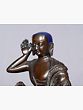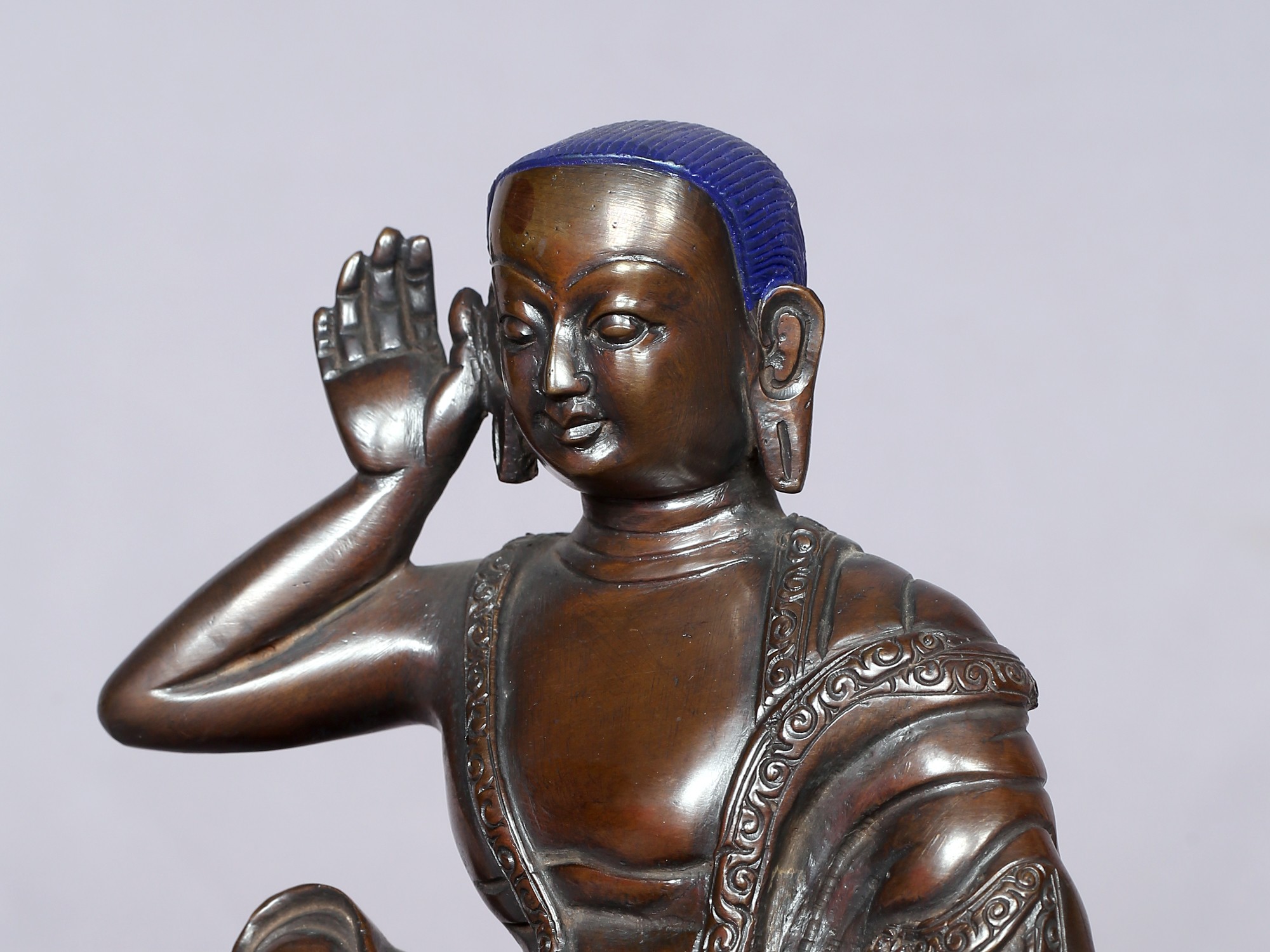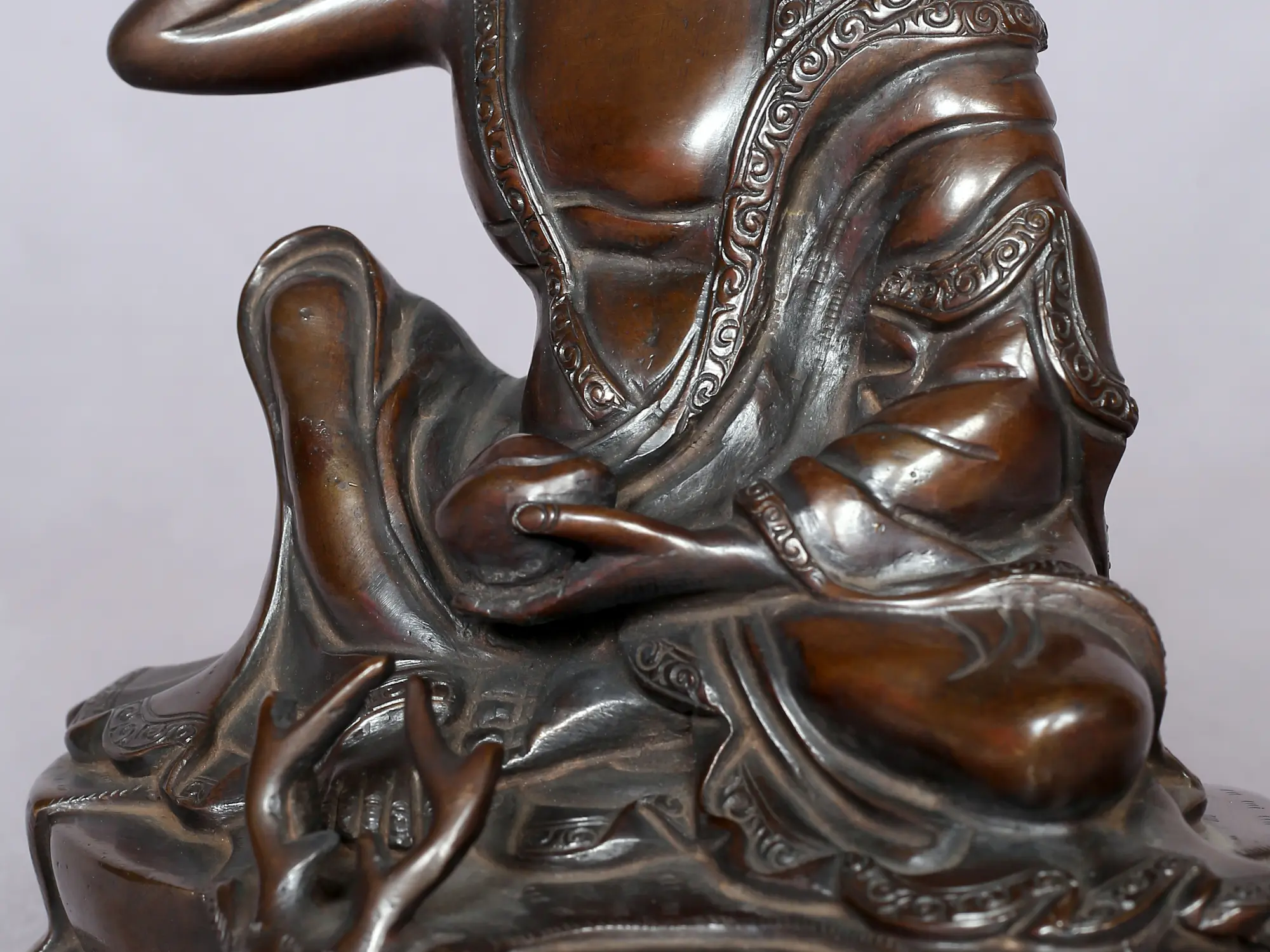 This exquisite copper statue captures the essence of Milarepa, the renowned Tibetan yogi, poet, and saint of the Kagyu sect of Buddhism. Crafted with meticulous detail in Nepal, this artwork embodies the profound spiritual journey and teachings of one of Buddhism's most beloved figures. Milarepa's life, marked by hardship and eventual enlightenment, serves as an enduring testament to the power of devotion and perseverance. He is often depicted in his characteristic ascetic posture, a reflection of his years spent in solitary meditation in the caves of the Himalayas. The statue portrays Milarepa with a serene countenance, his body gracefully seated in a meditative pose. His right hand is raised, fingers gently touching his ear, a gesture often interpreted as him listening to the profound teachings of the Dharma, or perhaps to the whispers of the universe itself. This pose, evocative of deep contemplation, invites viewers to connect with their own inner wisdom and stillness. The rich patina of the copper adds to the statue's timeless appeal, suggesting the weight of history and the enduring power of spiritual practice. ––––––––––––––––––