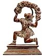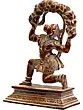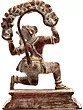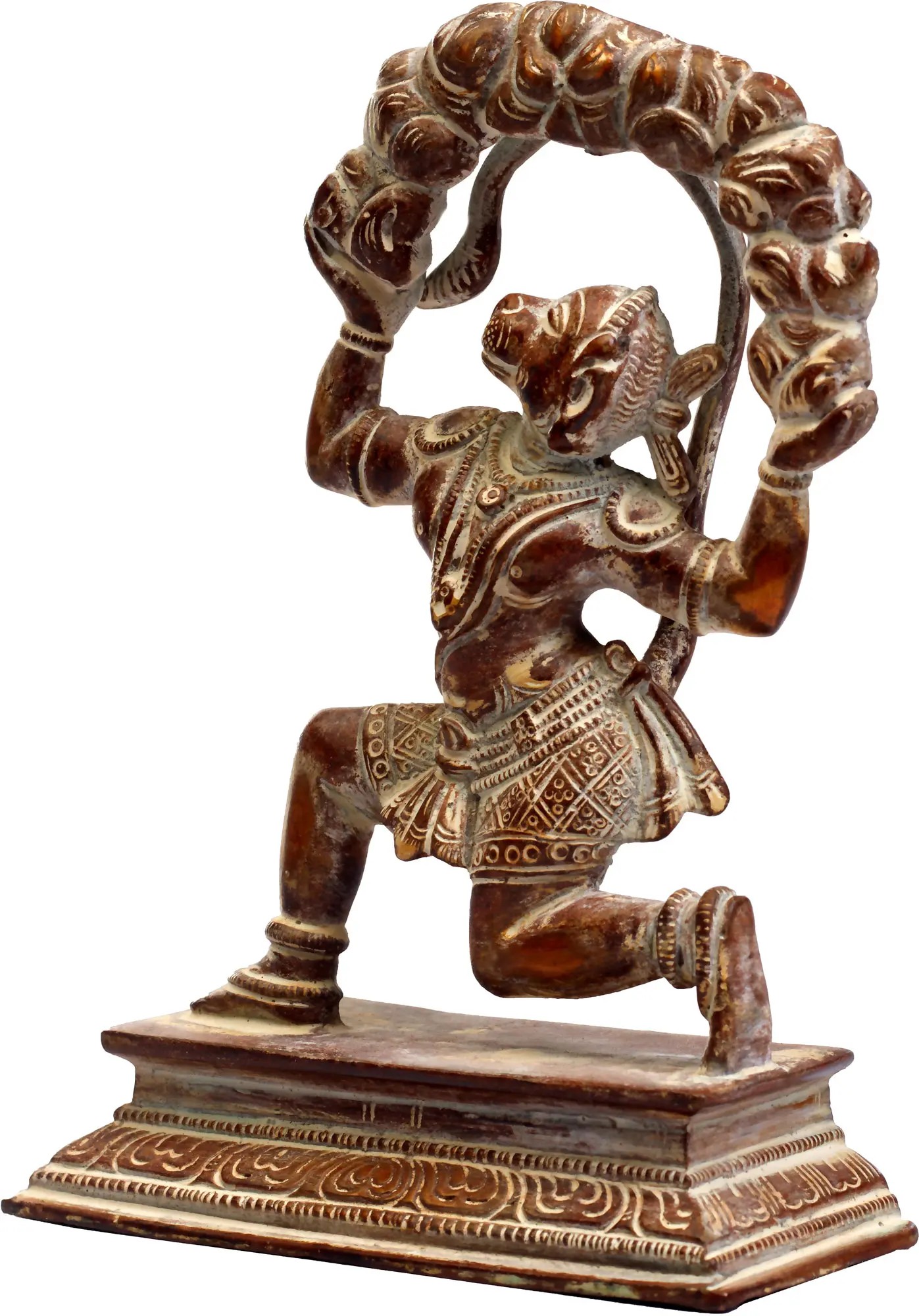 Standing on a semi-circular pedestal is Hanuman, with the monkey face and limbs of a human. In one hand he holds the end of his tail that takes the shape of a cobra head. In the other, he holds the mace, an attribute he is easily recognized with. The mace symbolizes strength and is used to destroy evil forces and restore peace and righteousness. He wears a langoti, resembling modern-day shorts. The artisan has adorned Hanuman with necklaces and other ornaments. He has wide shoulders portraying strength but his belly is slightly protruding. His large eyes and wide mouth cover the entire face.