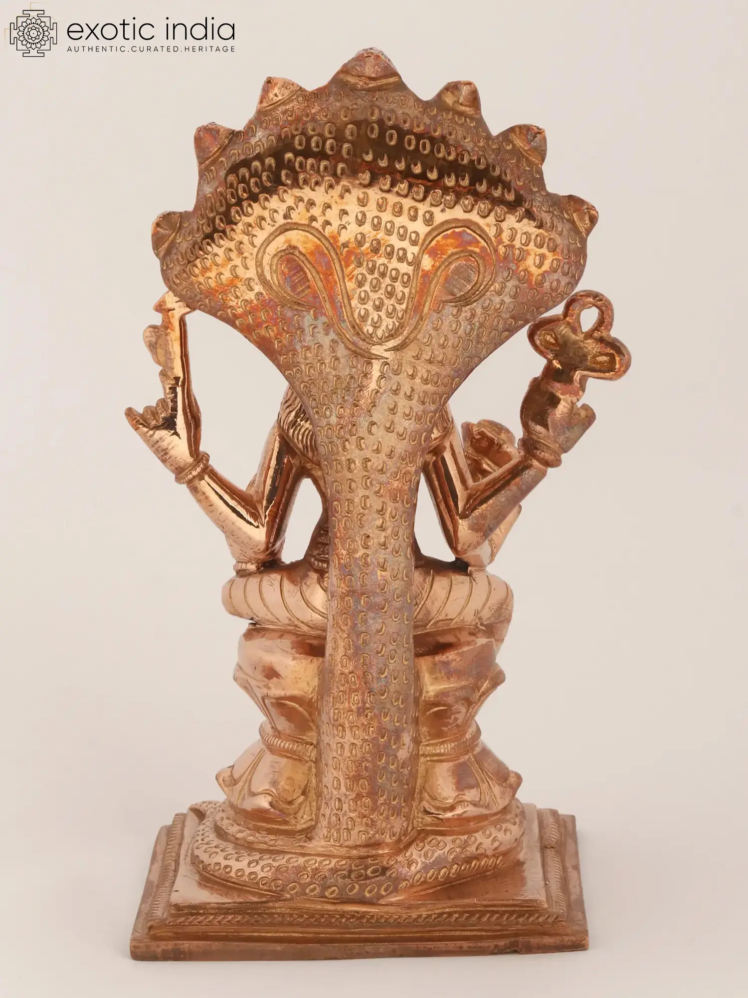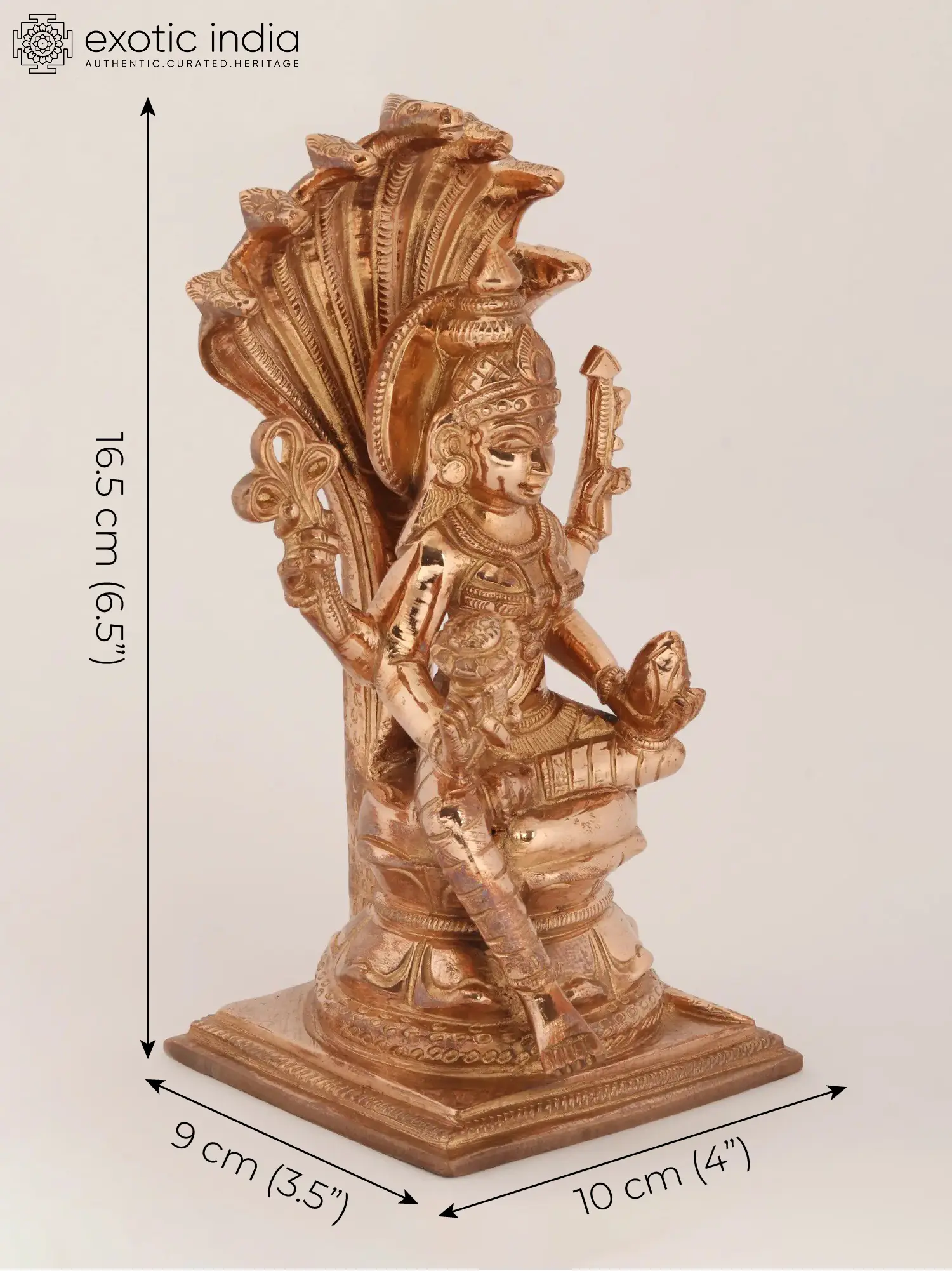 Manasa, the serpent goddess is believed to be the daughter of Rishi Kashyapa and Kadru, the mother of Nagas. Worshipped widely throughout the east and south of India, particularly for her immense powers - she saved Lord Shiva from the poison he had consumed and came to be known as Visha-Hari. Seated on her plinth, her body is slender yet well curved - representative of fertility, with prominent Teja on her Mukha and Saptamukhi Naga, coiling on the base, forms her shed. This piece in its careful design captures the complex aura of Manasa beautifully.