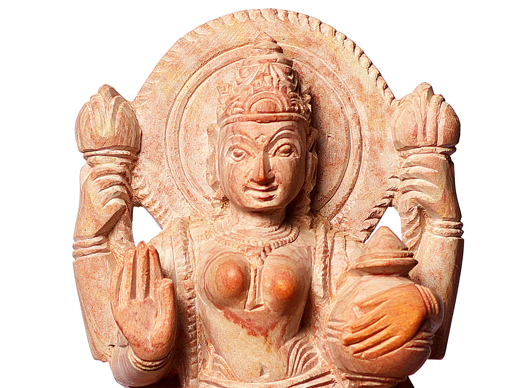 Ganga is depicted with four arms, a common representation of divine beings in Hinduism, signifying her multifaceted nature and her ability to act in all directions simultaneously. In her upper hands, she holds lotus flowers, symbols of purity, beauty, and spiritual awakening. The lower right hand is raised in a gesture of blessing or protection, offering solace and grace to devotees. Her left hand cradles a Kalasha, a pot brimming with nectar or the waters of immortality, representing her life-sustaining properties. She is adorned with traditional Indian jewelry, accentuating her celestial beauty. The intricate carving of her flowing garments and the delicate details of her facial features speak of the artisan's devotion and mastery. ––––––––––––––––––––