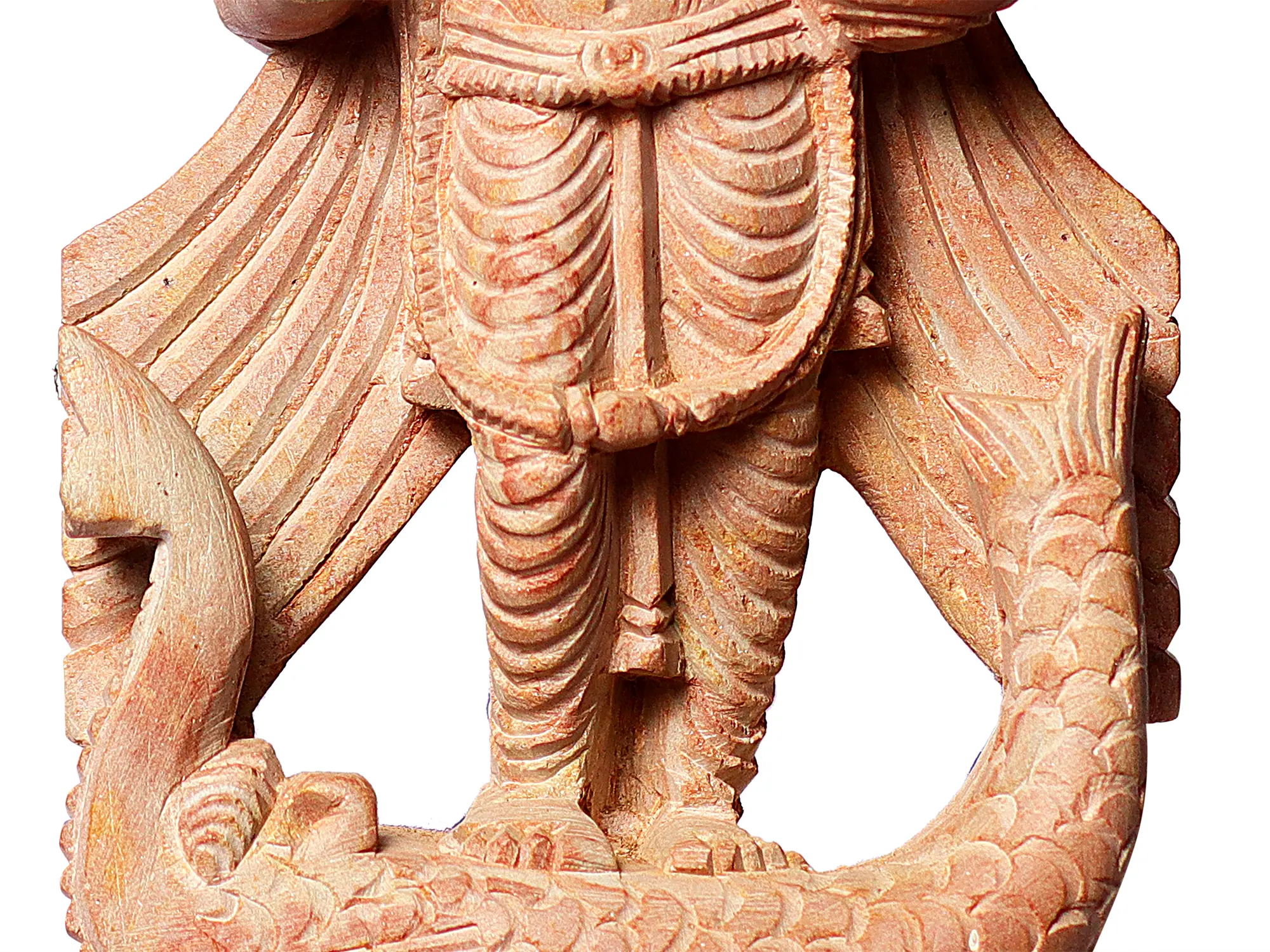 This exquisite sculpture captures the divine essence of Goddess Ganga, the personification of the sacred Ganges River, a life-giving force revered throughout India. Crafted from warm, rosy pink stone, this artwork is a testament to the skill of Odisha artisans, renowned for their traditional stone carving techniques. The goddess stands poised and graceful, her form radiating serenity and power.