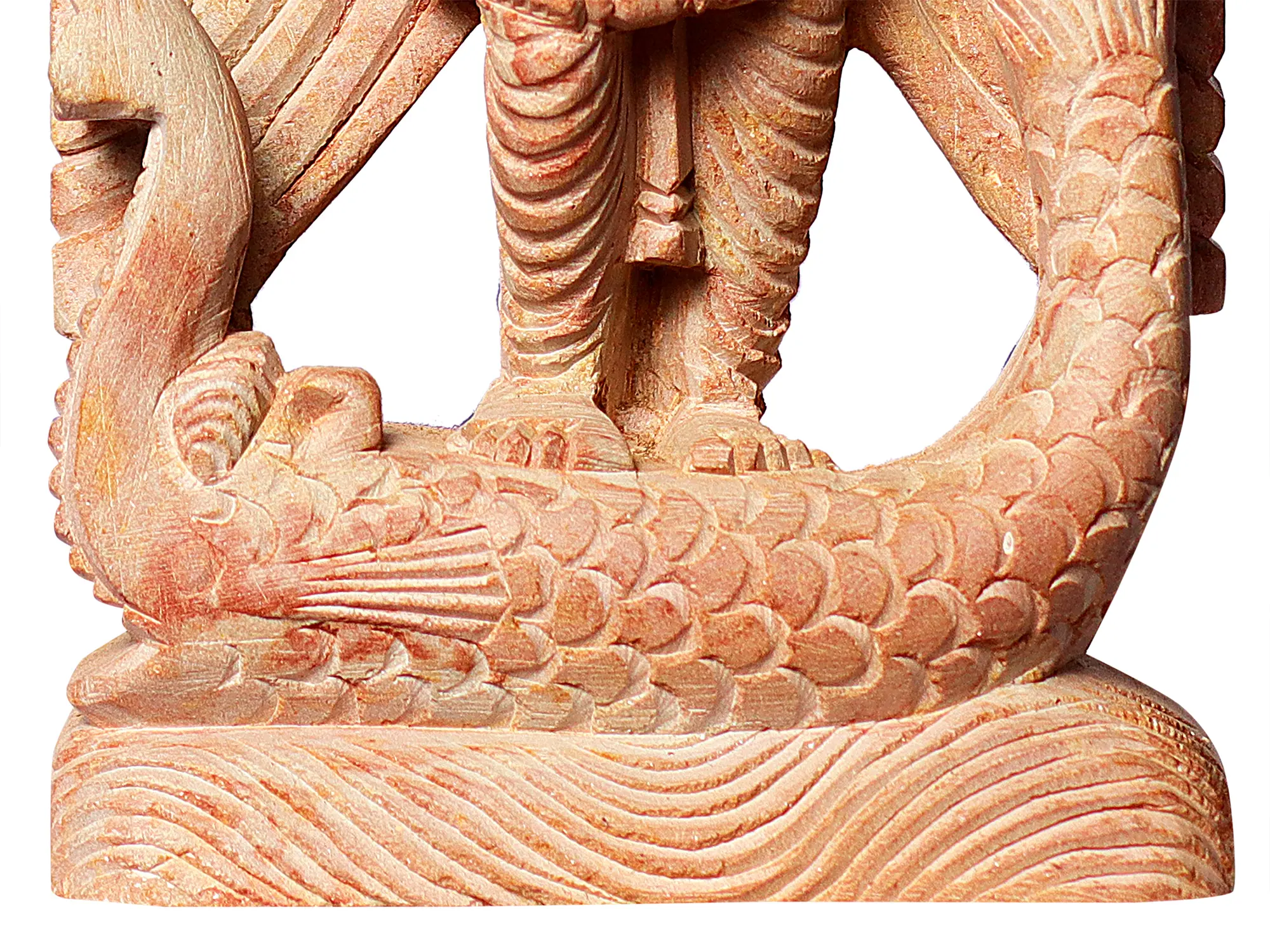The base of the sculpture features a magnificent Makara, a mythical sea creature often depicted as a composite of various animals, embodying strength and the power of water. In Hindu mythology, the Makara is the celestial vehicle, or Vahana, of Goddess Ganga. Its presence signifies the goddess's dominion over water and her ability to traverse even the most formidable currents. The Makara's powerful, scaly form and the gentle waves carved beneath it create a dynamic and visually captivating foundation for the divine figure. The Makara also represents the overcoming of obstacles and the passage through different realms, further enhancing the symbolism of Ganga's journey from the heavens to the earth.