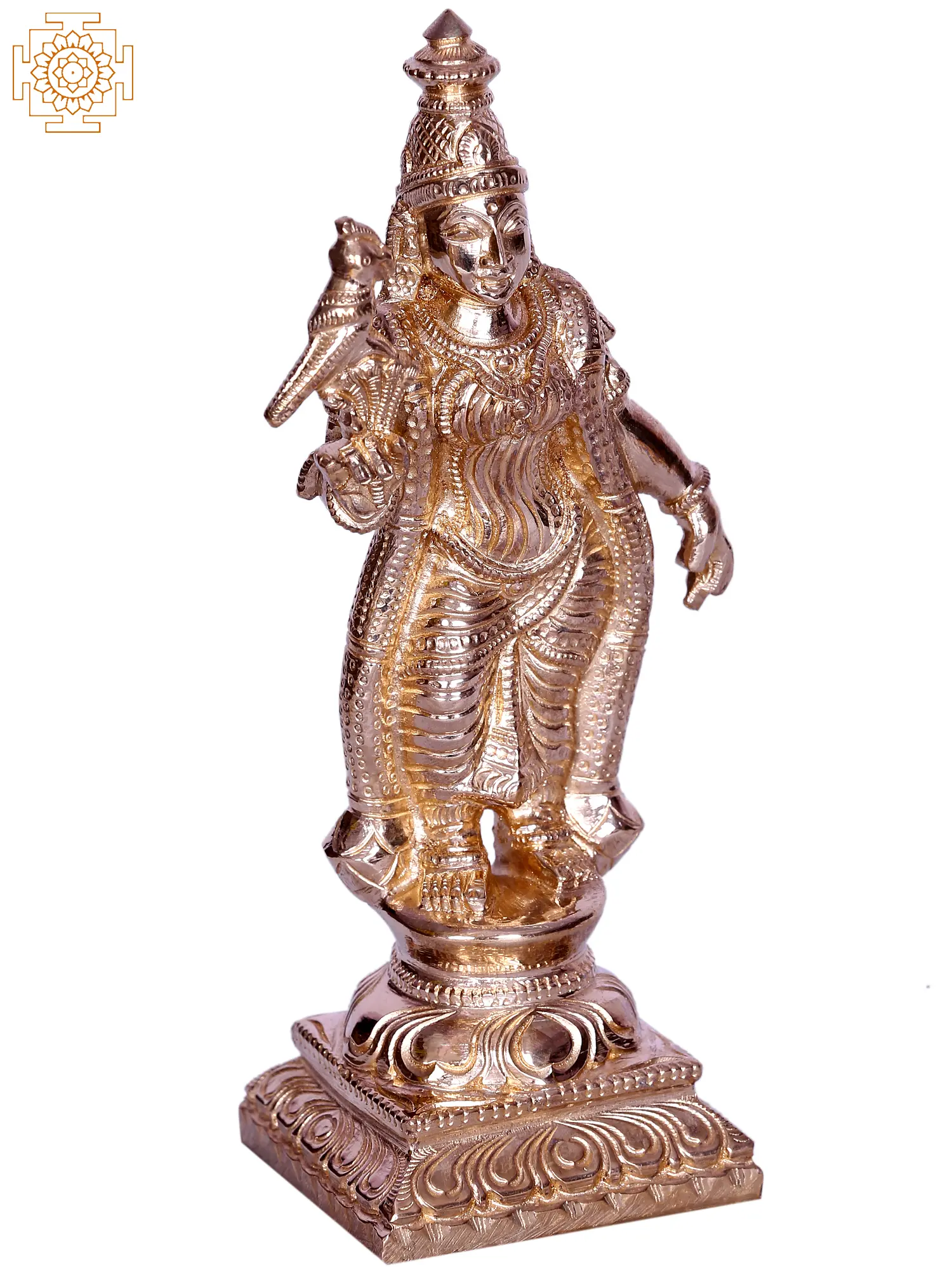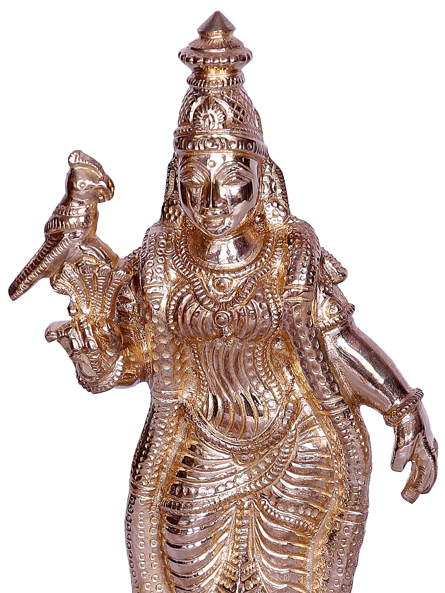 In this mesmerising bronze depiction, Goddess Meenakshi stands upon a lotus, symbolising purity, prosperity and abundance. She bears a bouquet, accompanied by a parrot—a testament to her mastery of the 64 Arts. Adorned in regal attire, Goddess Meenakshi beckons worshippers to unravel the profound significance of her form, an invitation to delve into the mysteries of knowledge and divine blessings.