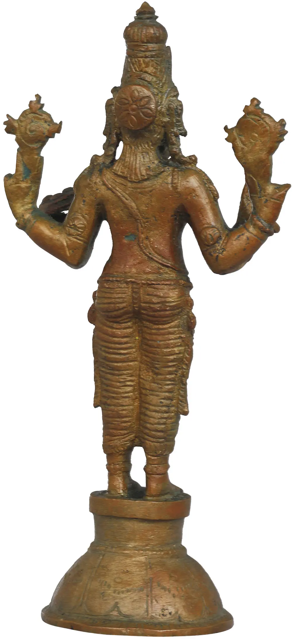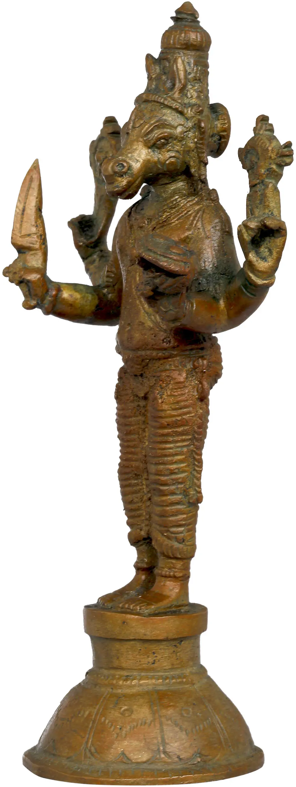 Hayagriva is the horse-headed avatar of Lord Vishnu. He is described as having four arms, holding the conch shell (śaṅkha), the discus (chakra), the mace (gadā), and the Vedas. Hayagriva's equine visage, adorned with a majestic Siraschakra (crown chakra) and Kirtimukuta (face of glory), represents his vast intellect and divine grace. The sculpture accentuates Hayagriva’s serene composure, radiating wisdom and spiritual enlightenment.