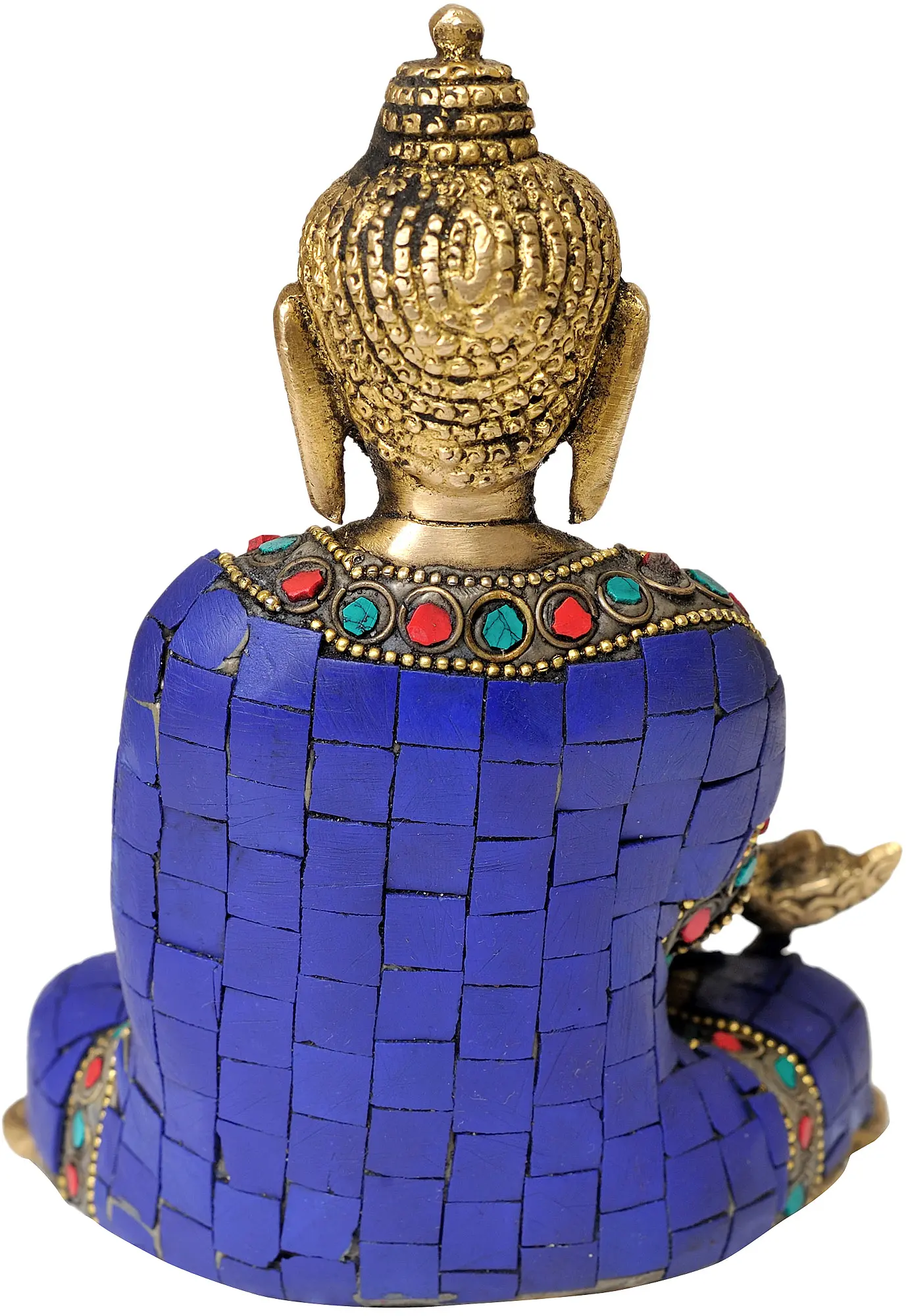 The carefully crafted brass Lapis Buddha sculpture embodies the deity of healing and compassion. The deep blue Lapis Lazuli resonates with spiritual insight and wisdom. The Buddha's hands rest in the Dhyana Mudra, also signifying meditation and inner focus. His robe signifies detachment from materialism, while the ushnisha is the source of enlightenment. The lotus base reflects purity amidst the muddiness of life. The exquisite sculpture is a conduit for healing energies, allowing us to immerse ourselves in the Buddha's aura of rejuvenation and renewal.