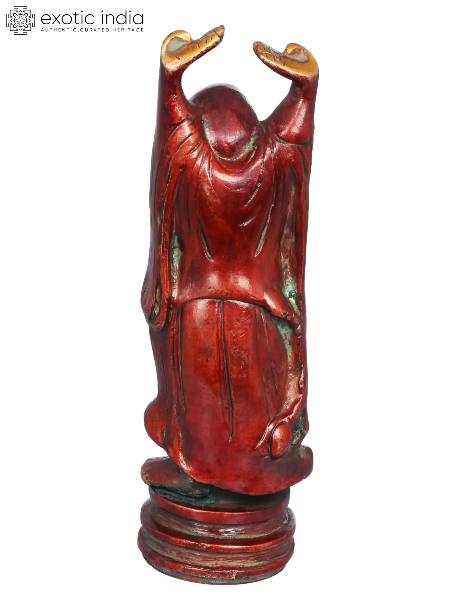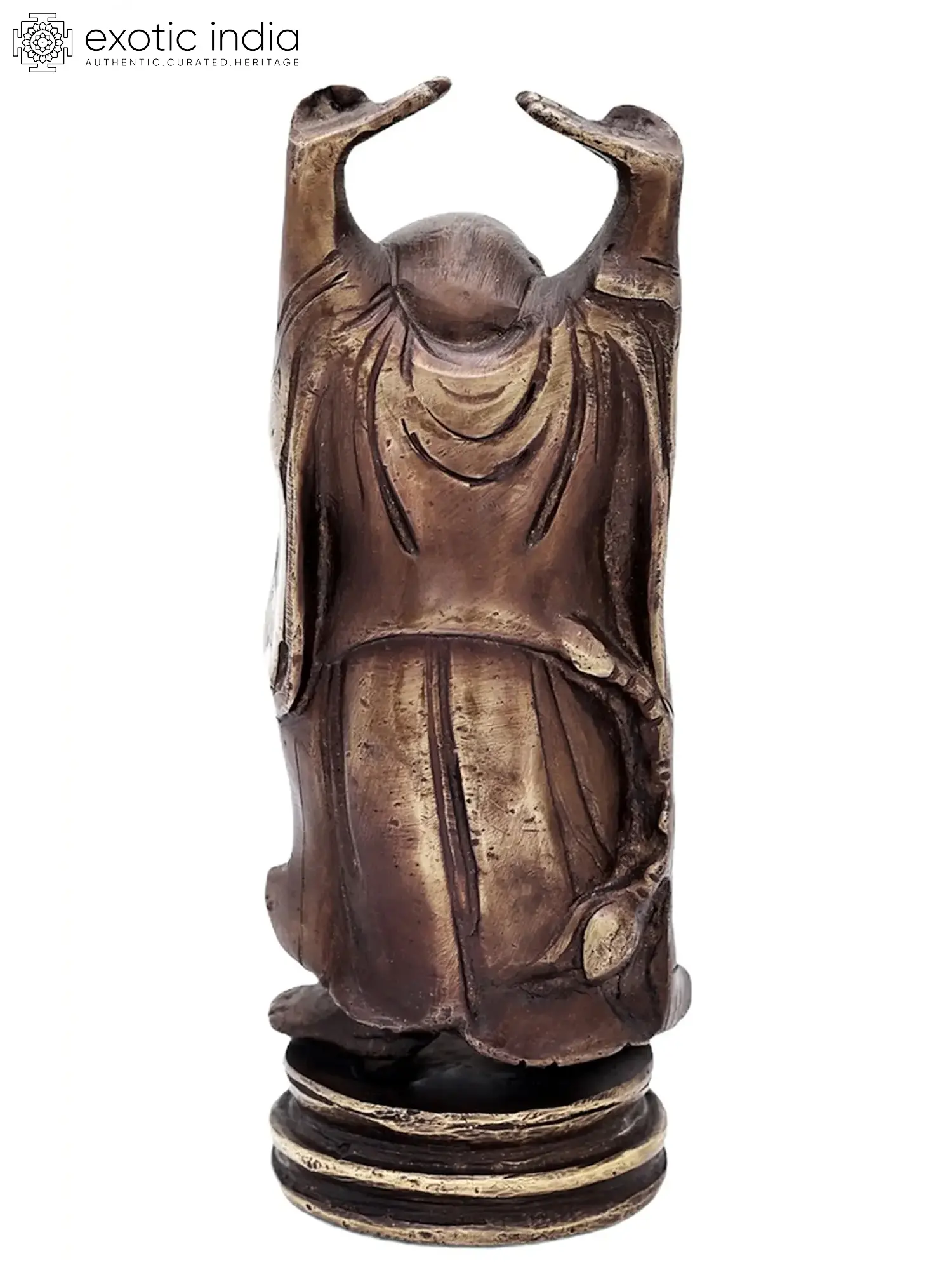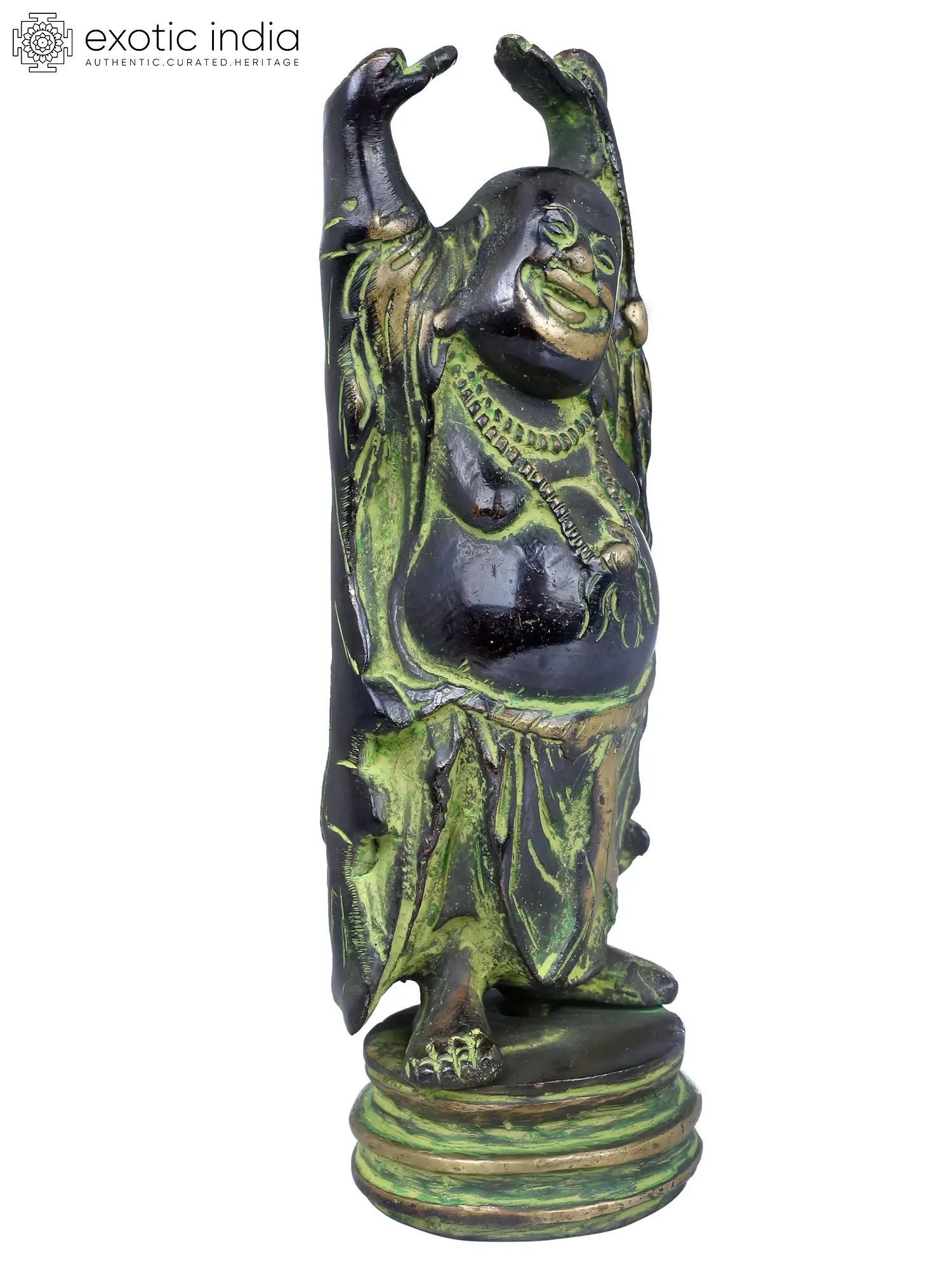 In this sculpture, Laughing Buddha, also known as the “Budai” or “Hotei” is standing with a jovial and beaming smile. His hands are raised up, a symbol of his abundance and prosperity. Laughing Buddha is often depicted with a rotund belly, signifying contentment and joy. Laughing Buddha’s countenance is filled with warmth and compassion, reflecting his role as a bringer of good fortune and blessings. His attire exudes a sense of ease and comfort, symbolizing his carefree and blissful demeanor. Crafted with intricate artistry and devotion, the brass sculpture emanates an eternal charm. Decorate your space with this magnificent artwork, embracing the essence of happiness and wealth that Laughing Buddha bestows.