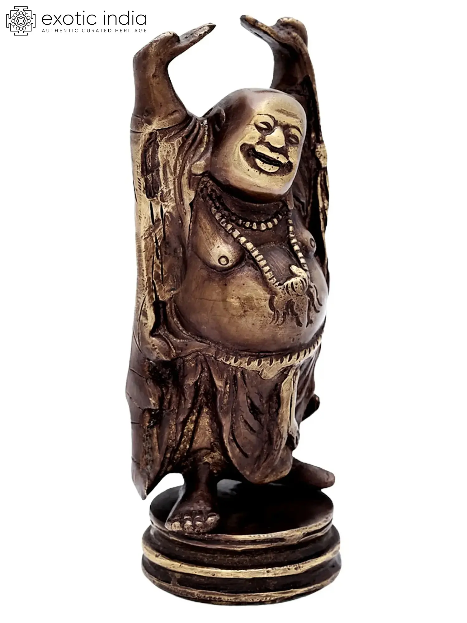 In this sculpture, Laughing Buddha, also known as the “Budai” or “Hotei” is standing with a jovial and beaming smile. His hands are raised up, a symbol of his abundance and prosperity. Laughing Buddha is often depicted with a rotund belly, signifying contentment and joy. Laughing Buddha’s countenance is filled with warmth and compassion, reflecting his role as a bringer of good fortune and blessings. His attire exudes a sense of ease and comfort, symbolizing his carefree and blissful demeanor. Crafted with intricate artistry and devotion, the brass sculpture emanates an eternal charm. Decorate your space with this magnificent artwork, embracing the essence of happiness and wealth that Laughing Buddha bestows.