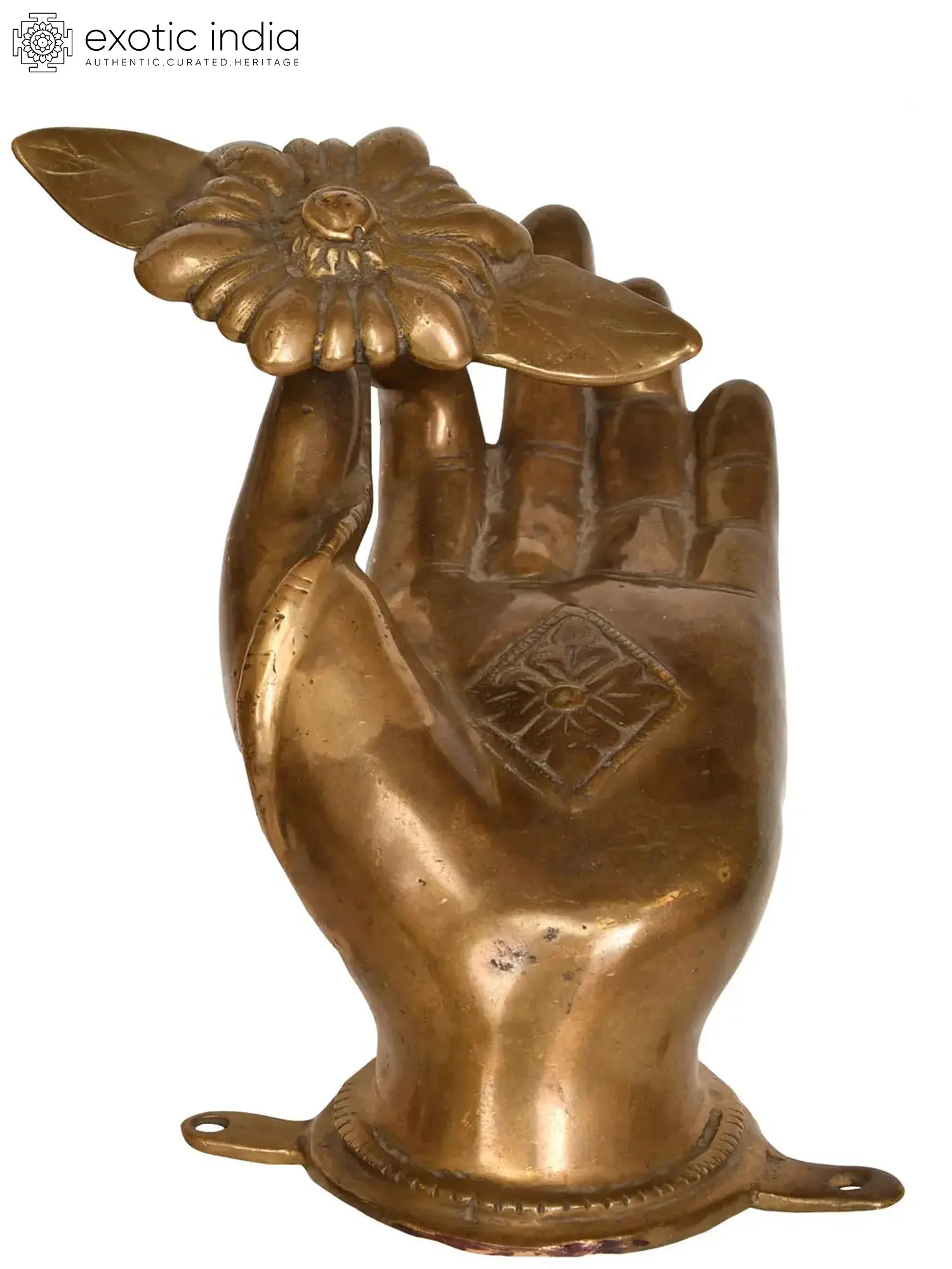 The lotus flower holds a place of paramount importance in Buddhist philosophy, representing purity, enlightenment, and rebirth. It is said that the Buddha was born with lotus flowers blossoming beneath his feet, and he himself is often depicted seated upon a lotus throne, a symbol of his detachment from the worldly illusions. These door knobs beautifully echo this symbolism, with the outstretched hand delicately cradling a blooming lotus. The open palm, often associated with blessings and protection, reaches out to offer this symbol of spiritual awakening. The square motif on the palm, subtly etched with a floral design, adds another layer of auspiciousness, representing balance and the cosmic order.
