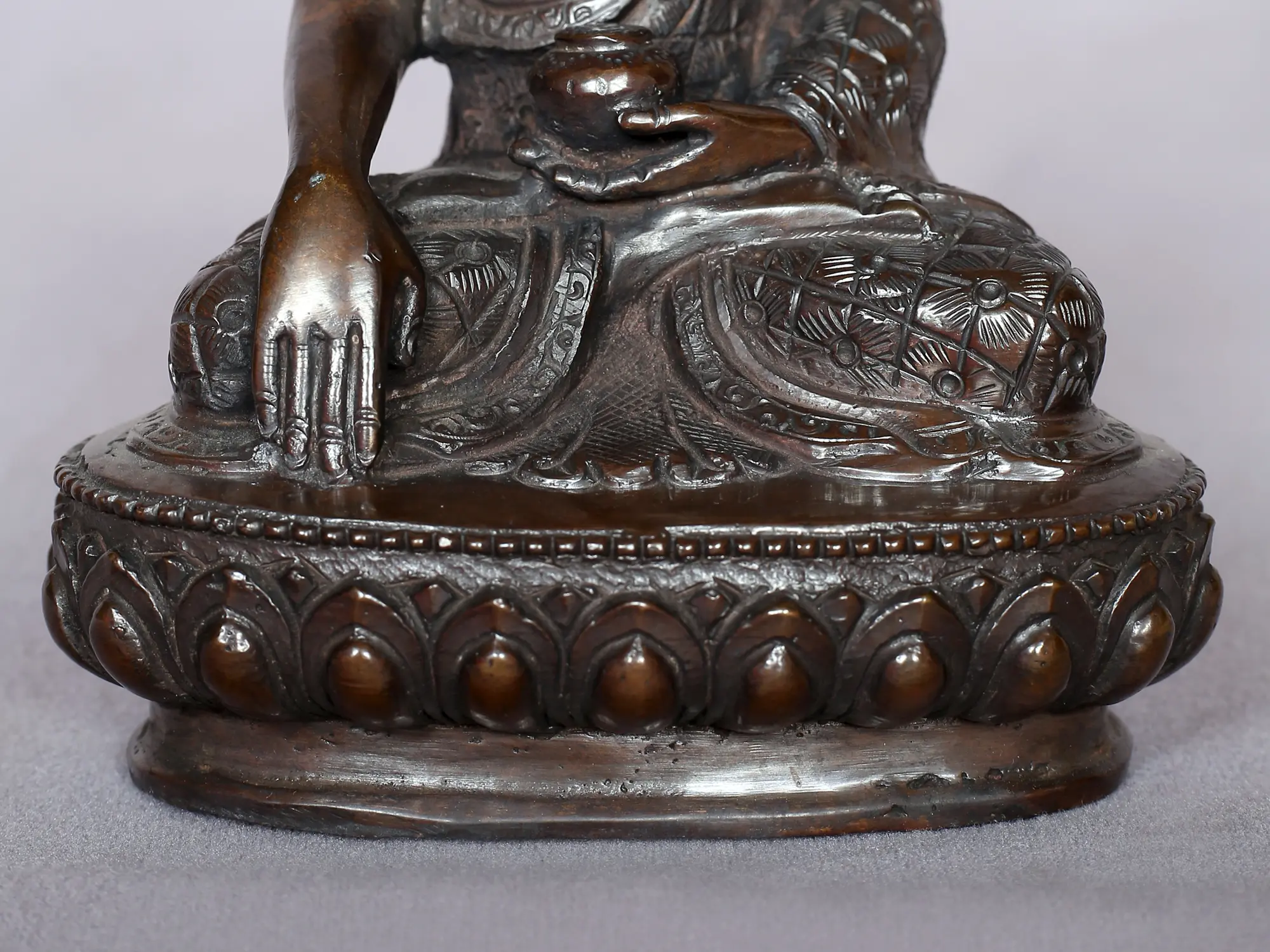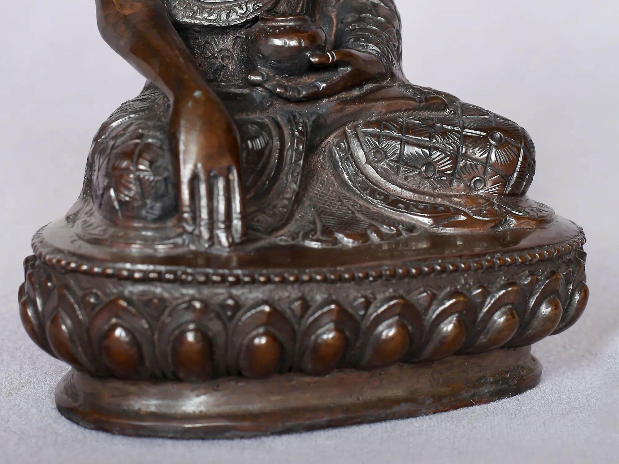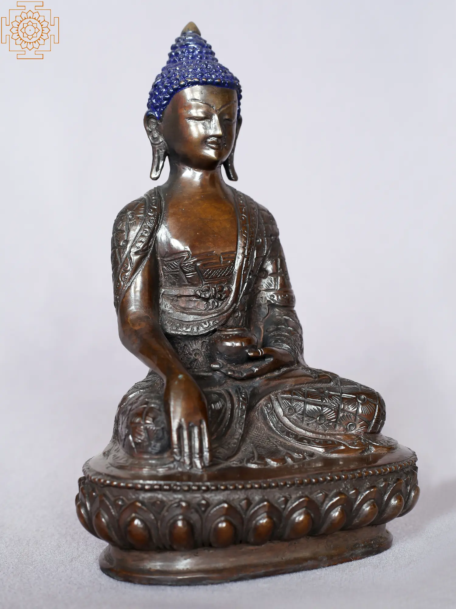 The serene figure of Lord Buddha, with his left hand resting in his lap in the Dhyana Mudra (meditation gesture). The Bhumisparsha Mudra symbolizes the Buddha's calling the Earth to witness his enlightenment, signifying the triumph over Mara (the demon of delusion) and the attainment of enlightenment under the Bodhi tree.