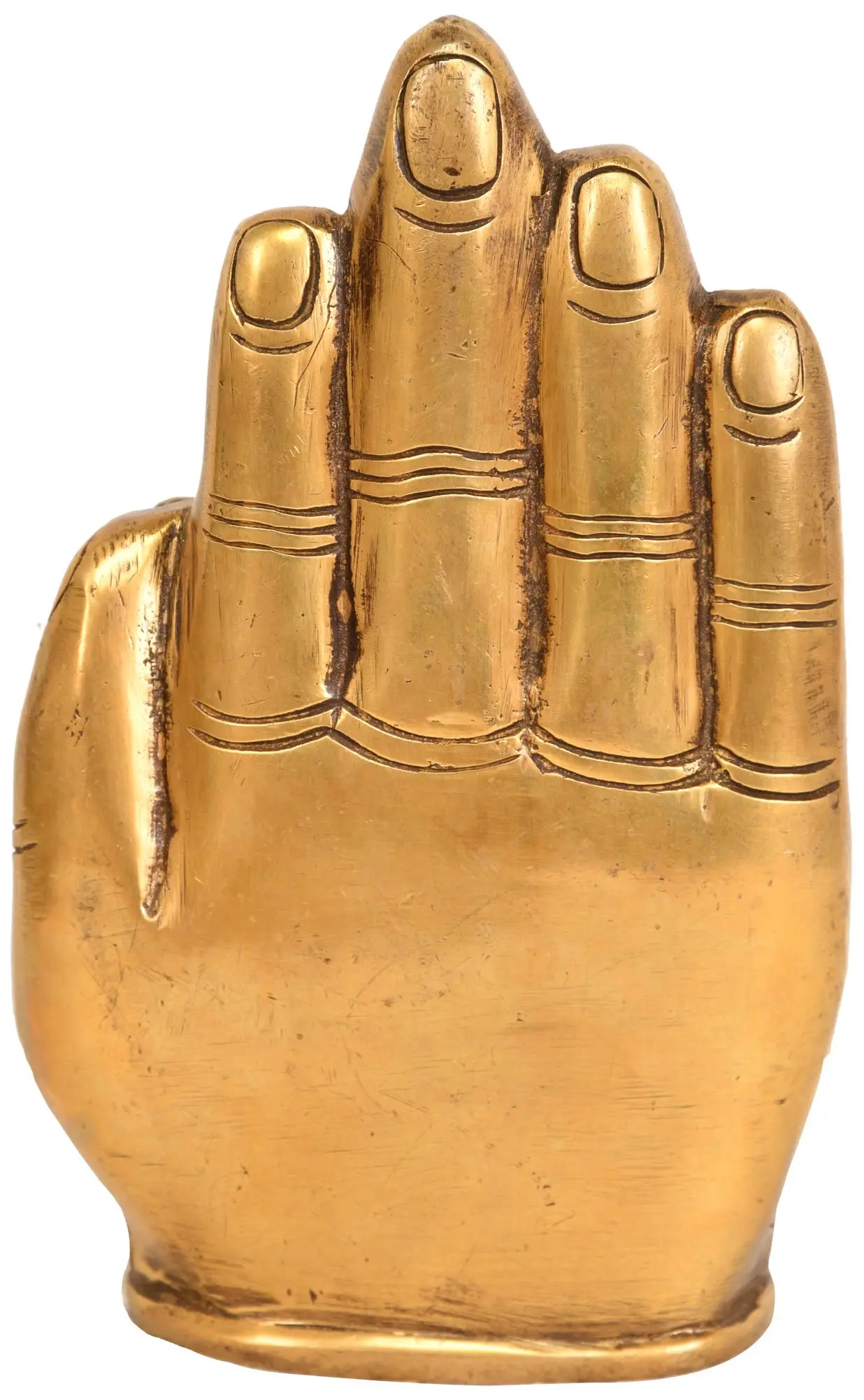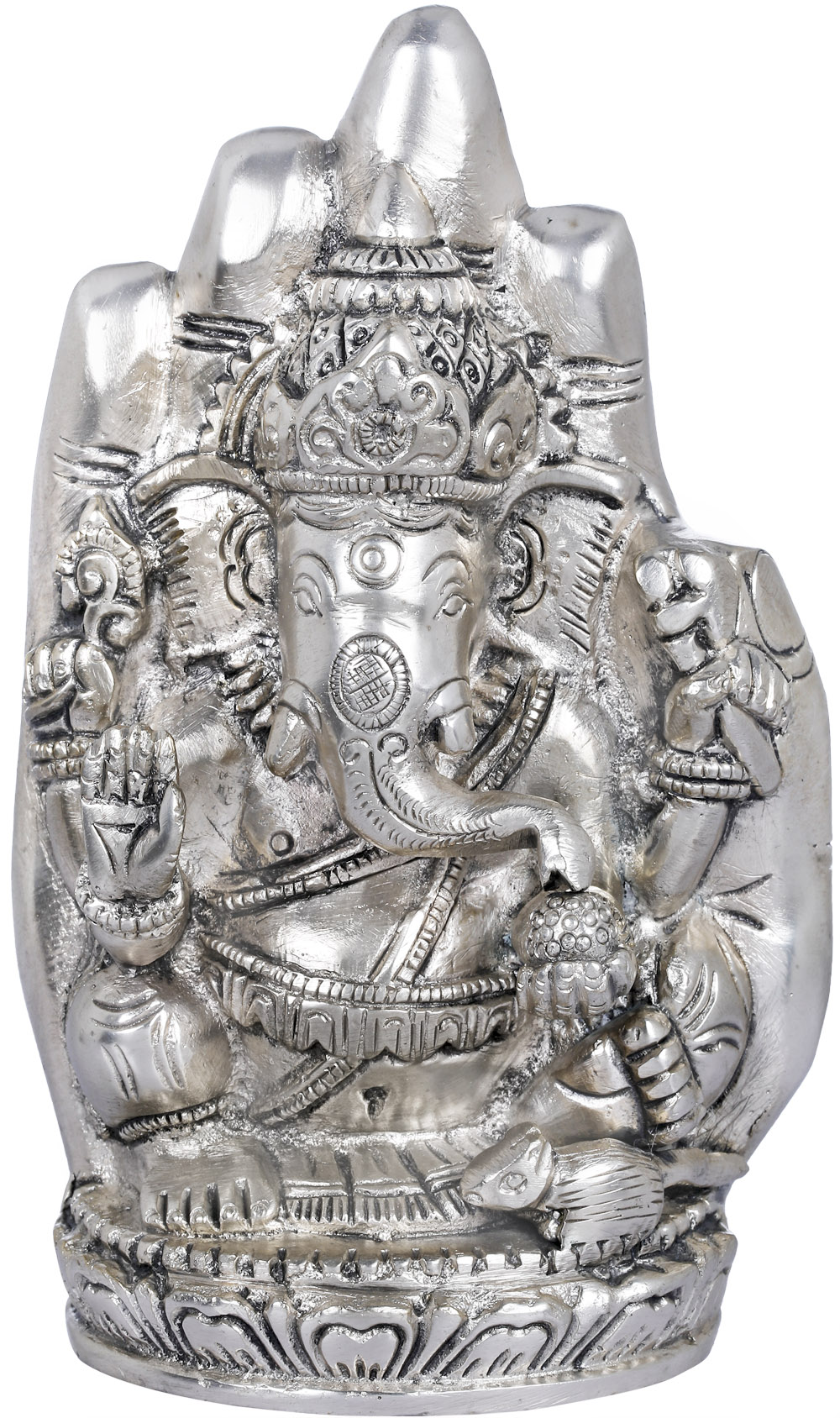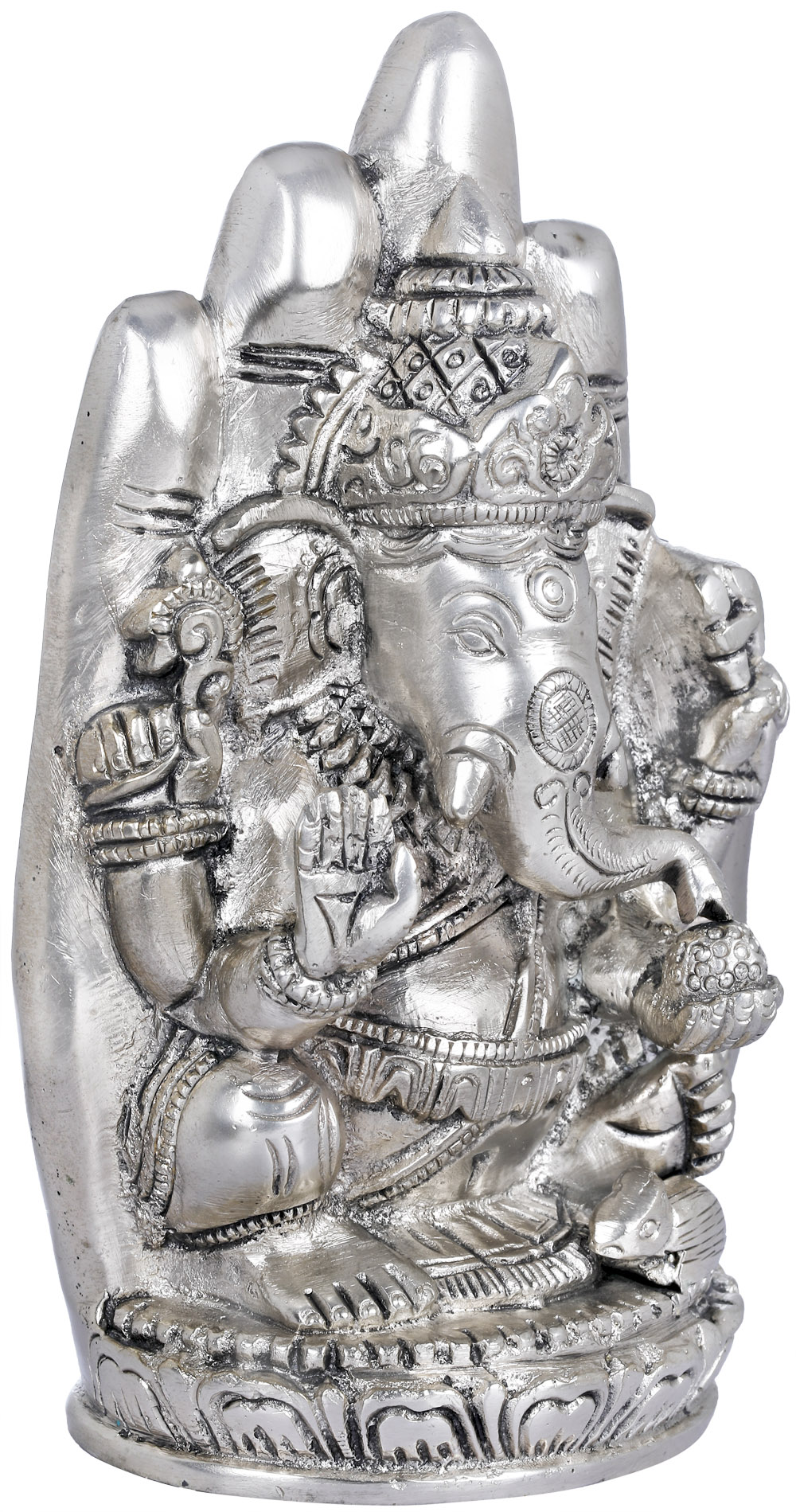 The Abhaya Mudra, represented by the open palm facing outward, signifies protection, fearlessness, and dispelling of all fears. When Lord Ganesha is depicted in the Abhaya Mudra, it assures his devotees of his loving presence, protecting them from harm - his portrayal in the Abhaya Mudra signifies his role as a compassionate and benevolent protector, guiding his devotees on the righteous path with unwavering support; brought to you in premium quality brass.