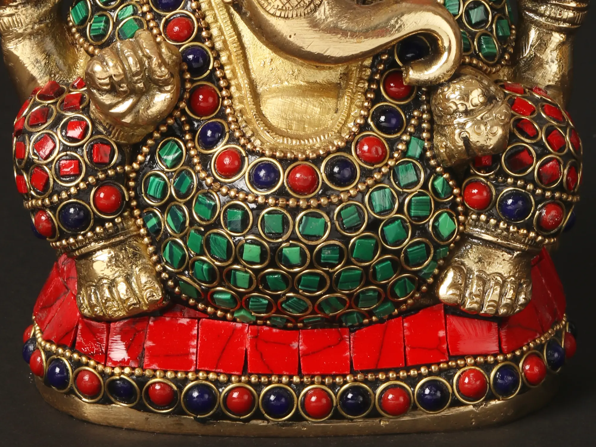 Invite the divine presence of Lord Ganesha into your home with this exquisitely crafted brass statue. Revered as the remover of obstacles and the lord of beginnings, Ganesha is a beloved deity in Hindu tradition, invoked at the start of any new endeavor for good fortune and success. This magnificent representation captures his serene yet powerful form, adorned with vibrant inlay work that speaks to his opulent nature. The skillful craftsmanship of this statue is evident in every detail. Cast in durable brass, it possesses a timeless quality that will grace your space for years to come. The rich golden hue of the metal serves as a perfect canvas for the meticulous inlay work. Deep red stones, symbolizing vitality and passion, are harmoniously blended with the lush green of malachite, a stone associated with healing and transformation, and the deep blue of lapis lazuli, representing wisdom and truth. This symphony of colors, meticulously set within intricate brass borders, creates a visual spectacle that is both captivating and spiritually uplifting. According to mythology, Ganesha is the son of Lord Shiva and Goddess Parvati. His elephantine head symbolizes his immense wisdom and intellect, while his large ears signify his ability to listen attentively to his devotees. His broken tusk, a testament to his sacrifice in writing the Mahabharata, represents overcoming adversity and the power of dedication. Holding his various attributes, such as the axe and the modak (a sweet dumpling), Ganesha embodies the balance between the material and spiritual worlds. This statue, with its detailed rendering of these iconic elements, serves as a constant reminder of his divine blessings. Placing this Ganesha statue in your home or office is believed to usher in prosperity, remove hindrances, and foster an environment of peace and positivity. It makes a truly remarkable gift for loved ones, especially for occasions like housewarmings, birthdays, or festivals like Ganesh Chaturthi. Let the benevolent gaze of this intricately adorned deity illuminate your path and bring auspiciousness to your life.