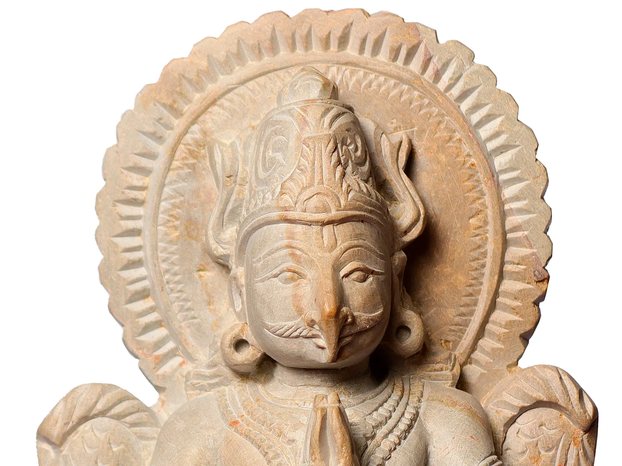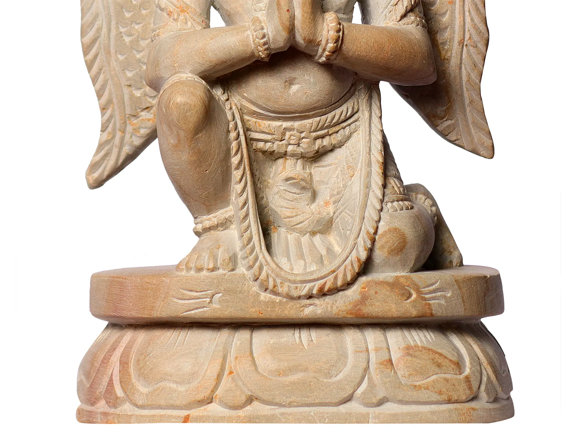 Garuda's depiction in Anjali Mudra carries profound symbolism, illustrating his unwavering devotion and surrender to Lord Vishnu. Garuda in Anjali Mudra represents the path of devotion and selflessness. His divine service as Lord Vishnu's mount exemplifies the importance of being a devoted instrument in the divine plan. His reverence in the Anjali Mudra symbolizes the significance of humility and surrender on the spiritual journey, encouraging seekers to cultivate a sense of gratitude and devotion in their hearts.