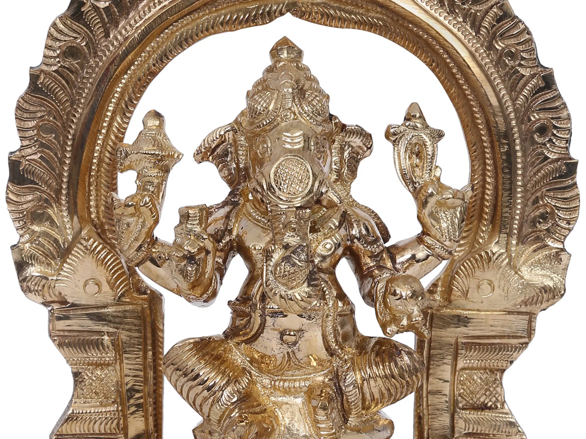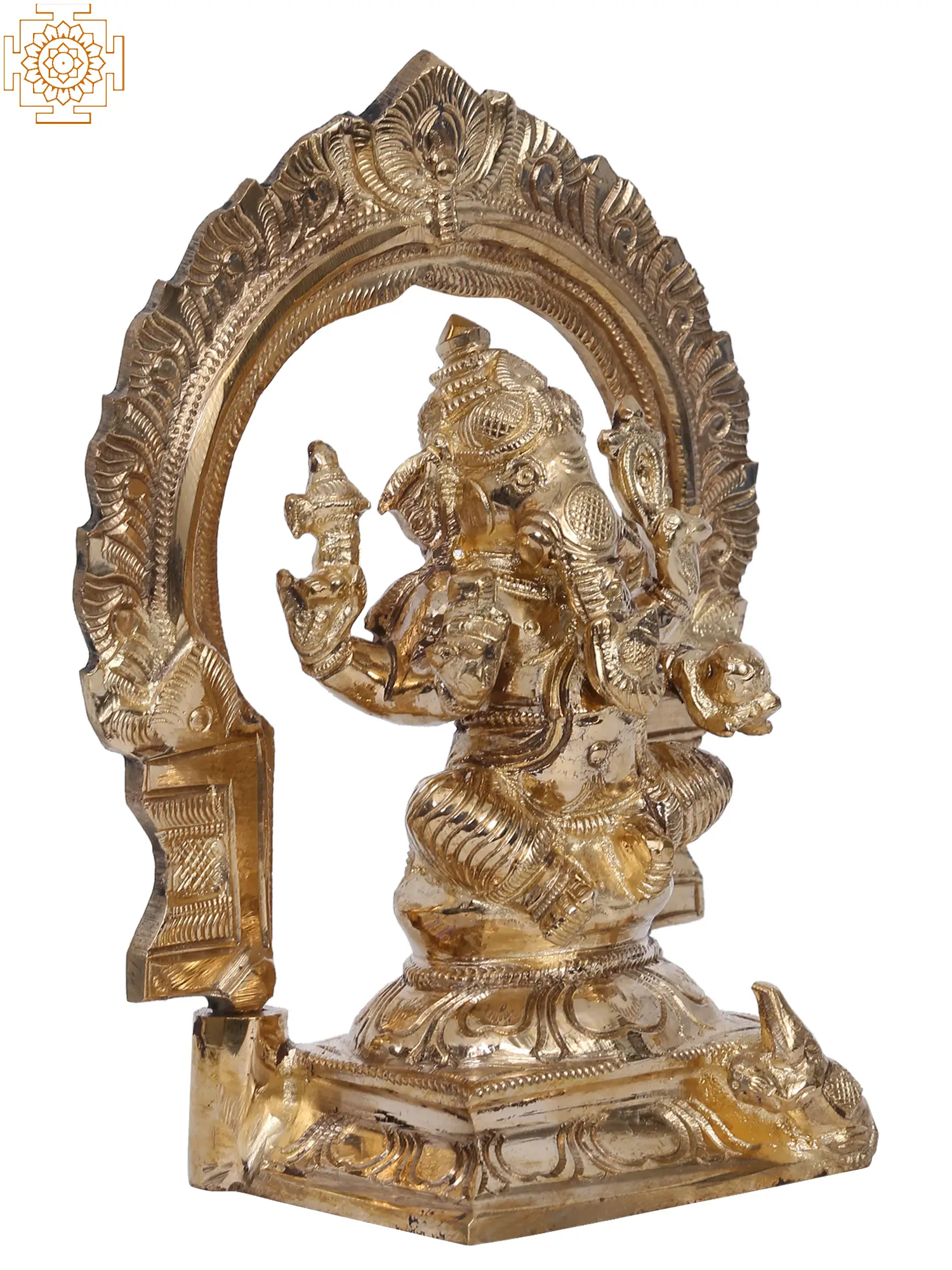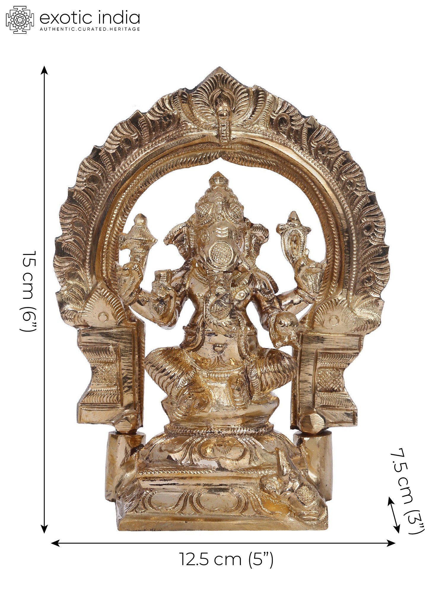 In the divine dance of existence, Lord Ganesha, “the Bestower of fame and good fortune (Yashaskaram) emerges”, seated in the enchanting Utkutakasana upon a lotus pedestal adorned with the fierce Kirtimukha (The Face of Glory). Grace personified, his upper hands wield the “goad (Ankusha) and noose (Pasha)”, steering the cosmic symphony. The broken tusk, a testament to sacrifice, and the Modak cradled in his left hand, symbolise sweet abundance. Cloaked in regal attire, Ganesha embodies auspiciousness. Worshipping this celestial form bestows wisdom, removes obstacles, and grants prosperity. Crafted in Panchaloha bronze from “Swamimalai” using the ancient “Madhuchista Vidhana (Lost-Wax) technique”, this artwork urges devotees to transcend challenges with resilience and savour the nectar of life’s joys.