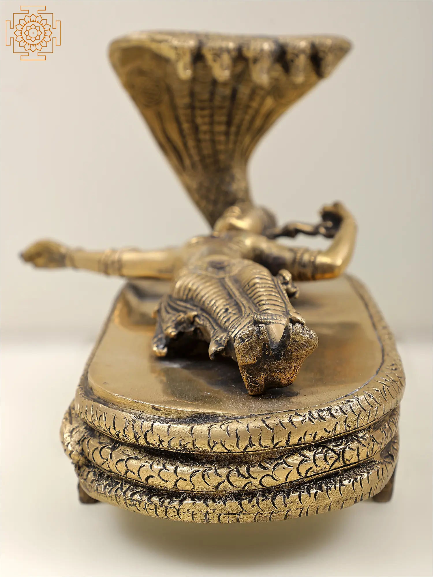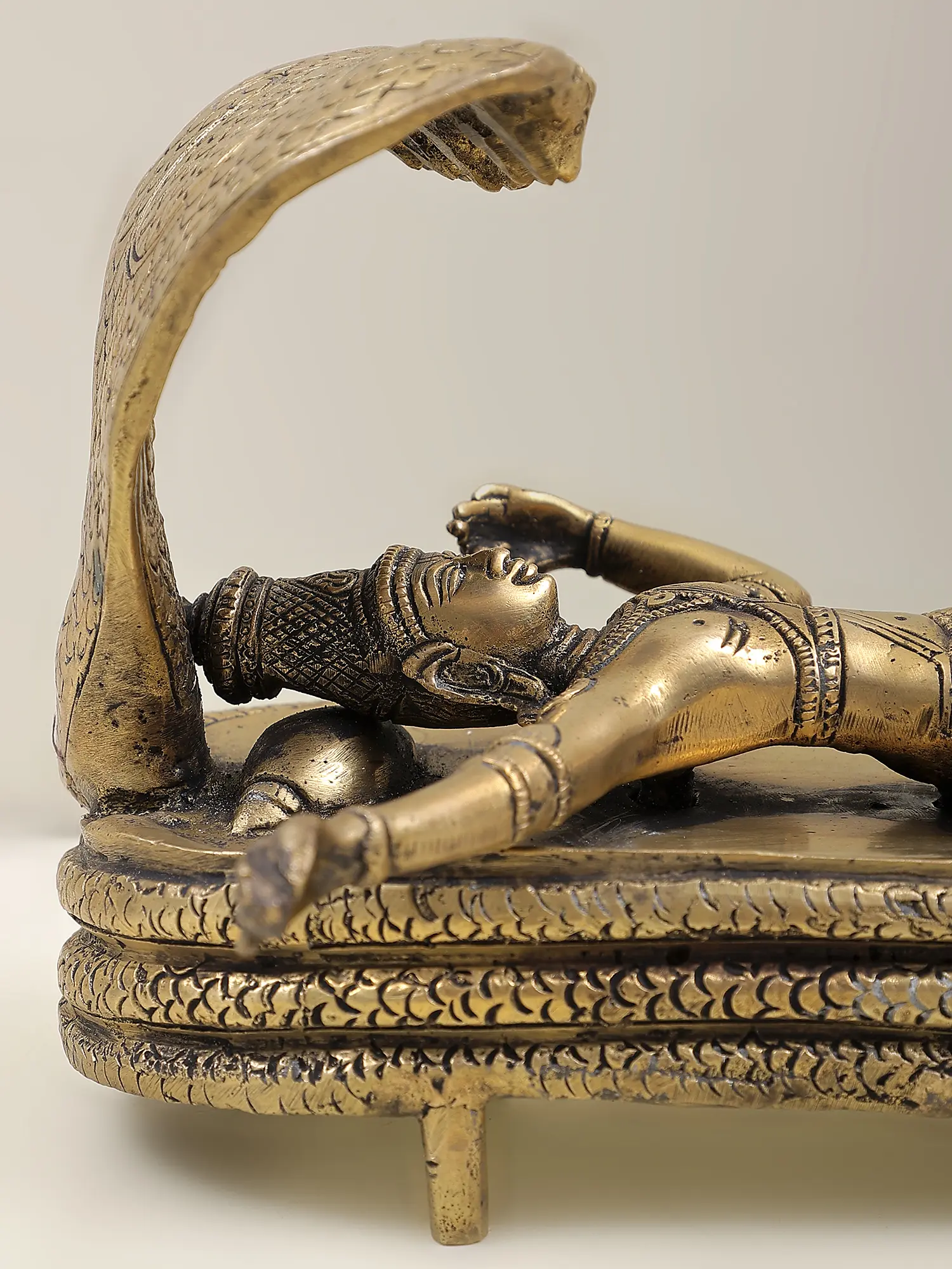 Step into the Vaikuntha as you contemplate the graceful depiction of Lord Ranganatha reclining on Adishesha, the divine serpent. This brass idol exudes serenity, and Lord Ranganatha, an incarnation of Lord Vishnu, is seen resting peacefully on the coils of the mighty serpent, symbolising protection and preservation. The image of Lord Ranganatha on Adishesha captivates devotees with its divine elegance and serves as a reminder of the cosmic harmony and eternal presence of the Divine.