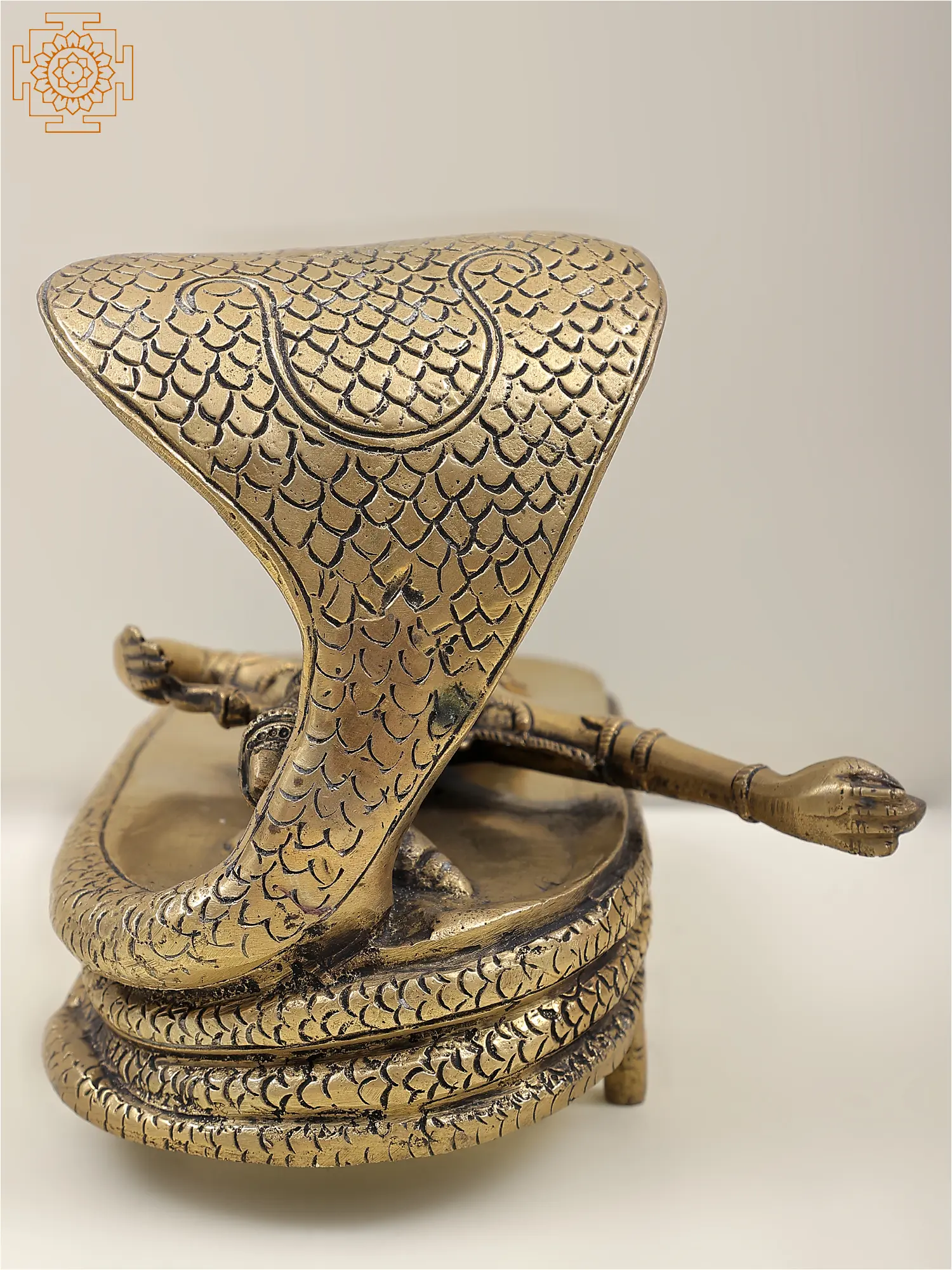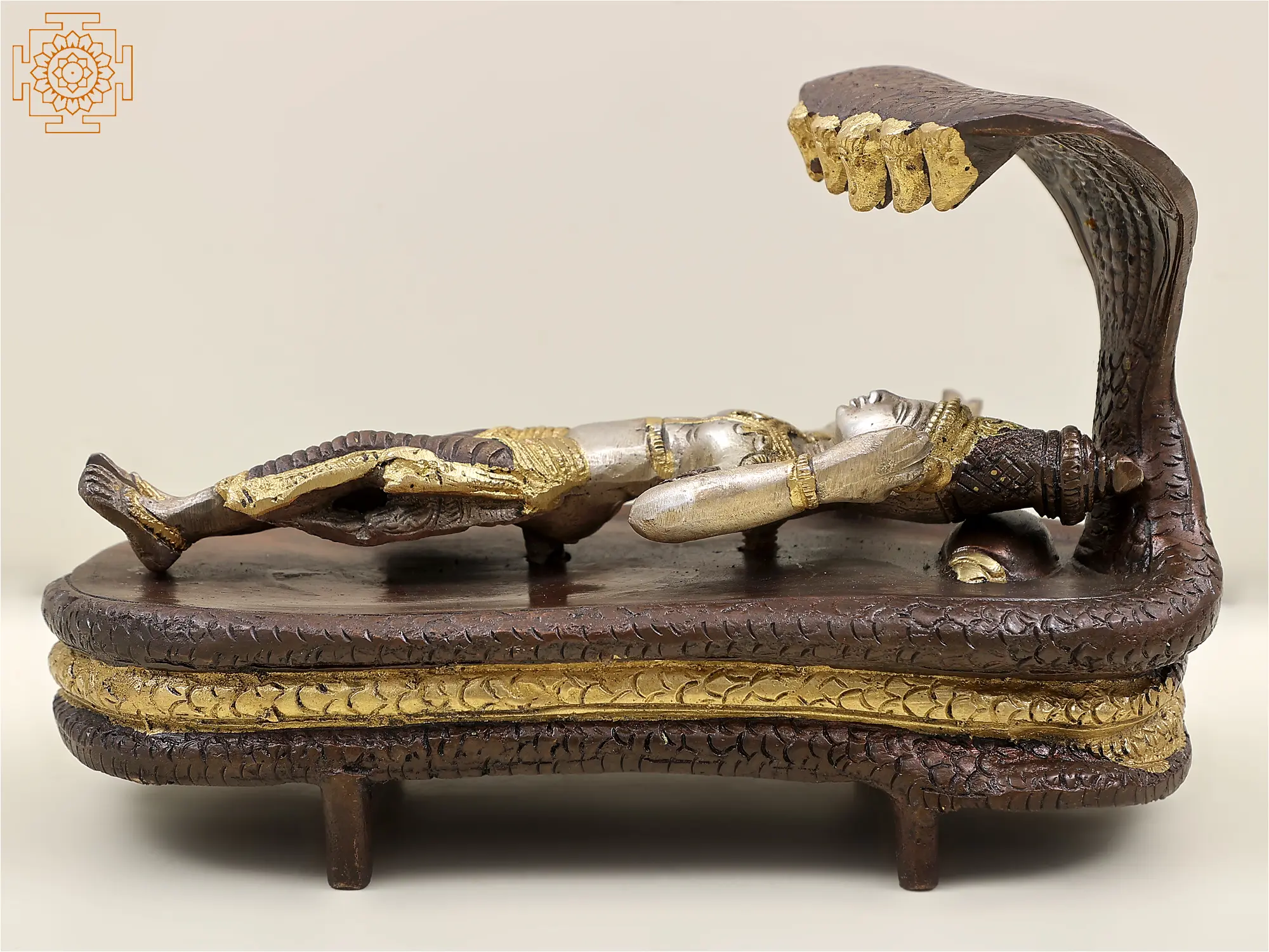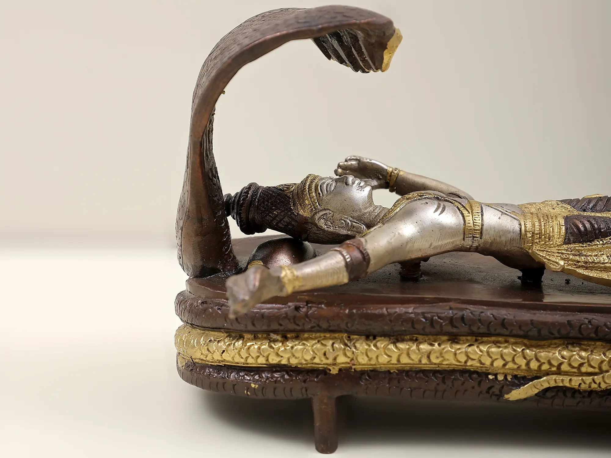 Step into the Vaikuntha as you contemplate the graceful depiction of Lord Ranganatha reclining on Adishesha, the divine serpent. This brass idol exudes serenity, and Lord Ranganatha, an incarnation of Lord Vishnu, is seen resting peacefully on the coils of the mighty serpent, symbolising protection and preservation. The image of Lord Ranganatha on Adishesha captivates devotees with its divine elegance and serves as a reminder of the cosmic harmony and eternal presence of the Divine.