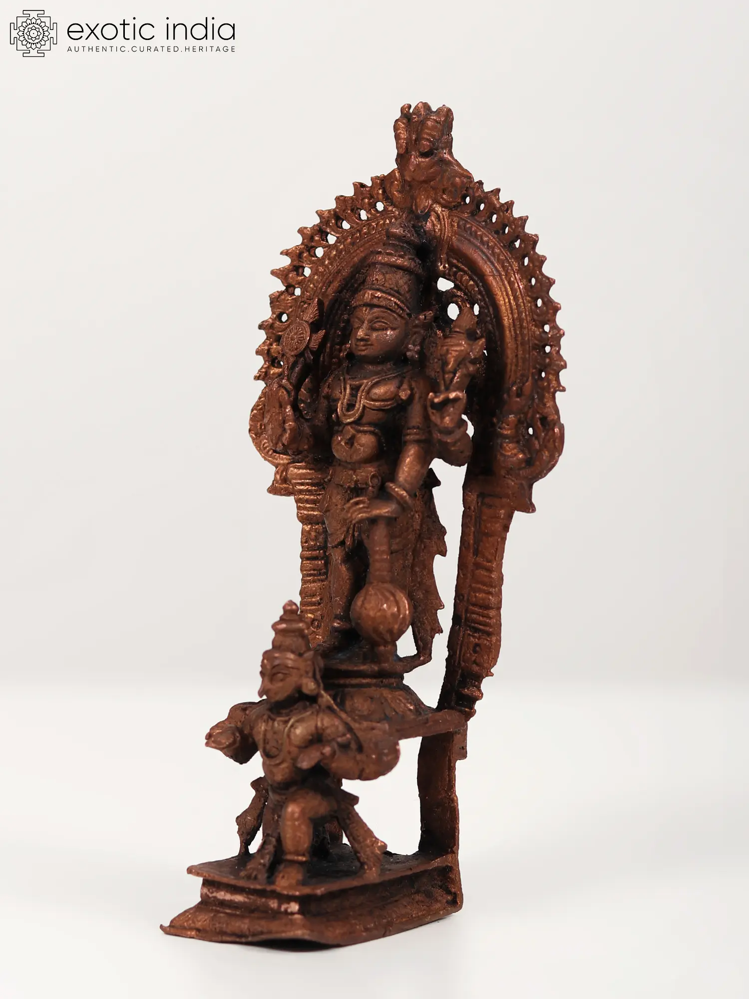 Small copper statues hold a venerable place in Hindu tradition, facilitating daily worship of various deities. The Lord Vishnu Standing on His Vahana Garuda Copper Statue stands as an example, providing a perfect focal point for Lord Vishnu devotees. This small yet captivating statue features Lord Vishnu standing gracefully on the back of his divine mount, Garuda, enclosed within a Kirtimukha Prabhavali.