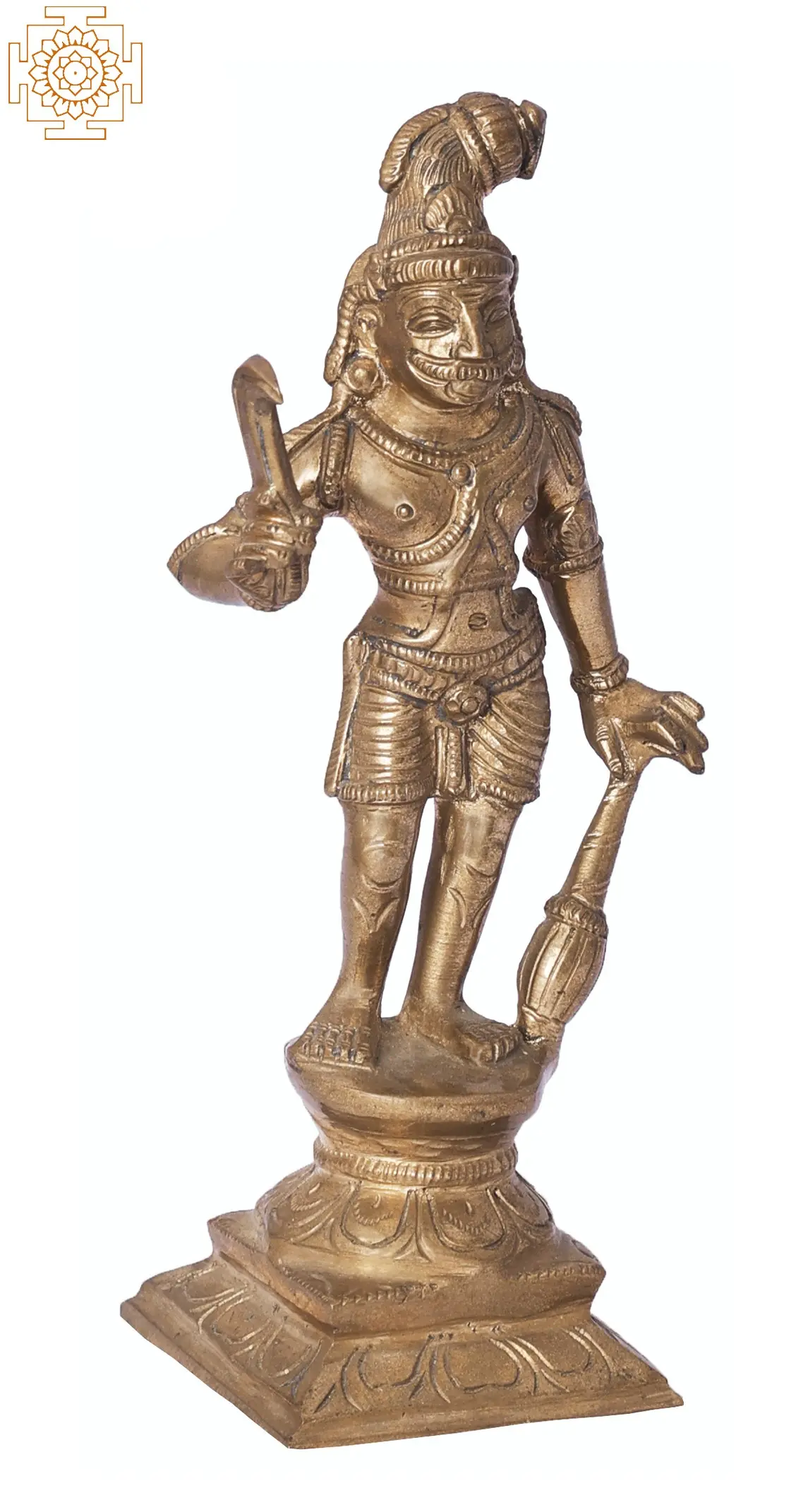 Madurai Veeran was born in a royal family who abandoned him due to a prophecy. The child was adopted by a lower caste family, with whom he grew up to be a brave warrior. His incomparable skills earned him high posts in the royal army and the love of two beautiful young women. But fame also attracts jealousy and trouble. The king under whom Madurai Veeran was appointed, was instigated by a jealous council of ministers, and in a fit of anger, he ordered Veeran’s limbs to be cut off. The fearless warrior embraced his death, but the king was haunted by the horrors of his mindless violence on the great man. In order to undo his sins, he constructed a temple for Madurai Veeran and his wives. As shown in this bronze statue, Madurai Veeran is believed to be always eager and ready to help the dwellers of the city of Madurai.