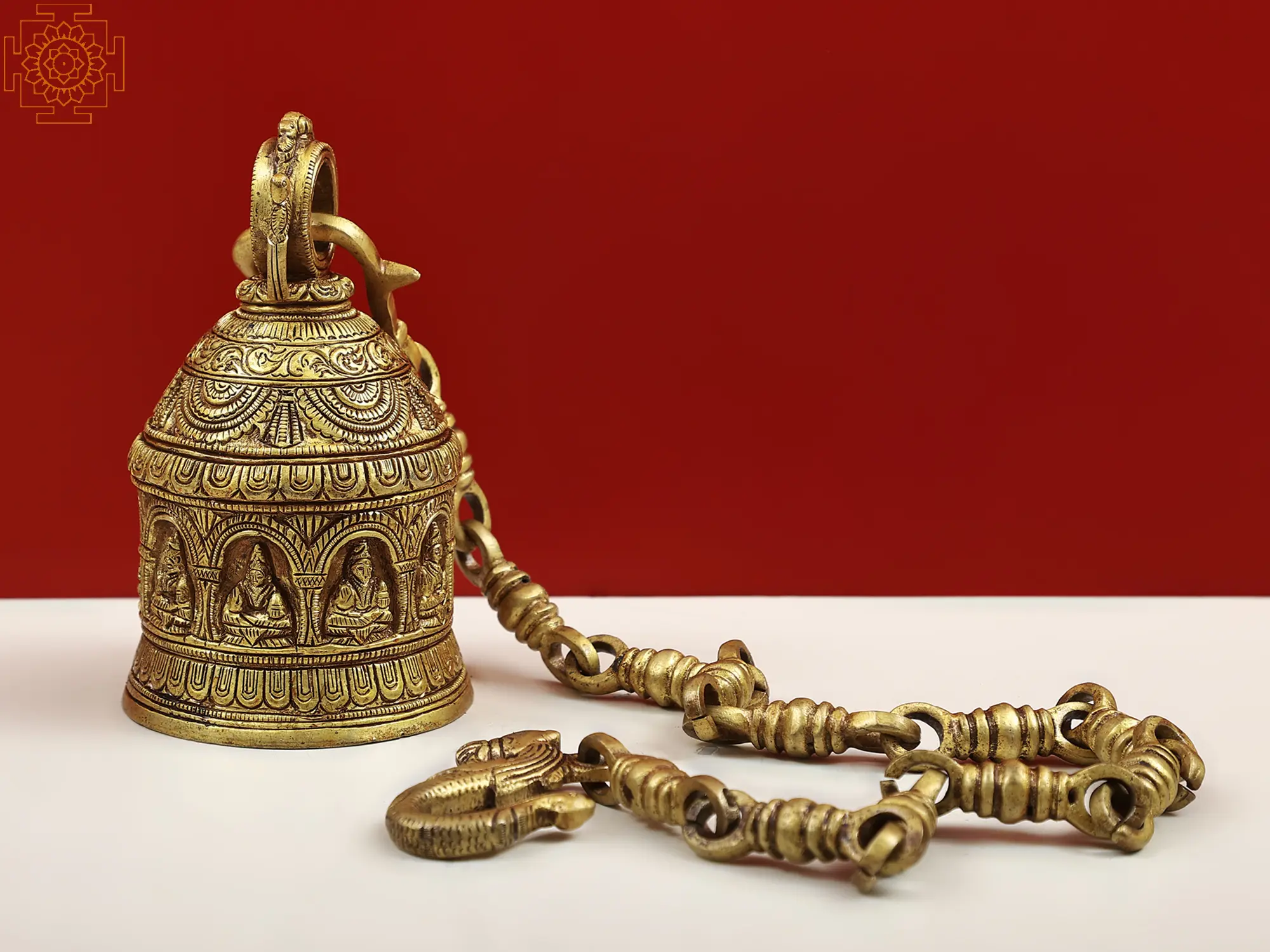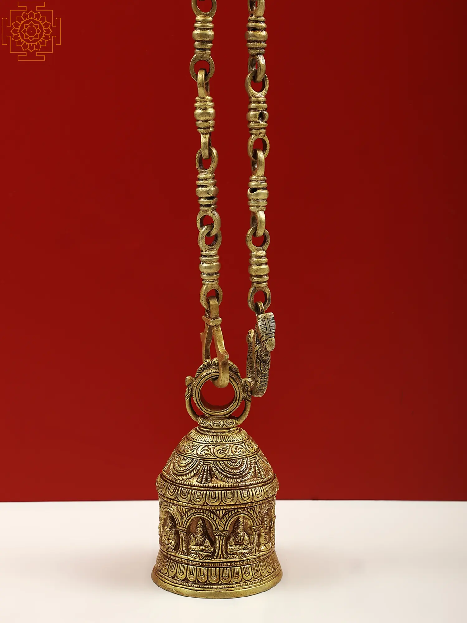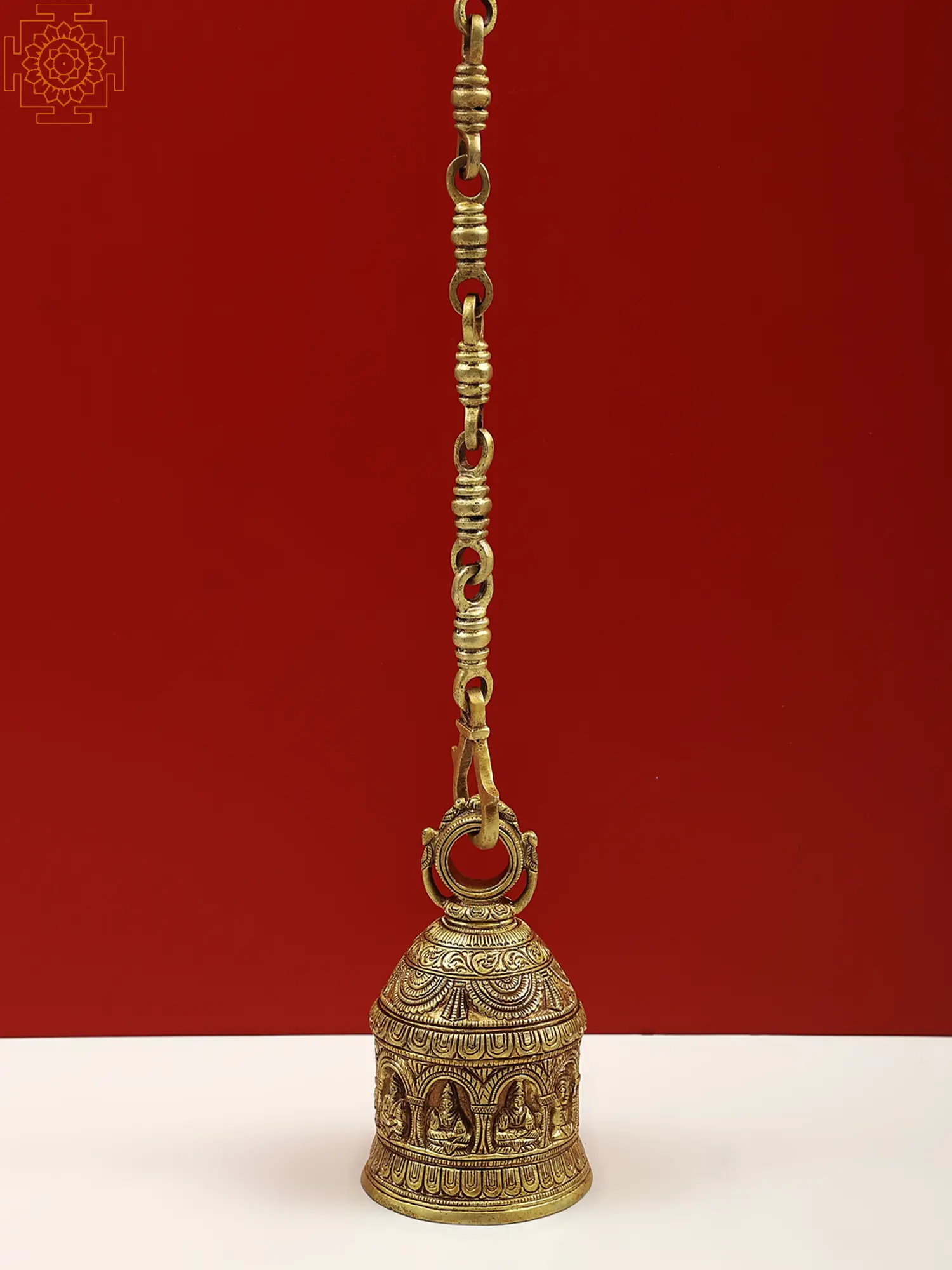 Bring home this one-of-a-kind brass bell devoted to the heavenly deities of Hindu astrology's nine planets. According to Hindu astrology, the Navagraha, which means "nine planets" in Sanskrit, depicts the heavenly deities or cosmic forces that influence human life. Surya (Sun), Chandra (Moon), Mangal (Mars), Budha (Mercury), Guru (Jupiter), Shukra (Venus), Shani (Saturn), Rahu (North Lunar Node), and Ketu (South Lunar Node) are the nine planets. This finely made bell combines the lovely tones of brass with the spiritual meaning of the Navagrahas to create a potent symbol of cosmic alignment and blessings.