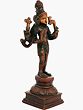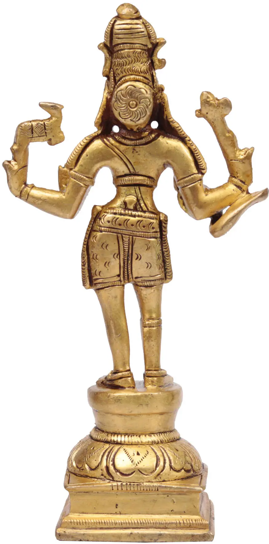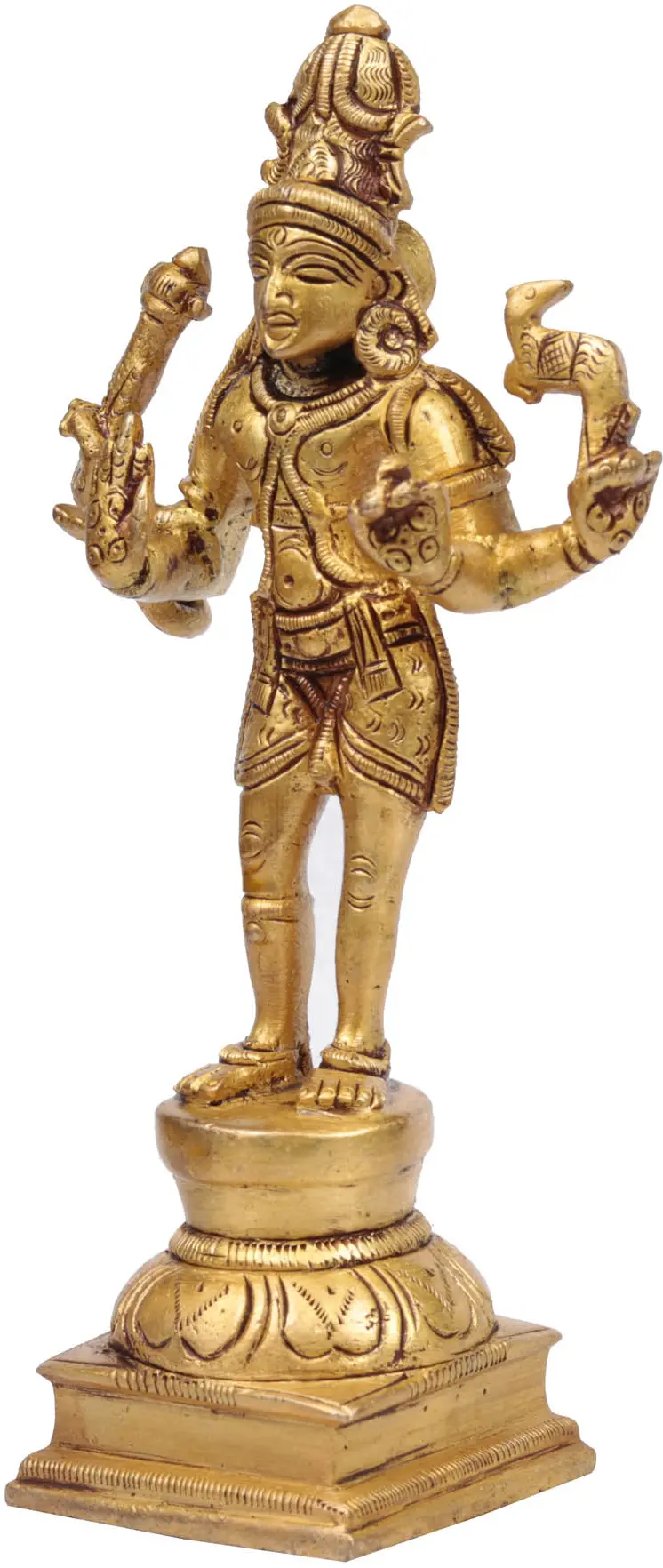 According to legends, Pashupatinath is an incarnation of Lord Shiva. He is also known as the “Lord of animals”. In this sculpture, Lord Pashupati has been depicted in Abhaya Mudra (gesture of fearlessness), signifying his role as the protector and provider of divine assurance. In his right hand, he is carrying a goad (Ankusha) symbolising his power to guide and control his devotees on the path of righteousness. In his left hand, Pashupati carries a deer, representing his compassionate and caring nature towards animals. Lord Pashupati is adorned with celestial ornaments, symbolising his status as the cosmic ruler and the lord of all creatures. Meticulously crafted in brass, this masterpiece is a perfect fit for altars and sacred spaces, radiating spiritual energy and blessings.